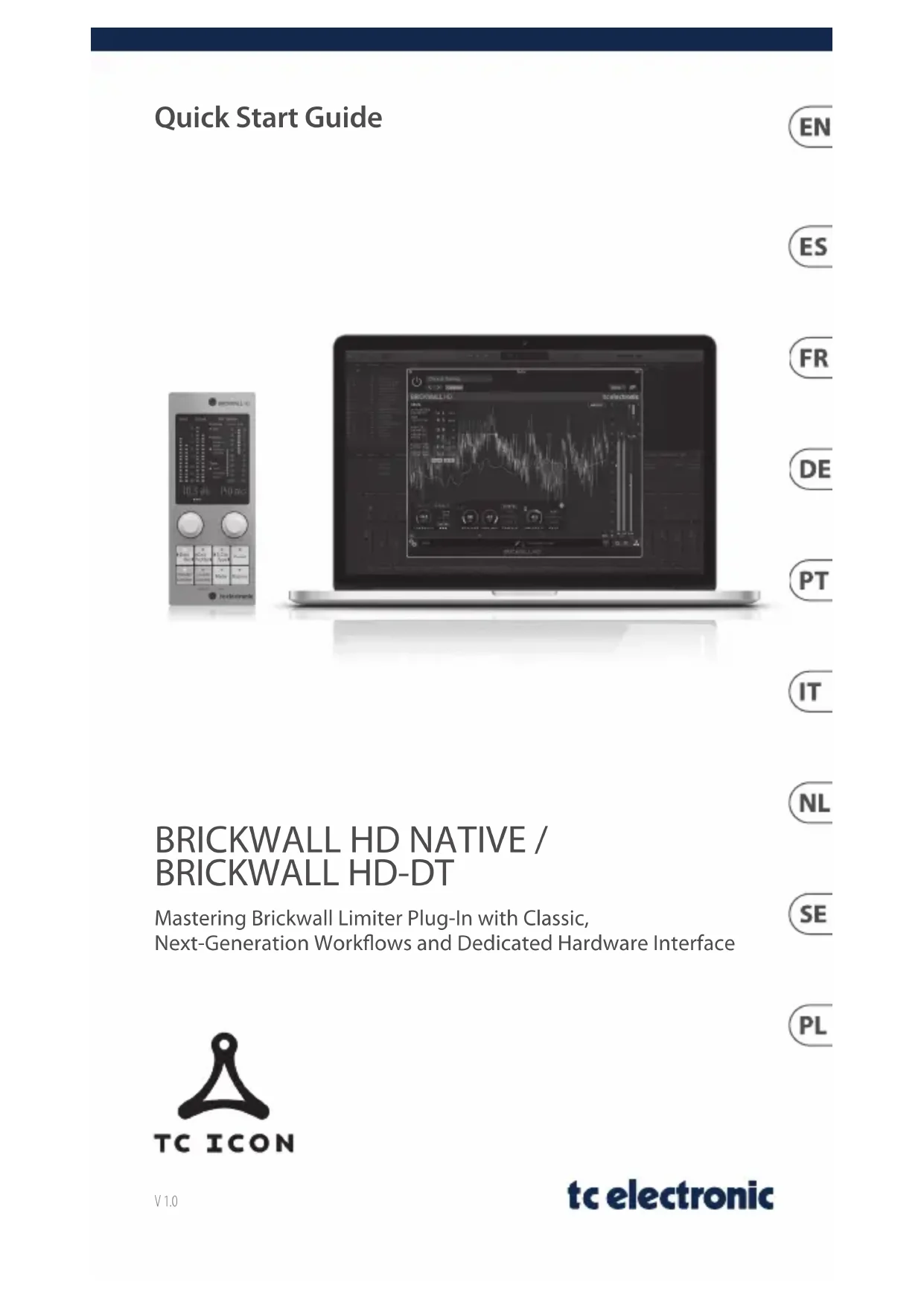 - Es probable que el complemento se encuentre en una carpeta dedicada de TC Electronic. Seleccione BRICKWALL HD y ahora se agregará a la cadena de señal. Haga doble clic en la ranura de efectos que contiene BRICKWALL HD para ver la interfaz de usuario del complemento. Debe haber un icono de enlace verde en la parte inferior y un texto que indique que la conexión entre el complemento y el controlador de escritorio se ha realizado correctamente. Manejo del BRICKWALL HD Después de haber instalado el complemento, activado la licencia iLok y, opcionalmente, conectado el controlador de escritorio BRICKWALL HD-DT a través de USB, puede comenzar a insertar el complemento en sus pistas. Los ajustes del efecto se realizan de dos formas. Ya sea mediante el uso de la interfaz de usuario del complemento o mediante el controlador de escritorio físico. [Consulte la página 23 para ver la imagen] Descargue el manual de usuario completo de www.tcelectronic.com/brickwallhd-dt/ support/ para conocer todos los detalles tanto del complemento como de la funcionalidad del controlador de escritorio.18 BRICKWALL HD 19Quick Start Guide Merci d'avoir acheté le BRICKWALL HD True-Peak Limiter. Lisez ce guide de démarrage rapide pour congurer les choses et n'oubliez pas de télécharger le manuel complet sur tcelectronic.com pour toutes les explications détaillées. Téléchargement et installation du logiciel Le programme d'installation combiné du plug-in BRICKWALL HD pour les produits NATIVE et DT Desktop Controller peut être téléchargé à partir de la page suivante: www.tcelectronic.com/brickwallhd-dt/support/ Le plug-in BRICKWALL HD nécessite une licence PACE iLok active pour fonctionner. L'utilisation du Desktop Controller est facultative et tous les paramètres sont disponibles dans le plug-in. Enregistrez le chier d'installation (chier .pkg ou .msi) dans un emplacement pratique sur votre disque dur. Double-cliquez sur le programme d'installation et suivez les instructions pour installer le plug-in. [Veuillez voir la page 20 pour l'image] Activez votre licence BRICKWALL HD iLok Étape 1: Installez iLok La première étape consiste à créer un compte utilisateur iLok sur www.iLok.com et à installer PACE iLok License Manager sur votre ordinateur si c'est la première fois que vous utilisez iLok. Étape 2: Activation Dans le courrier reçu (lors de l'achat de la version NATIVE) ou au dos de ce document imprimé (lorsque vous avez acheté la version DT Desktop Controller), vous trouverez votre code d'activation personnel. Pour activer votre logiciel, veuillez utiliser la fonction Utiliser un code d'activation dans PACE iLok License Manager. [Veuillez voir la page 21 pour l'image] Obtenez une licence de démonstration gratuite Protez de cette ore sans tracas pour essayer nos plug-ins avant d'acheter.