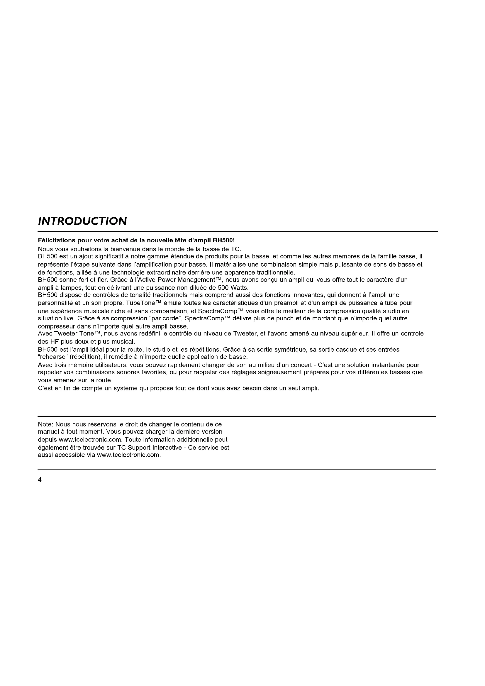 Note: Nous nous réservons le droit de changer le contenu de ce manuel à tout moment. Vous pouvez charger la dernière version depuis www.tcelectronic.com. Toute information additionnelle peut également être trouvée sur TC Support Interactive - Ce service est aussi accessible via www.tcelectronic.com. Félicitations pour votre achat de la nouvelle tête d’ampli BH500! Nous vous souhaitons la bienvenue dans le monde de la basse de TC. BH500 est un ajout significatif à notre gamme étendue de produits pour la basse, et comme les autres membres de la famille basse, il représente l’étape suivante dans l’amplification pour basse. Il matérialise une combinaison simple mais puissante de sons de basse et de fonctions, alliée à une technologie extraordinaire derrière une apparence traditionnelle. BH500 sonne fort et fier. Grâce à l’Active Power Management™, nous avons conçu un ampli qui vous offre tout le caractère d’un ampli à lampes, tout en délivrant une puissance non diluée de 500 Watts. BH500 dispose de contrôles de tonalité traditionnels mais comprend aussi des fonctions innovantes, qui donnent à l’ampli une personnalité et un son propre. TubeTone™ émule toutes les caractéristiques d’un préampli et d’un ampli de puissance à tube pour une expérience musicale riche et sans comparaison, et SpectraComp™ vous offre le meilleur de la compression qualité studio en situation live. Grâce à sa compression “par corde”, SpectraComp™ délivre plus de punch et de mordant que n’importe quel autre compresseur dans n’importe quel autre ampli basse. Avec Tweeter Tone™, nous avons redéfini le contrôle du niveau de Tweeter, et l’avons amené au niveau supérieur. Il offre un controle des HF plus doux et plus musical. BH500 est l’ampli idéal pour la route, le studio et les répétitions. Grâce à sa sortie symétrique, sa sortie casque et ses entrées “rehearse” (répétition), il remédie à n’importe quelle application de basse. Avec trois mémoire utilisateurs, vous pouvez rapidement changer de son au milieu d’un concert - C’est une solution instantanée pour rappeler vos combinaisons sonores favorites, ou pour rappeler des réglages soigneusement préparés pour vos différentes basses que vous amenez sur la route C’est en fin de compte un système qui propose tout ce dont vous avez besoin dans un seul ampli.FR Si vous ne pouvez vraiment pas attendre... Voici quelques étapes rapides pour que vous puissiez démarrer à jouer en quelques minutes. Déballage