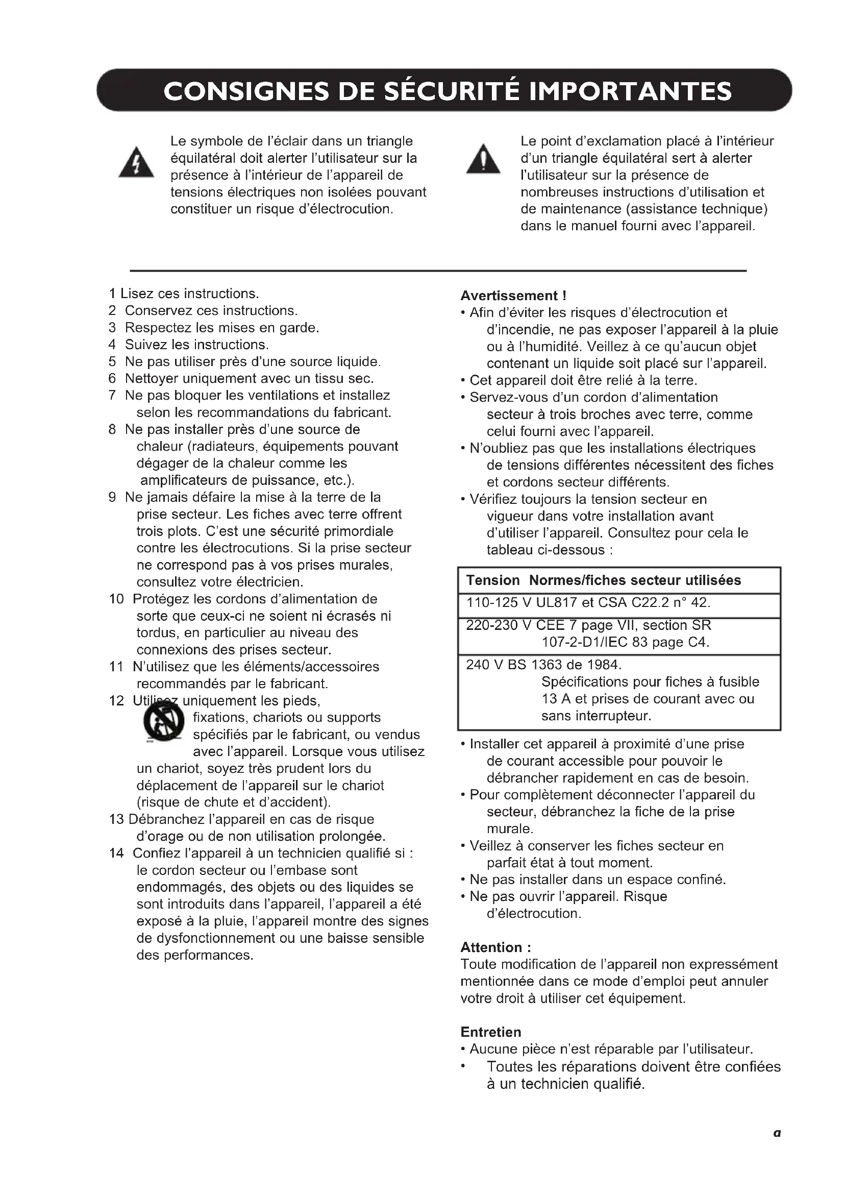 XO24 SPEAKER MANAGEMENT CONTROLLER MODE D’EMPLOIa 1 Lisez ces instructions. 2 Conservez ces instructions. 3 Respectez les mises en garde. 4 Suivez les instructions. 5 Ne pas utiliser près d’une source liquide. 6 Nettoyer uniquement avec un tissu sec. 7 Ne pas bloquer les ventilations et installez selon les recommandations du fabricant. 8 Ne pas installer près d’une source de chaleur (radiateurs, équipements pouvant dégager de la chaleur comme les amplificateurs de puissance, etc.). 9 Ne jamais défaire la mise à la terre de la prise secteur. Les fiches avec terre offrent trois plots. C’est une sécurité primordiale contre les électrocutions. Si la prise secteur ne correspond pas à vos prises murales, consultez votre électricien. 10 Protégez les cordons d’alimentation de sorte que ceux-ci ne soient ni écrasés ni tordus, en particulier au niveau des connexions des prises secteur. 11 N’utilisez que les éléments/accessoires recommandés par le fabricant. 12 Utilisez uniquement les pieds, fixations, chariots ou supports spécifiés par le fabricant, ou vendus avec l’appareil. Lorsque vous utilisez un chariot, soyez très prudent lors du déplacement de l’appareil sur le chariot (risque de chute et d’accident). 13 Débranchez l’appareil en cas de risque d’orage ou de non utilisation prolongée. 14 Confiez l’appareil à un technicien qualifié si : le cordon secteur ou l’embase sont endommagés, des objets ou des liquides se sont introduits dans l’appareil, l’appareil a été exposé à la pluie, l’appareil montre des signes de dysfonctionnement ou une baisse sensible des performances.