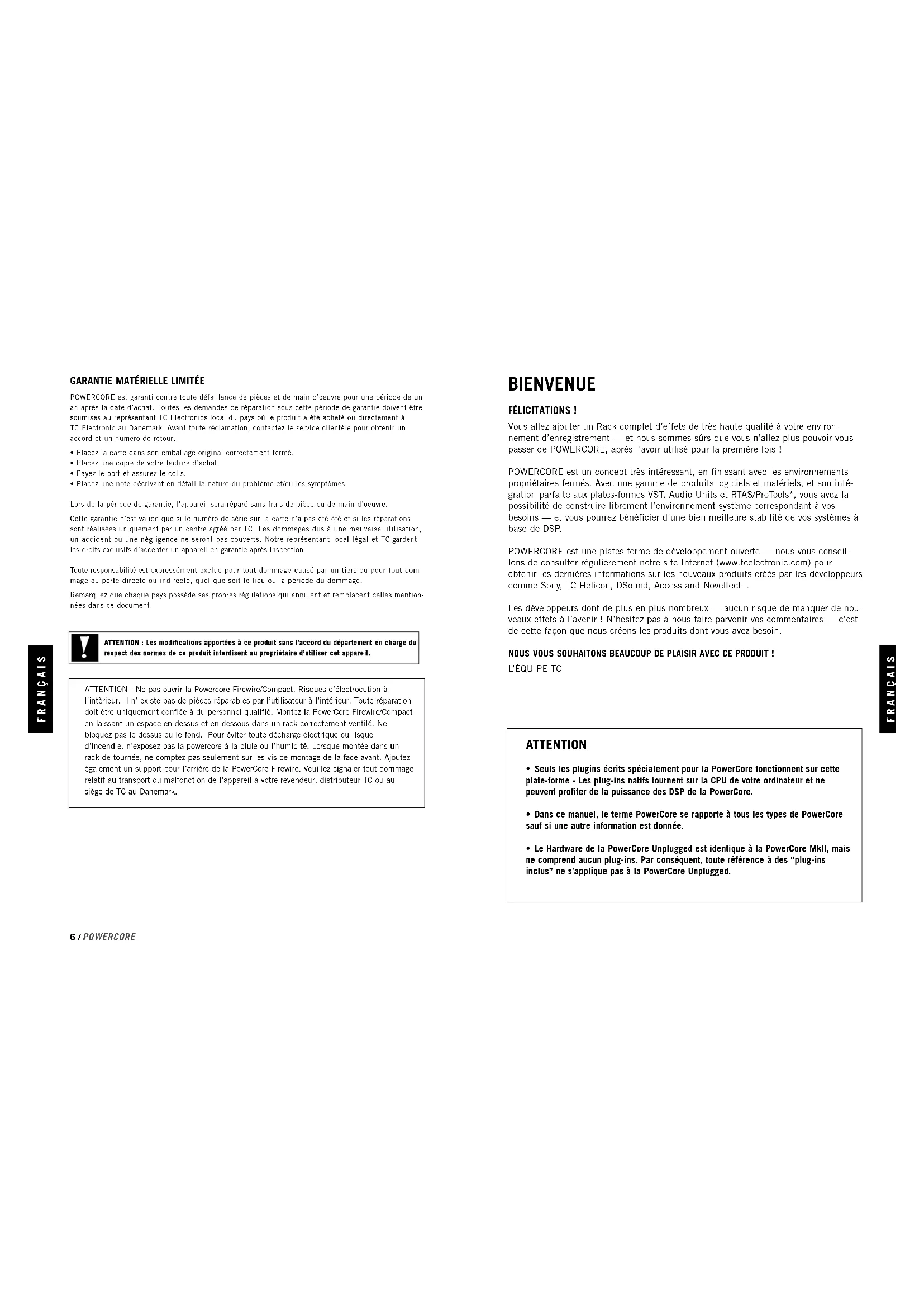 Customer Support Sindalsvej 34 Risskov DK-8240 Denmark www.tcelectronic.com www.tcsupport.tc USA: TC Electronic Inc. TC Works Customer Support 5706 Corsa Avenue, Suite 107 Westlake Village, CA 91362 www.tcelectronic.com www.tcsupport.tc SUPPORT TECHNIQUE Pour obtenir de nombreuses réponses immédiates concernant le support, visitez les pages de TC SUPPORT INTERACTIVE pages sur www.tcsupport.tcGARANTIE MATÉRIELLE LIMITÉE POWERCORE est garanti contre toute défaillance de pièces et de main d’oeuvre pour une période de unan après la date d’achat. Toutes les demandes de réparation sous cette période de garantie doivent êtresoumises au représentant TC Electronics local du pays où le produit a été acheté ou directement à TC Electronic au Danemark. Avant toute réclamation, contactez le service clientèle pour obtenir unaccord et un numéro de retour. • Placez la carte dans son emballage original correctement fermé.• Placez une copie de votre facture d’achat.• Payez le port et assurez le colis. • Placez une note décrivant en détail la nature du problème et/ou les symptômes.Lors de la période de garantie, l’appareil sera réparé sans frais de pièce ou de main d’oeuvre. Cette garantie n’est valide que si le numéro de série sur la carte n’a pas été ôté et si les réparations sont réalisées uniquement par un centre agréé par TC. Les dommages dus à une mauvaise utilisation, un accident ou une négligence ne seront pas couverts. Notre représentant local légal et TC gardent les droits exclusifs d’accepter un appareil en garantie après inspection. Toute responsabilité est expressément exclue pour tout dommage causé par un tiers ou pour tout dom- mage ou perte directe ou indirecte, quel que soit le lieu ou la période du dommage. Remarquez que chaque pays possède ses propres régulations qui annulent et remplacent celles mention-nées dans ce document. AATTTTEENNTTIIOONN :: LLeess mmooddiiffiiccaattiioonnss aappppoorrttééeess àà ccee pprroodduuiitt ssaannss ll’’aaccccoorrdd dduu ddééppaarrtteemmeenntt eenn cchhaarrggee dduu rreessppe ecctt ddeess nnoorrmmeess ddee ccee pprroodduuiitt iinntteerrddiisseenntt aauu pprroopprriiééttaaiirree dd’’uuttiilliisseerr cceett aappppaarreeiill.. FF RR AA NN ÇÇ AA II SS