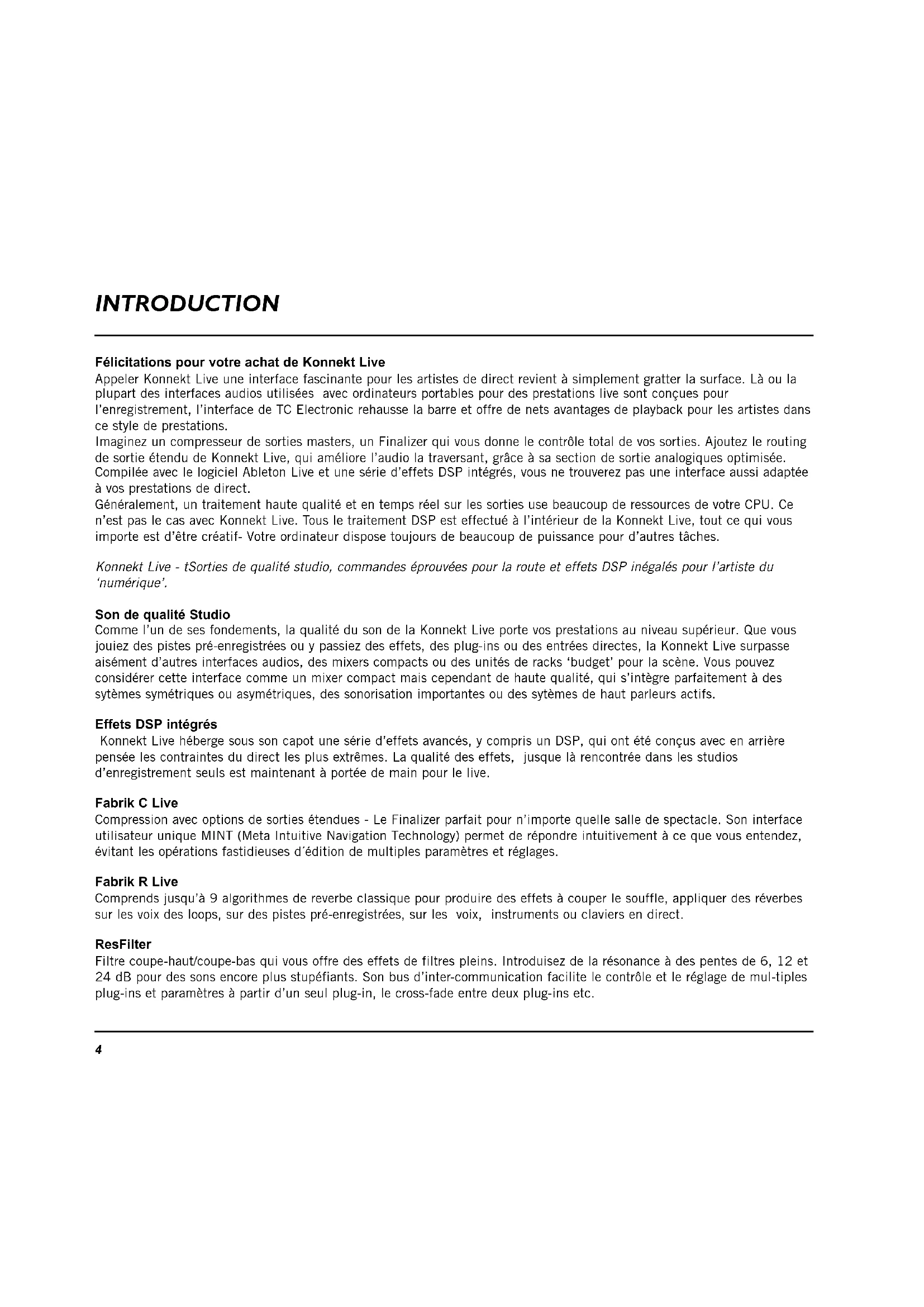 INTRODUCTION Félicitations pour votre achat de Konnekt Live Appeler Konnekt Live une interface fascinante pour les artistes de direct revient à simplement gratter la surface. Là ou la plupart des interfaces audios utilisées avec ordinateurs portables pour des prestations live sont conçues pour l’enregistrement, l’interface de TC Electronic rehausse la barre et offre de nets avantages de playback pour les artistes dans ce style de prestations. Imaginez un compresseur de sorties masters, un Finalizer qui vous donne le contrôle total de vos sorties. Ajoutez le routing de sortie étendu de Konnekt Live, qui améliore l’audio la traversant, grâce à sa section de sortie analogiques optimisée. Compilée avec le logiciel Ableton Live et une série d’effets DSP intégrés, vous ne trouverez pas une interface aussi adaptée à vos prestations de direct. Généralement, un traitement haute qualité et en temps réel sur les sorties use beaucoup de ressources de votre CPU. Ce n’est pas le cas avec Konnekt Live. Tous le traitement DSP est effectué à l’intérieur de la Konnekt Live, tout ce qui vous importe est d’être créatif- Votre ordinateur dispose toujours de beaucoup de puissance pour d’autres tâches. Konnekt Live - tSorties de qualité studio, commandes éprouvées pour la route et effets DSP inégalés pour l’artiste du ‘numérique’. Son de qualité Studio Comme l’un de ses fondements, la qualité du son de la Konnekt Live porte vos prestations au niveau supérieur. Que vous jouiez des pistes pré-enregistrées ou y passiez des effets, des plug-ins ou des entrées directes, la Konnekt Live surpasse aisément d’autres interfaces audios, des mixers compacts ou des unités de racks ‘budget’ pour la scène. Vous pouvez considérer cette interface comme un mixer compact mais cependant de haute qualité, qui s’intègre parfaitement à des sytèmes symétriques ou asymétriques, des sonorisation importantes ou des sytèmes de haut parleurs actifs. Effets DSP intégrés Konnekt Live héberge sous son capot une série d’effets avancés, y compris un DSP, qui ont été conçus avec en arrière pensée les contraintes du direct les plus extrêmes. La qualité des effets, jusque là rencontrée dans les studios d’enregistrement seuls est maintenant à portée de main pour le live. Fabrik C Live Compression avec options de sorties étendues - Le Finalizer parfait pour n’importe quelle salle de spectacle. Son interface utilisateur unique MINT (Meta Intuitive Navigation Technology) permet de répondre intuitivement à ce que vous entendez, évitant les opérations fastidieuses d´édition de multiples paramètres et réglages. Fabrik R Live Comprends jusqu’à 9 algorithmes de reverbe classique pour produire des effets à couper le souffle, appliquer des réverbes sur les voix des loops, sur des pistes pré-enregistrées, sur les voix, instruments ou claviers en direct. ResFilter Filtre coupe-haut/coupe-bas qui vous offre des effets de filtres pleins. Introduisez de la résonance à des pentes de 6, 12 et 24 dB pour des sons encore plus stupéfiants. Son bus d’inter-communication facilite le contrôle et le réglage de mul-tiples plug-ins et paramètres à partir d’un seul plug-in, le cross-fade entre deux plug-ins etc.5