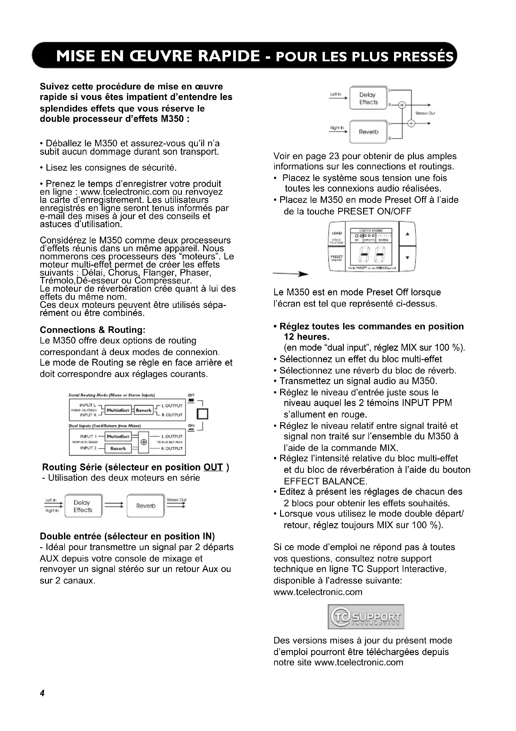 - Prenez le temps d’enregistrer votre produit en ligne : www.tcelectronic.com ou renvoyez la carte d’enregistrement. Les utilisateurs enregistrés en ligne seront tenus informés par e-mail des mises à jour et des conseils et astuces d’utilisation. Considérez le M350 comme deux processeurs d’effets réunis dans un même appareil. Nous nommerons ces processeurs des “moteurs”. Le moteur multi-effet permet de créer les effets suivants : Délai, Chorus, Flanger, Phaser, Trémolo,Dé-esseur ou Compresseur. Le moteur de réverbération crée quant à lui des effets du même nom. Ces deux moteurs peuvent être utilisés sépa- rément ou être combinés. Connections & Routing: Le M350 offre deux options de routing correspondant à deux modes de connexion. Le mode de Routing se règle en face arrière et doit correspondre aux réglages courants. Routing Série (sélecteur en position OUT