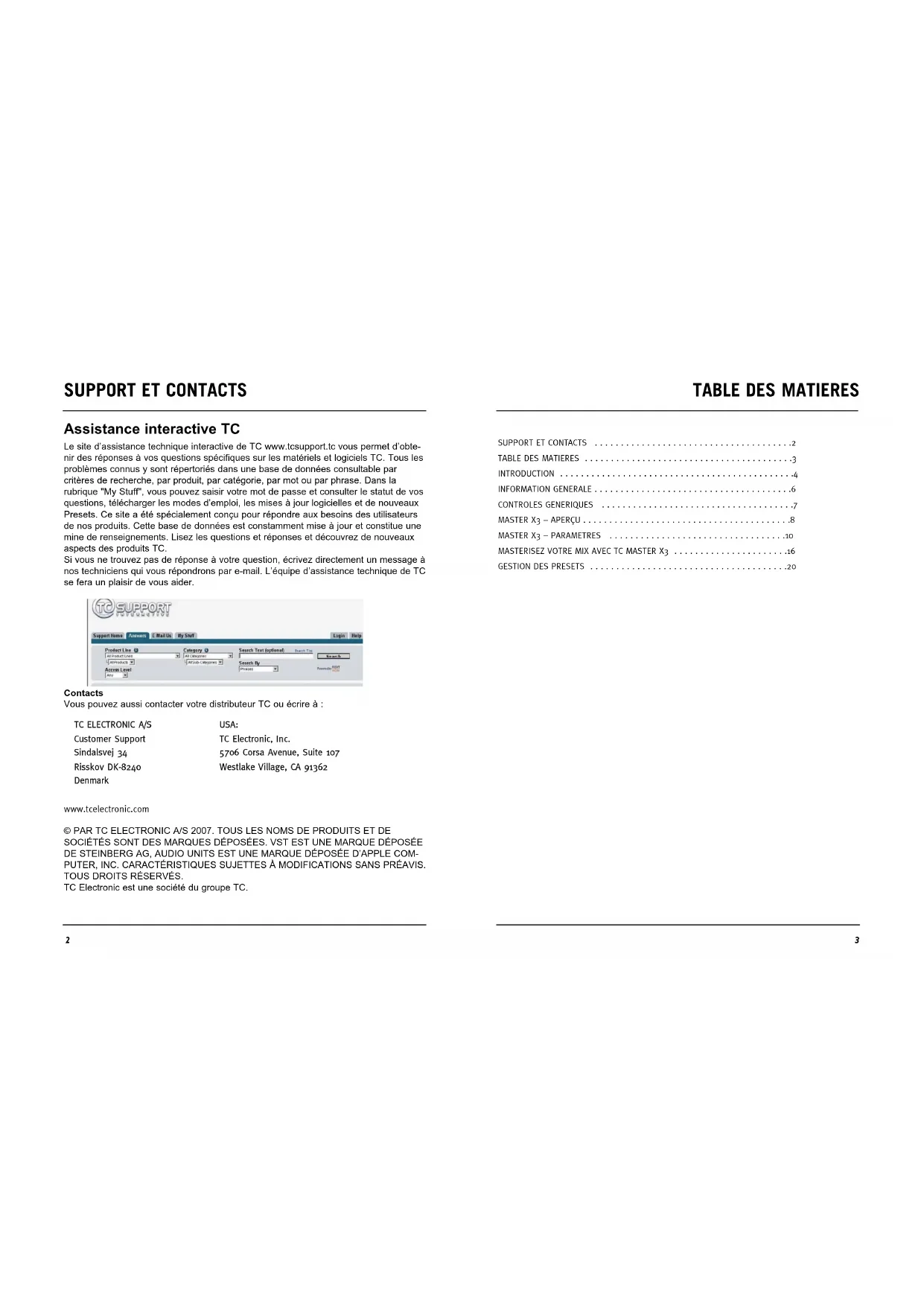 Assistance interactive TC Le site d’assistance technique interactive de TC www.tcsupport.tc vous permet d’obte- nir des réponses à vos questions spécifiques sur les matériels et logiciels TC. Tous les problèmes connus y sont répertoriés dans une base de données consultable par critères de recherche, par produit, par catégorie, par mot ou par phrase. Dans la rubrique "My Stuff", vous pouvez saisir votre mot de passe et consulter le statut de vos questions, télécharger les modes d’emploi, les mises à jour logicielles et de nouveaux Presets. Ce site a été spécialement conçu pour répondre aux besoins des utilisateurs de nos produits. Cette base de données est constamment mise à jour et constitue une mine de renseignements. Lisez les questions et réponses et découvrez de nouveaux aspects des produits TC. Si vous ne trouvez pas de réponse à votre question, écrivez directement un message à nos techniciens qui vous répondrons par e-mail. L’équipe d’assistance technique de TC se fera un plaisir de vous aider. Contacts Vous pouvez aussi contacter votre distributeur TC ou écrire à : www.tcelectronic.com © PAR TC ELECTRONIC A/S 2007. TOUS LES NOMS DE PRODUITS ET DE SOCIÉTÉS SONT DES MARQUES DÉPOSÉES. VST EST UNE MARQUE DÉPOSÉE DE STEINBERG AG, AUDIO UNITS EST UNE MARQUE DÉPOSÉE D’APPLE COM- PUTER, INC. CARACTÉRISTIQUES SUJETTES À MODIFICATIONS SANS PRÉAVIS. TOUS DROITS RÉSERVÉS. TC Electronic est une société du groupe TC. UUSSAA:: TTCC EElleeccttrroonniicc,, IInncc.. 55770066 CCoorrssaa AAvveennuuee,, SSuuiittee 110077 WWeessttllaakkee VViillllaaggee,, CCAA 9911336622