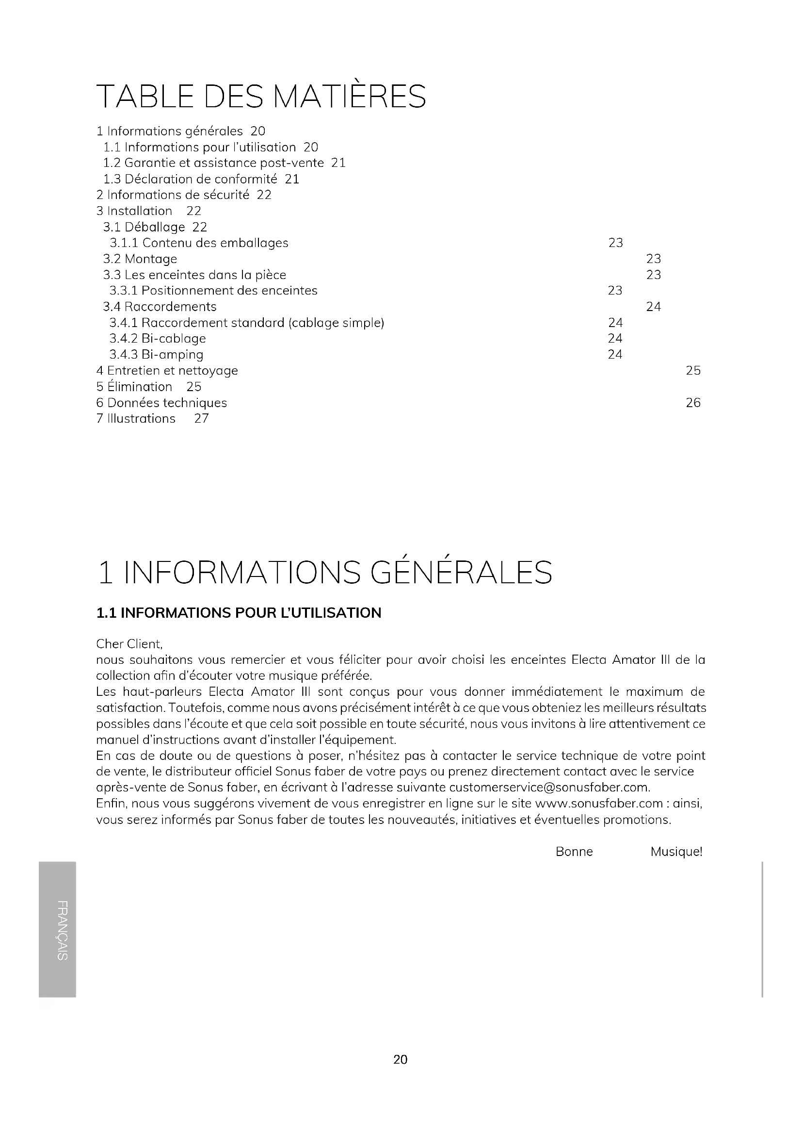 Cher Client, nous souhaitons vous remercier et vous féliciter pour avoir choisi les enceintes Electa Amator III de la collection an d’écouter votre musique préférée. Les haut-parleurs Electa Amator III sont conçus pour vous donner immédiatement le maximum de satisfaction. Toutefois, comme nous avons précisément intérêt à ce que vous obteniez les meilleurs résultats possibles dans l’écoute et que cela soit possible en toute sécurité, nous vous invitons à lire attentivement ce manuel d’instructions avant d’installer l’équipement. En cas de doute ou de questions à poser, n’hésitez pas à contacter le service technique de votre point de vente, le distributeur ofciel Sonus faber de votre pays ou prenez directement contact avec le service après-vente de Sonus faber, en écrivant à l’adresse suivante customerservice@sonusfaber.com. Enn, nous vous suggérons vivement de vous enregistrer en ligne sur le site www.sonusfaber.com: ainsi, vous serez informés par Sonus faber de toutes les nouveautés, initiatives et éventuelles promotions. Bonne Musique! 1 Informations générales 20