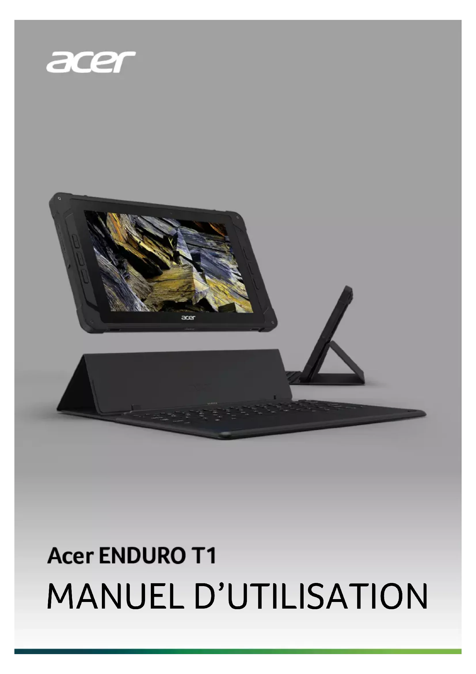 © 2020. Tous droits réservés. Acer ENDURO T1 Couvre : ET110-31W Cette révision : 04/2020 Enregistrer votre produit Acer Si votre nouvel appareil fonctionne sous le système d’exploitation Windows, il est possible que votre produit ait été enregistré automatiquement lors du démarrage de votre appareil avec le système d’exploitation Windows. Connectez-vous à l’adresse www.acer.com/myproducts avec l’adresse e-mail que vous avez enregistrée pour le système d’exploitation Windows afin de consulter votre fiche produit. (Réinitialisez votre mot de passe si vous ne le connaissez pas.) Si la fiche n’est pas trouvée, veuillez suivre les étapes ci-dessous pour vous inscrire. 1.Assurez-vous d'être connecté à Internet. 2.Allez à www.acer.com/register-product. 3.Connectez-vous ou inscrivez-vous pour obtenir Acer ID. 4.Entrez le N/S ou le SNID de votre appareil pour l’enregistrer. Important Ce manuel contient des informations propriétaires qui sont protégées par les lois sur le copyright. Les informations contenues dans ce manuel peuvent être modifiées sans préavis. Certaines fonctionnalités décrites dans ce manuel peuvent ne pas être prises en charge en fonction de la version du système d’exploitation. Les images fournies ici sont pour référence seulement et peuvent contenir des informations ou des fonctionnalités qui ne s’appliquent pas à votre ordinateur. Le Groupe Acer ne peut être tenu responsable des erreurs ou omissions techniques ou éditoriales contenues dans ce manuel. Numéro de modèle : ____________________________ Numéro de série : ______________________________ Date d’achat : _________________________________ Lieu d’achat : __________________________________Table des matières - 3