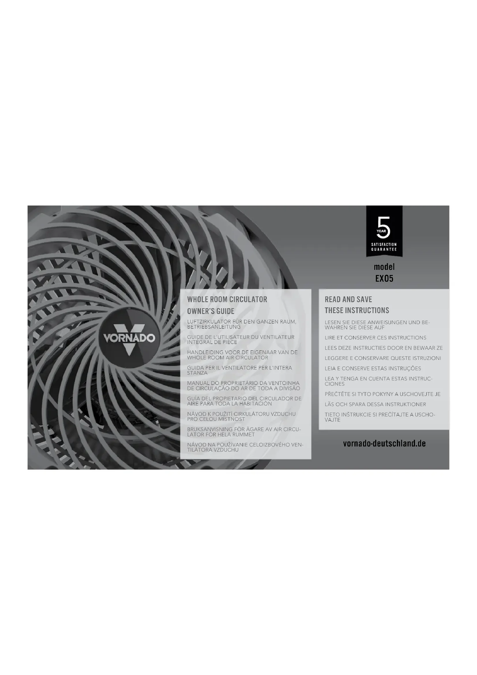 ANS SATISFACTION GARANTIE *Limité les conditions de garantie et de réparation et les conditions Vous recevrez une volontaire 5 ans garantie du fabricant de la date d’achat sur les matériaux et de fabrication du produit. Garantie du fabricant de cette étendue est valable pour tous les clients en Europe. Les réclamations de garantie légale ne sont pas affectées par le présent règlement additionnel. Le fabricant n’assume aucune responsabilité quant aux dommages survenant à la suite du non-respect de ces instructions ou d’une utilisation inadéquate du produit. Ces actions entraîneront l’annulation de la garantie du produit. Cette garantie ne s’applique pas aux vices qui résultent d’une utilisation abusive du produit, de sa modication, de la réparation du produit ou de son entretien s’ils n’ont pas été effectués par Vornado ou un centre de service autorisé, d’une manutention inadéquate, d’un entretien inadéquat, d’un usage commercial du produit, ni des dommages survenus lors de la livraison ou causés par des catastrophes naturelles. Il n’est pas recommandé d’effectuer des modications non autorisées du produit, de faire réparer le produit dans un centre de réparation non autorisé ou d’utiliser des pièces de rechange non approuvées, sinon tout effet négatif sur le produit ne sera pas couvert par les garanties du produit ni par les services de soutien. La garantie ne couvre pas les dommages causés par un usage inapproprié ou non conforme au guide d’utilisation, entre autres (sans s’y limiter), si le produit est exposé à l’humidité, à des températures extrêmes, aux intempéries, à la corrosion ou à l’oxydation, si des liquides se déversent sur le produit, si des substances chimiques entrent en contact avec le produit ou tout autre incident que le fabricant ne peut contrôler ou prévoir de façon raisonnable. Pour que le produit soit traité par le département de service, il est nécessaire d’envoyer un reçu ou une facture. La totalité des renseignements techniques, des données et des instructions d’installation, de branchement et de fonctionnement du présent guide d’utilisation sont conformes aux informations les plus récentes au moment de l’impression. Le contenu du présent guide d’utilisation peut différer légèrement du produit réel. Consultez tout autre document joint en annexe. Tous les noms d’entreprise et de produit sont des marques de commerce de leurs propriétaires respectifs. © Tous droits réservés. Consulter la pour dernière couverture du guide du propriétaire pour l’Information de l’importateur et votre centre de Service autorisé.