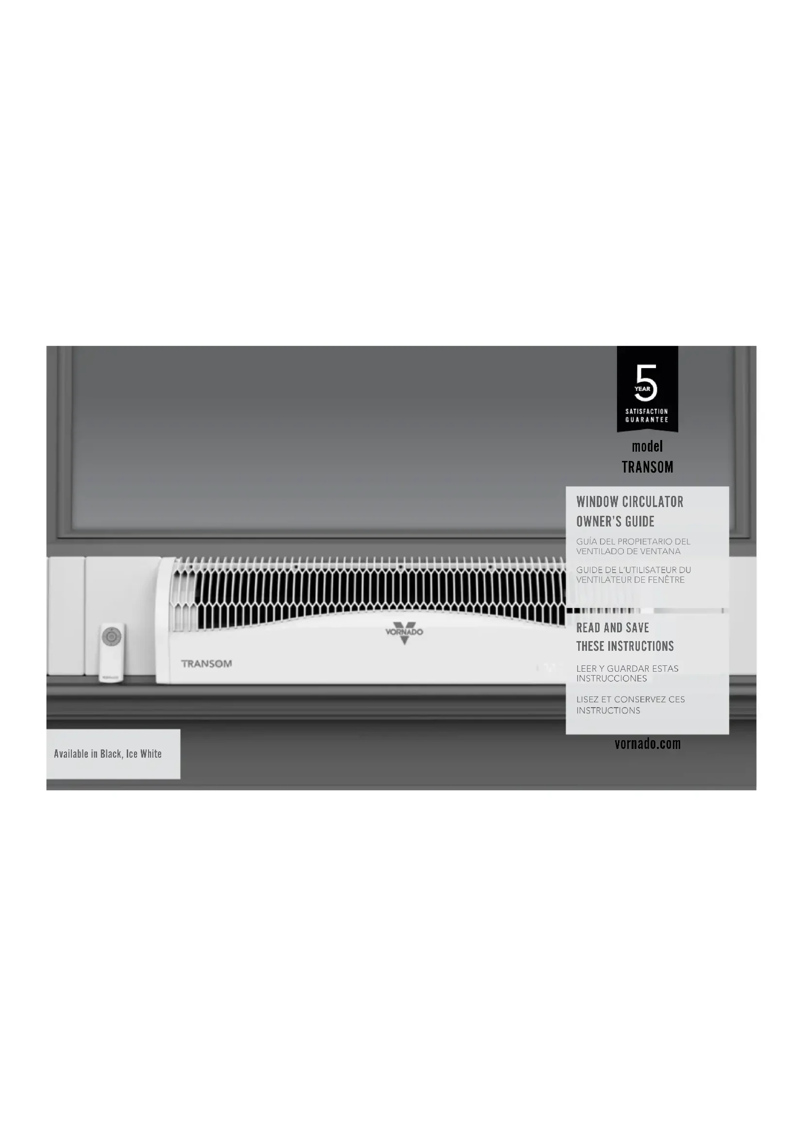 ait un court-circuit. Le produit doit alors être jeté ou retourné à un établissement de réparation autorisé an qu’il soit vérié ou réparé. Risque d’incendie. Ne pas remplacer la che de branchement. Elle contient un dispositif de sécurité (fusible, disjoncteur de défaut d’arc, interrupteur détecteur de courant de fuite) qu’il ne faut pas retirer. Jeter le produit si la che de branchement est endommagée. Déclaration de conformité FCC Cet appareil est conforme à la section 15 de la réglementation de la FCC. Son fonctionnement est soumis aux deux conditions suivantes: (1) Cet Fig. A Fig. B Fig. C appareil ne doit pas causer d’interférences nuisibles et (2) cet appareil doit accepter toutes les interférences reçues, y compris celles pouvant entraîner un fonctionnement indésirable. REMARQUE: Cet appareil a été testé et jugé conforme aux limitations relatives à un appareil numérique de classe B, conformément à la section15 des règlements de la FCC. Ces limitations visent à fournir une protection raisonnable contre le brouillage nuisible pouvant survenir dans un environnement résidentiel. Cet appareil génère, utilise et peut émettre de l’énergie de fréquence radio et risque, s’il n’est pas installé ni utilisé conformément auxinstructions, de causer du brouillage qui nuira aux communications radiophoniques. Il est toutefois impossible de garantir qu’il ne se produira pas de brouillage dans un environnement particulier. Si cet appareil cause brouillage qui nuit à la réception radio ou télévisuelle, ce qui peut être déterminé en mettant l’appareil hors tension, puis sous tension, nous encourageons l’utilisateur à essayer d’éliminer le brouillage à l’aide d’une ou de plusieurs des mesures suivantes: -Réorienter ou déplacer l’antenne réceptrice. -Éloigner l’appareil du récepteur.-Brancher le produit sur une prise de courant faisant partie d’un circuit autre que celui sur lequel est branché le récepteur. -Contactez le service clientèle de Vornado ou consulter le détaillant ou un technicien radio/télé compétent pour obtenir de l’assistance. Cet appareil numérique de classe B est conforme à la norme canadienne ICES-003. Les changements ou modications non expressément approuvés par la partie responsable de la conformité peuvent annuler l’autorité de l’utilisateur à utiliser l’équipement. Déclaration de conformité FCC du fournisseur Identiant unique: Vornado Modèle TRANSOM Partie responsable: Vornado Air LLC Adresse postale: 415 E. 13th St., Andover, KS 67002 Contact: www.vornado.com