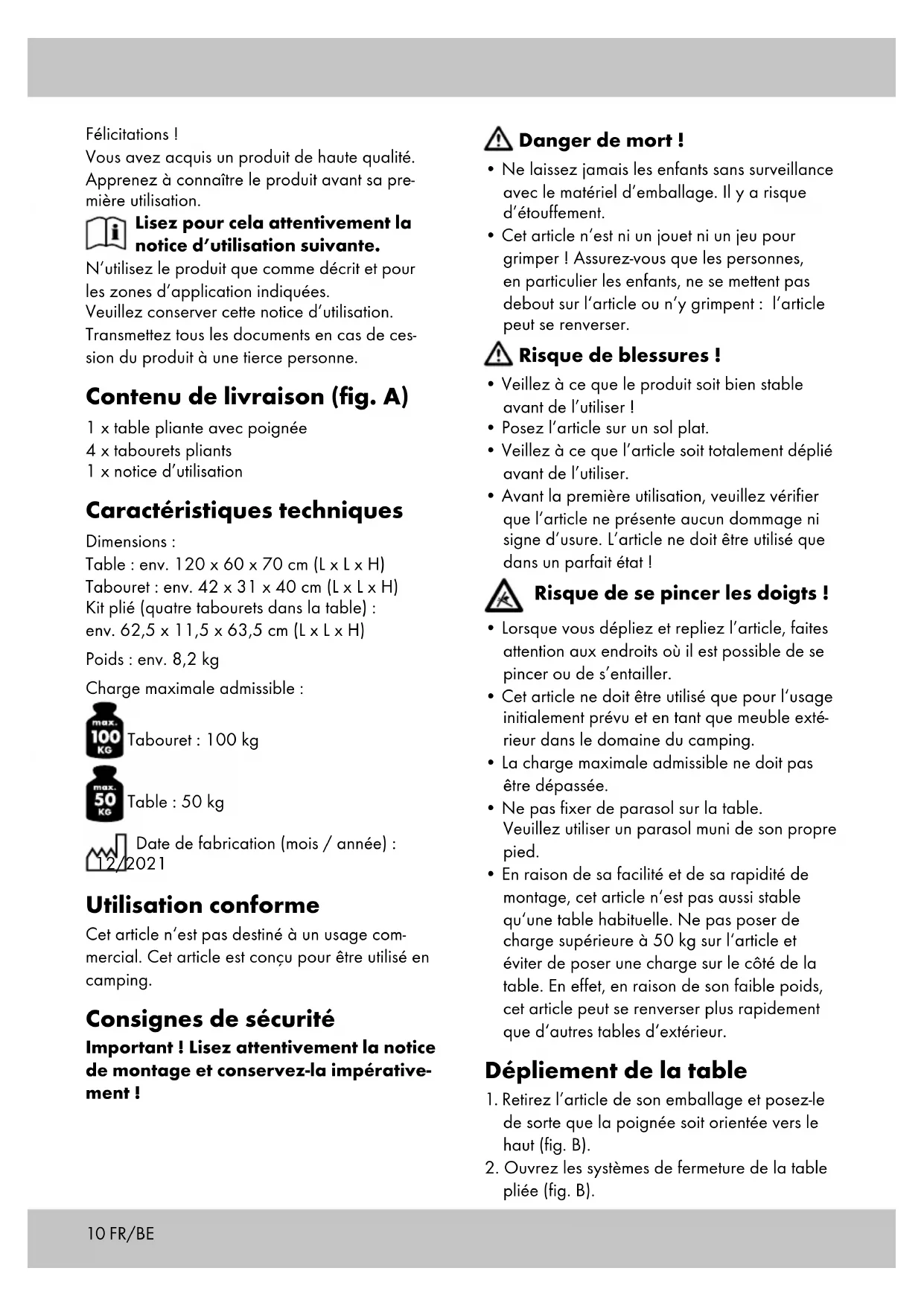 - s‘il présente les qualités qu‘un acheteur peut légitimement attendre eu égard aux déclara- tions publiques faites par le vendeur, par le producteur ou par son représentant, notam- ment dans la publicité ou l‘étiquetage ; 2° Ou s‘il présente les caractéristiques définies d‘un commun accord par les parties ou être propre à tout usage spécial recherché par l‘acheteur, porté à la connaissance du vendeur et que ce dernier a accepté. Article L217-12 du Code de la consommation L‘action résultant du défaut de conformité se prescrit par deux ans à compter de la délivrance du bien. Article 1641 du Code civil Le vendeur est tenu de la garantie à raison des défauts cachés de la chose vendue qui la rendent impropre à l‘usage auquel on la destine, ou qui diminuent tellement cet usage que l‘acheteur ne l‘aurait pas acquise, ou n‘en aurait donné qu‘un moindre prix, s‘il les avait connus. Article 1648 1er alinéa du Code civil L‘action résultant des vices rédhibitoires doit être intentée par l‘acquéreur dans un délai de deux ans à compter de la découverte du vice. Les pièces détachées indispensables à l’utili- sation du produit sont disponibles pendant la durée de la garantie du produit. IAN : 384610_2107 Service France Tel. : 0800 919270 E-Mail : deltasport@lidl.fr Service Belgique Tel. : 070 270 171 (0,15 EUR/Min.) E-Mail : deltasport@lidl.be13 Hartelijk gefeliciteerd! Met de aankoop hebt u gekozen voor een hoogwaardig product. Maak u daarom voor de eerste ingebruikname vertrouwd met het product. Lees hiervoor deze gebruiksaan- wijzing aandachtig door. Gebruik het product alleen zoals beschreven en uitsluitend voor de aangegeven doeleinden. Bewaar de gebruiksaanwijzing zorgvuldig. Als u het product aan derden geeft, dient u ook deze documenten te overhandigen. Omvang van de levering (afb. A) 1 x Tafel, klapbaar met draaggreep 4 x Kruk, klapbaar 1 x Gebruiksaanwijzing Technische gegevens Afmetingen: Tafel: ca. 120 x 60 x 70 cm (L x B x H) Kruk: ca. 42 x 31 x 40 cm (L x B x H) opgevouwen set (vier krukken in de tafel): ca. 62,5 x 11,5 x 63,5 cm (L x B x H) Gewicht: ca. 8,2 kg Max. belastbaarheid: Kruk: 100 kg Tafel: 50 kg Productiedatum (maand/jaar): 12/2021 Doelmatig gebruik Dit artikel is niet bestemd voor commercieel gebruik. Het artikel is ontworpen voor kampeer- gebruik. Veiligheidsinstructies Belangrijk! Lees deze montage-hand-lei- ding zorgvuldig door en bewaar deze per sé! Levensgevaar!