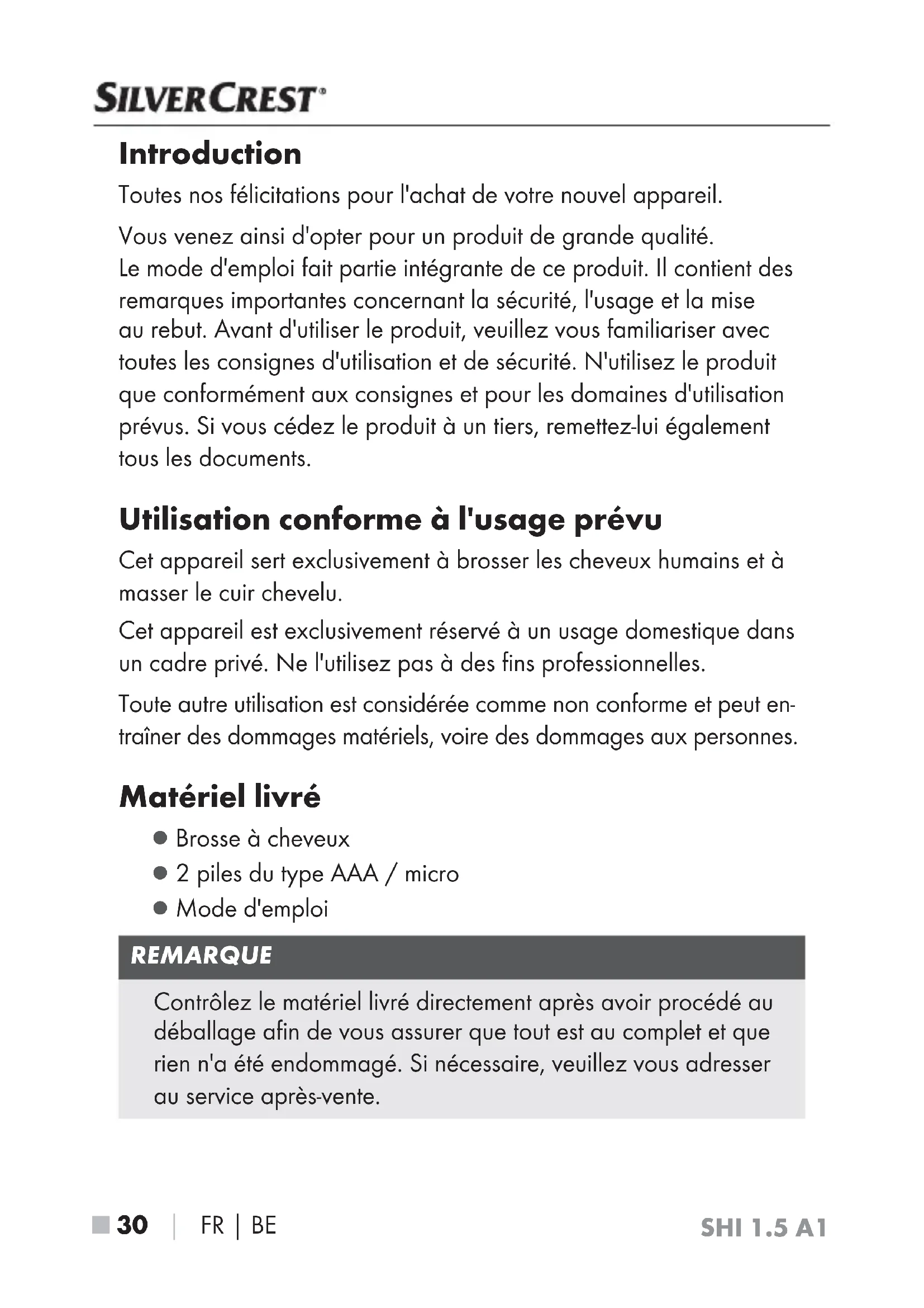 - Importateur SHI1.5A1 ■ 30 │ FR│BE Introduction Toutes nos félicitations pour l'achat de votre nouvel appareil. Vous venez ainsi d'opter pour un produit de grande qualité. Le mode d'emploi fait partie intégrante de ce produit. Il contient des remarques importantes concernant la sécurité, l'usage et la mise au rebut. Avant d'utiliser le produit, veuillez vous familiariser avec toutes les consignes d'utilisation et de sécurité. N'utilisez le produit que conformément aux consignes et pour les domaines d'utilisation prévus. Si vous cédez le produit à un tiers, remettez-lui également tous les documents. Utilisation conforme à l'usage prévu Cet appareil sert exclusivement à brosser les cheveux humains et à masser le cuir chevelu. Cet appareil est exclusivement réservé à un usage domestique dans un cadre privé. Ne l'utilisez pas à des fins professionnelles. Toute autre utilisation est considérée comme non conforme et peut en- traîner des dommages matériels, voire des dommages aux personnes. Matériel livré ▯ Brosse à cheveux ▯ 2 piles du type AAA / micro ▯ Mode d'emploi REMARQUE Contrôlez le matériel livré directement après avoir procédé au déballage afin de vous assurer que tout est au complet et que rien n'a été endommagé. Si nécessaire, veuillez vous adresser au service après-vente.SHI1.5A1 FR│BE │ 31 ■ Description de l'appareil Voyant de contrôle Corps Déverrouillage ( = verrouillé; = déverrouillé) p. 42