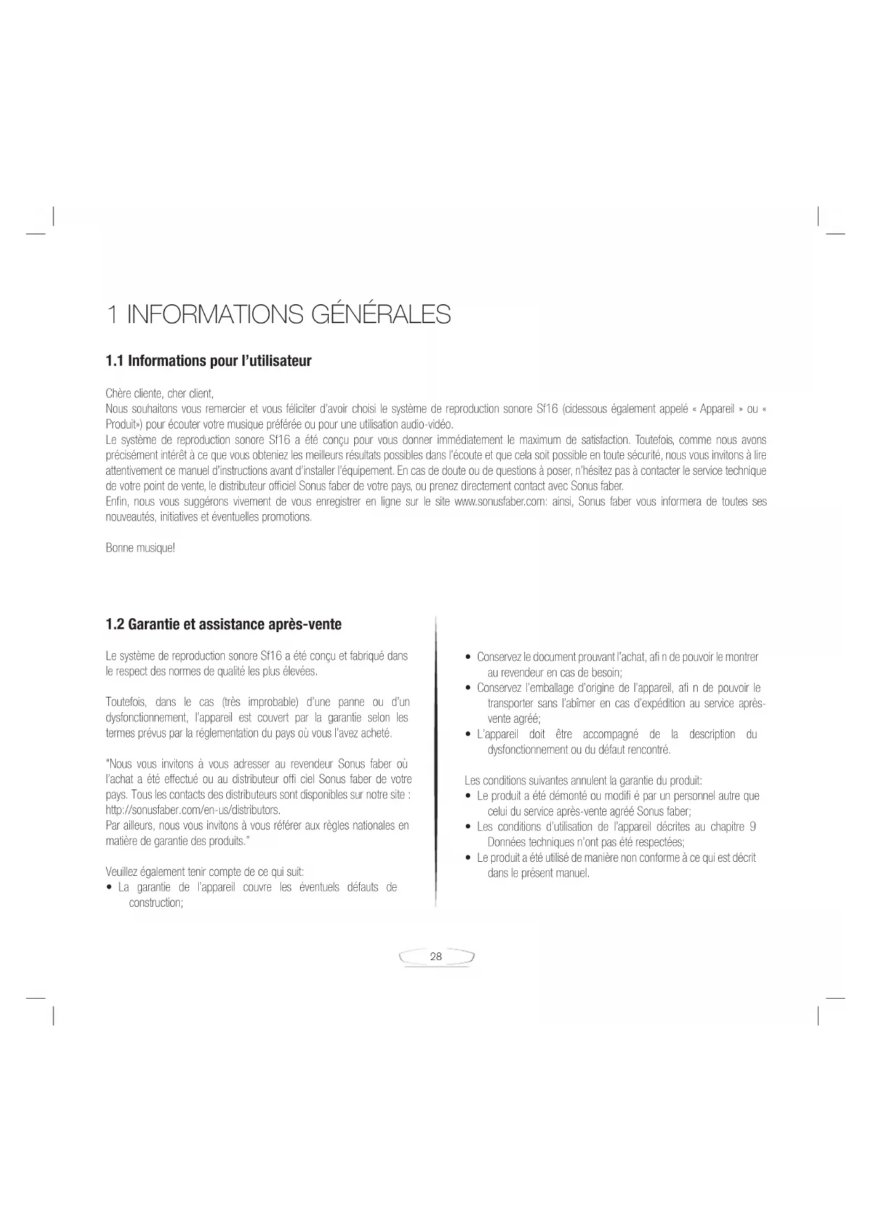Le système de reproduction sonore Sf16 a été conçu et fabriqué dans le respect des normes de qualité les plus élevées. Toutefois, dans le cas (très improbable) d’une panne ou d’un dysfonctionnement, l’appareil est couvert par la garantie selon les termes prévus par la réglementation du pays où vous l’avez acheté. “Nous vous invitons à vous adresser au revendeur Sonus faber où l’achat a été effectué ou au distributeur offi ciel Sonus faber de votre pays. Tous les contacts des distributeurs sont disponibles sur notre site : http://sonusfaber.com/en-us/distributors. Par ailleurs, nous vous invitons à vous référer aux règles nationales en matière de garantie des produits.” Veuillez également tenir compte de ce qui suit: