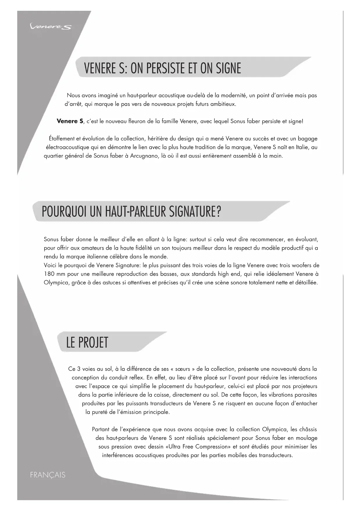 - Die Gewährleistung auf die Lautsprechersysteme deckt Herstellungsfehler ab. Voraussetzung ist, dass sie nicht auseinandergebaut, geändert oder manipuliert worden sind. Außerdem dürfen sie nicht für einen Gebrauch eingesetzt oder auf eine Weise verwendet worden sein, die in diesem Handbuch nicht vorgesehen ist. Unsere Lautsprecher können nicht nur für herkömmliches stereofones Hören, sondern auch als Bestandteil von Heimkino- und Mehrkanalanlagen genutzt werden. Für die Lautsprecher der Hauptkanäle (vorne) gelten in etwa die oben beschriebenen Regeln; die Lautsprecher für die hinteren Kanäle sind nach Möglichkeit so anzuordnen, wie in Abb. 9 gezeigt: Der zentrale Lautsprecher wird genau auf einer Linie mit der senkrechten Achse platziert, die durch die Mitte des Bildschirms verläuft (über oder unter dem Bildschirm), während der Subwoofer unterschiedslos an jeder beliebigen Stelle des Raums positioniert werden kann. Es sollte nur vermieden werden, ihn in Ecknähe aufzustellen. Für weitere Einzelheiten zur optimalen Einrichtung der Anlage lesen Sie bitte aufmerksam auch die Angaben, die Ihrem Verstärkersystem beiliegen.FRANÇAIS POURQUOI UN HAUT-PARLEUR SIGNATURE? LE PROJET Nous avons imaginé un haut-parleur acoustique au-delà de la modernité, un point d’arrivée mais pas d’arrêt, qui marque le pas vers de nouveaux projets futurs ambitieux. Venere S, c’est le nouveau fleuron de la famille Venere, avec lequel Sonus faber persiste et signe! Étoffement et évolution de la collection, héritière du design qui a mené Venere au succès et avec un bagage électroacoustique qui en démontre le lien avec la plus haute tradition de la marque, Venere S naît en Italie, au quartier général de Sonus faber à Arcugnano, là où il est aussi entièrement assemblé à la main. Sonus faber donne le meilleur d’elle en allant à la ligne: surtout si cela veut dire recommencer, en évoluant, pour offrir aux amateurs de la haute fidélité un son toujours meilleur dans le respect du modèle productif qui a rendu la marque italienne célèbre dans le monde. Voici le pourquoi de Venere Signature: le plus puissant des trois voies de la ligne Venere avec trois woofers de 180 mm pour une meilleure reproduction des basses, aux standards high end, qui relie idéalement Venere à Olympica, grâce à des astuces si attentives et précises qu’il crée une scène sonore totalement nette et détaillée. Ce 3 voies au sol, à la différence de ses « sœurs » de la collection, présente une nouveauté dans la conception du conduit reflex. En effet, au lieu d’être placé sur l’avant pour réduire les interactions avec l’espace ce qui simplifie le placement du haut-parleur, celui-ci est placé par nos projeteurs dans la partie inférieure de la caisse, directement au sol. De cette façon, les vibrations parasites produites par les puissants transducteurs de Venere S ne risquent en aucune façon d’entacher la pureté de l’émission principale. Partant de l’expérience que nous avons acquise avec la collection Olympica, les châssis des haut-parleurs de Venere S sont réalisés spécialement pour Sonus faber en moulage sous pression avec dessin «Ultra Free Compression» et sont étudiés pour minimiser les interférences acoustiques produites par les parties mobiles des transducteurs. VENERE S: ON PERSISTE ET ON SIGNELE DESIGN