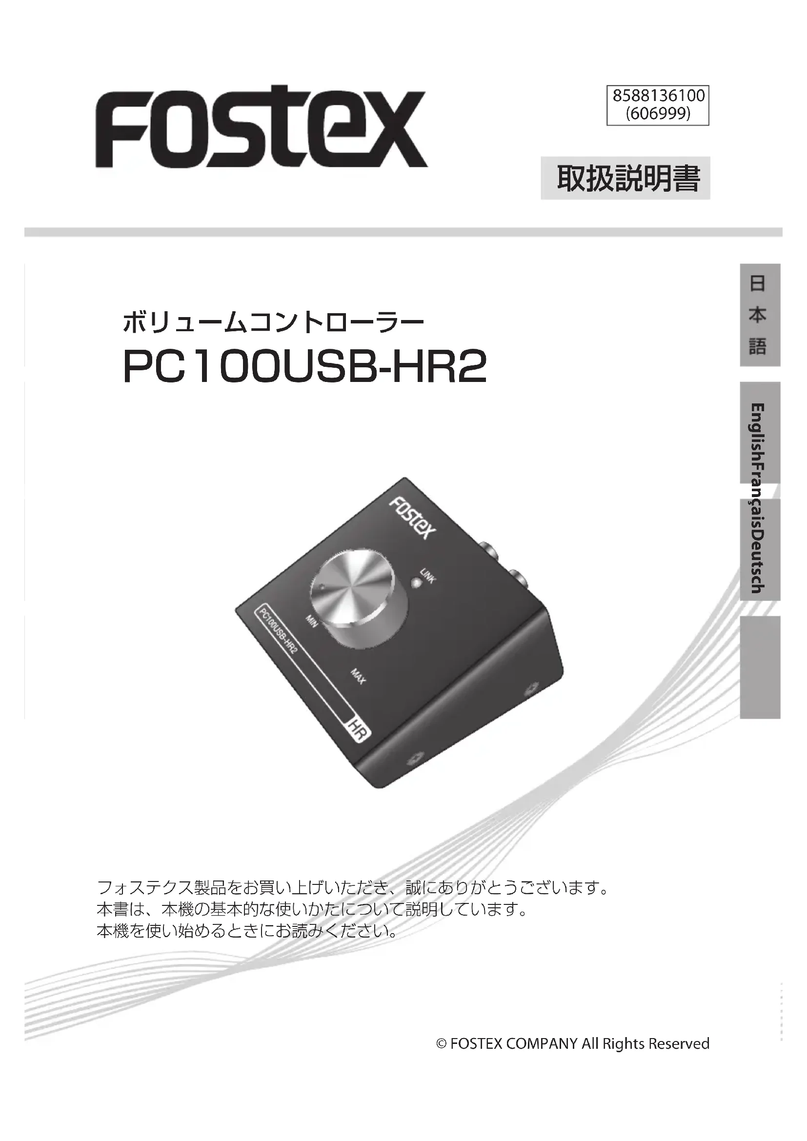 (606999) Mode d’emploi Français Merci d'avoir acheté ce produit Fostex. Ce mode d'emploi vous donne les informations de base sur l'utilisation de cet appareil. Lisez-le avant d'utiliser l'appareil pour la première fois. © FOSTEX COMPANY Tous droits réservés2