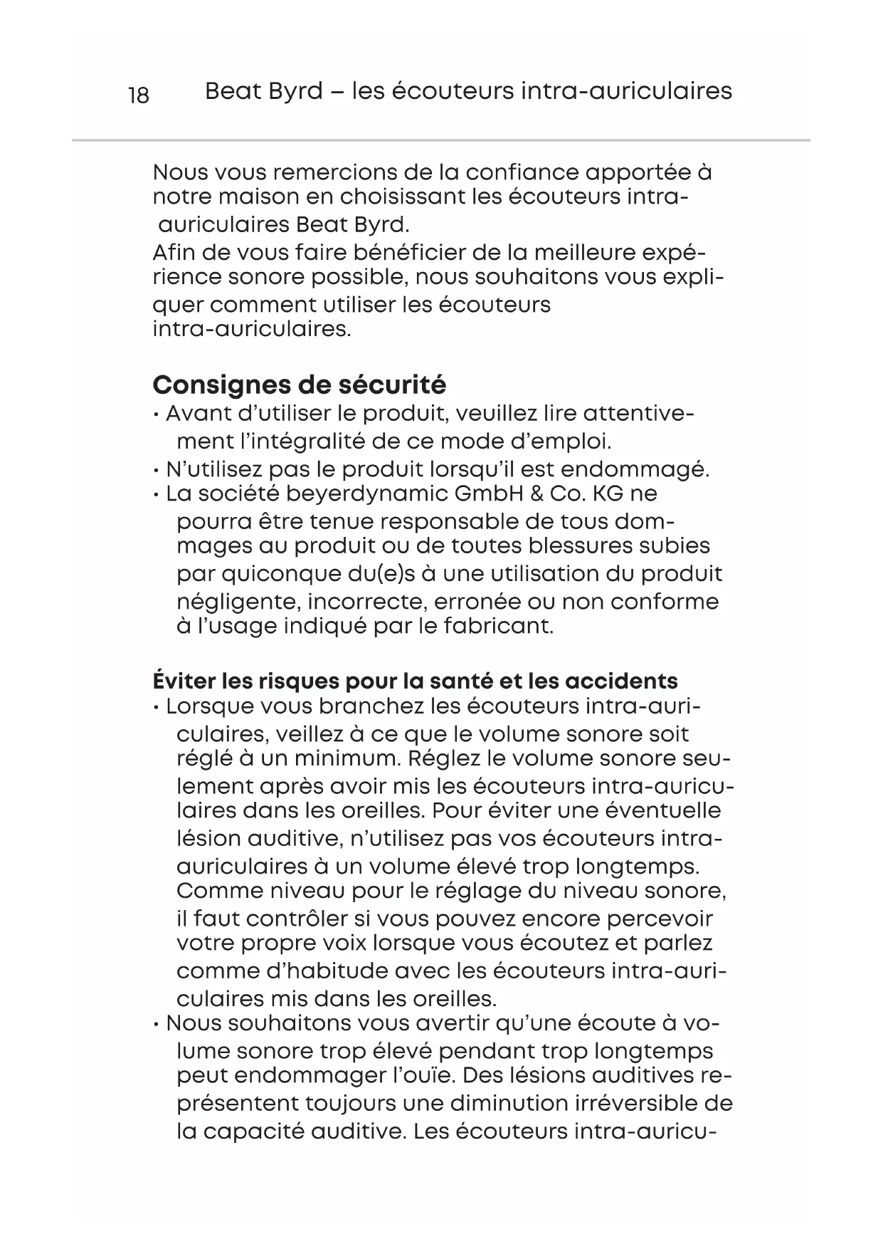 - N’utilisez pas le produit pour un autre usage que celui décrit dans ce mode d’emploi. beyerdynamic ne saurait être tenu responsable en cas d’utilisation non conforme du produit et des accessoires.Beat Byrd – les écouteurs intra-auriculaires