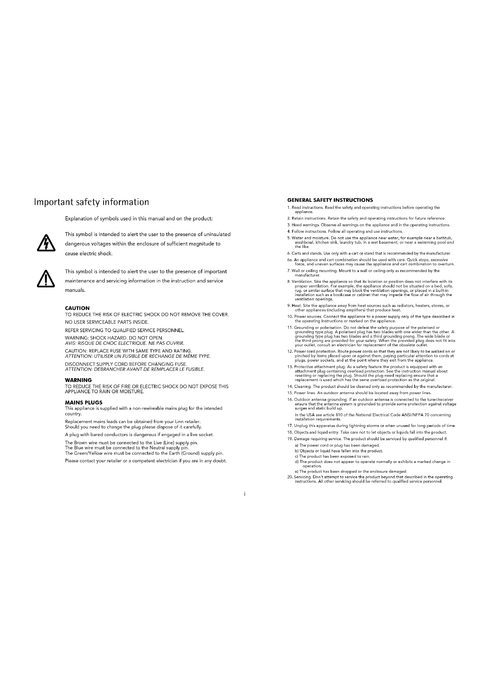 Remplacement du fusible Cet appareil est livré avec une fiche secteur non démontable de 13 A. La fiche comporte un fusible de 5 A. Si le fusible a sauté, remplacez-le en suivant la procédure ci-dessous : a) Ouvrez le compartiment du fusible. b) Retirez le fusible endommagé. c) Remplacez-le par un fusible neuf de 5 A conforme à la norme BS1362 et refermez le compartiment fusible. Vérifiez que le compartiment a été correctement refermé. Si le couvercle du logement est absent, n’utilisez pas la fiche. Procurez-vous un autre couvercle auprès de votre revendeur Linn. Les fusibles servent à protéger contre les incendies, mais en aucun cas contre les risques de choc électrique. Remplacement de la fiche secteur Si vous devez remplacer la fiche secteur et ne vous sentez pas suffisamment compétent pour le faire, adressez-vous à votre revendeur Linn ou à un électricien qualifié. a) Débranchez la fiche de l’alimentation secteur. b) Coupez la fiche et placez-la en lieu sûr. Une fiche présentant des fils dénudés est dangereuse si elle est branchée dans une prise sous tension. c) Seule une fiche de 13 A conforme à la norme BS1363A avec un fusible de 5 Amp peut être utilisée. d) La couleur des fils du câble ou une lettre sera indiquée sur les bornes de contact de la plupart des fiches de bonne qualité. Fixez chaque fil sur la borne qui lui correspond. Reliez le fil marron au secteur, le fil bleu au neutre et le fil vert/jaune à la terre. e) Avant de replacer le couvercle de la fiche, assurez-vous que la gaine du câble pénètre bien dans la fiche et qu’elle est fermement maintenue. Vérifiez également que les fils ont été connectés correctement. ATTENTION CET APPAREIL DOIT ETRE RELIE A LA TERRE. Remplacement du fusible Si le fusible secteur saute, remplacez-le par un fusible identique. Le porte-fusible se trouve juste sous la prise d’entrée secteur. Pour remplacer le fusible, débranchez tout d’abord l’appareil de l’alimentation secteur. A l’aide d’un tournevis, ôtez le fusible et changez-le. Si le fusible saute à nouveau, cela signifie qu’il y a un problème au niveau de l’appareil. Adressez-vous à votre revendeur local. Valeur nominale du fusible. Voir la section Spécifications. Tolérance secteur. Voir la section Spécifications.