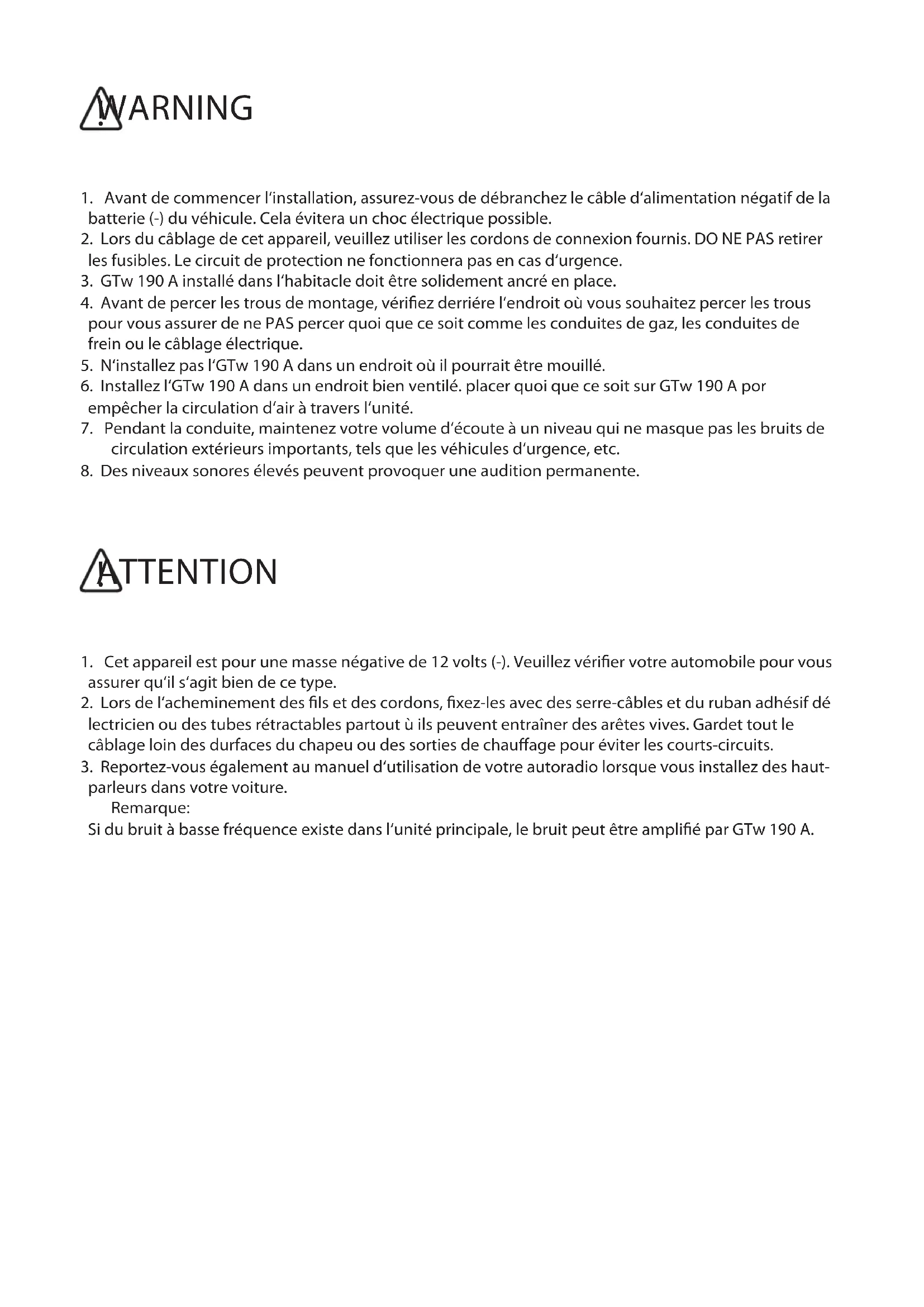 parleurs dans votre voiture. Remarque: Si du bruit à basse fréquence existe dans l‘unité principale, le bruit peut être amplié par GTw 190 A.