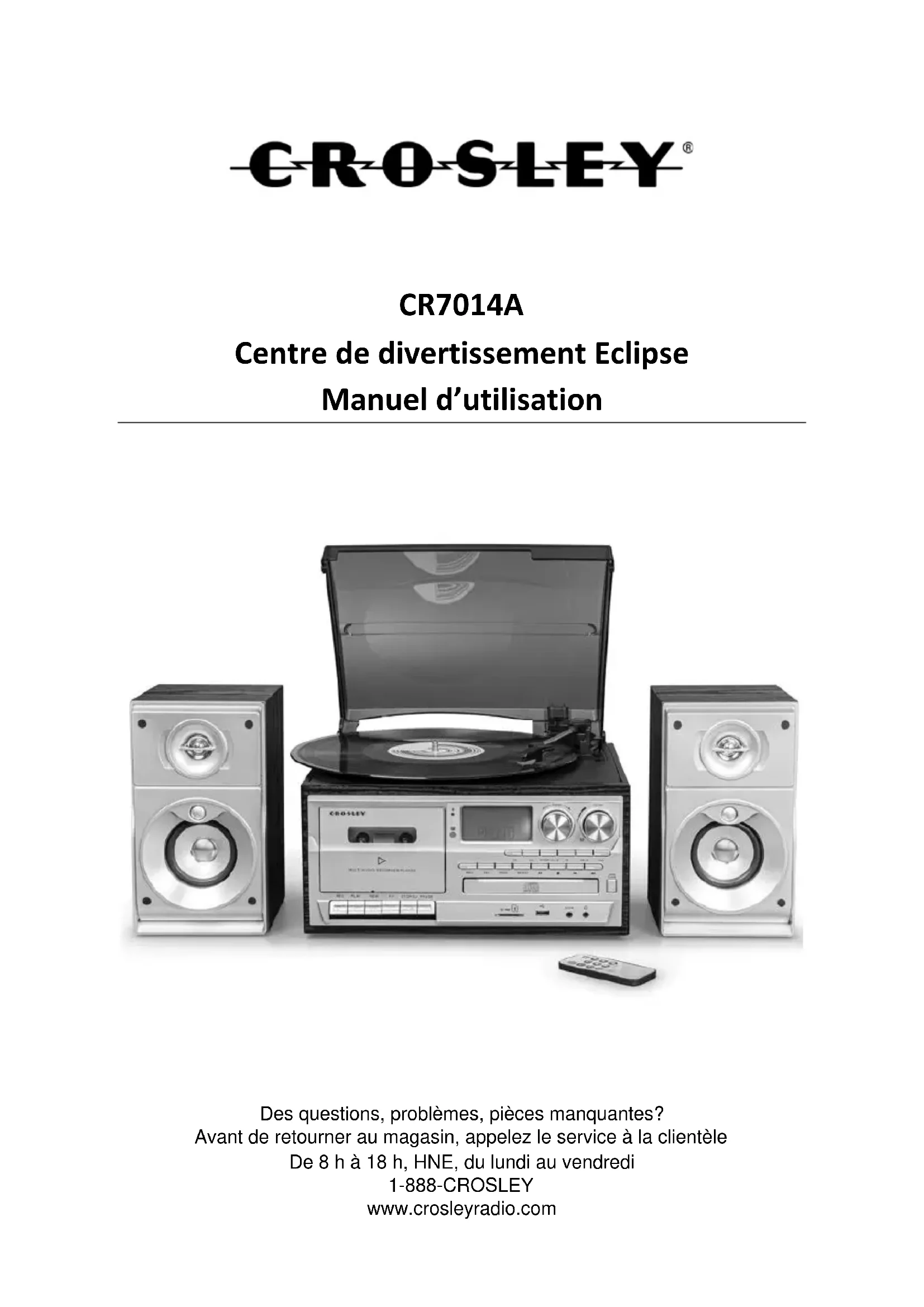 Des questions, problèmes, pièces manquantes? Avant de retourner au magasin, appelez le service à la clientèle De 8 h à 18 h, HNE, du lundi au vendredi 1-888-CROSLEY www.crosleyradio.comFrench
