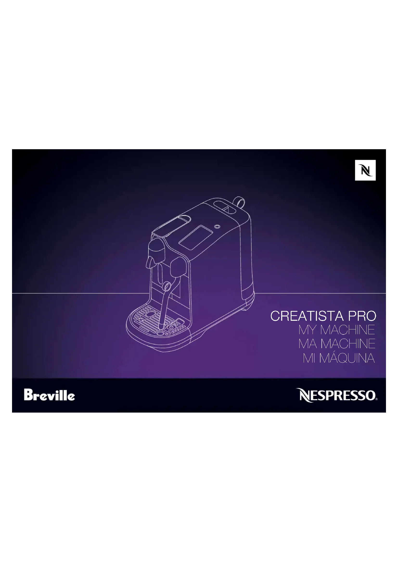 USER MANUAL Nespresso is an exclusive system creating the perfect Espresso, time after time. Each parameter has been calculated with great precision to ensure that all the aromas from each capsule can be extracted, to give the coffee body and create an exceptionally thick and smooth crema. MANUEL D'UTILISATION Nespresso est un systènme erreur d'orthographen, enlever le N exclusif qui crée l'espresso parfait, à chaque fois. Chaque paramètre a été calculé avec une grande précision pour s'assurer que les arômes de chaque capsule soient extraits, pour donner du corps au café et pour créer une crema exceptionnellement dense et onctueuse. MAX MIN Creatista Pro BNE900 Specications Spécications de la BNE900 Packaging Content Contenue de l'emballage ❷ Tasting Box of Nespresso Capsules ❹ Nespresso Welcome Brochure ❸ Milk Jug ❺ User Manual 1 x Water Hardness Test Strip, in the User Manual ❶ Creatista Pro Coffee Machine Machine à café Creatista Pro Coffret de dégustation de capsules Nespresso Brochure de bienvenue Nespresso Pichet à lait Manuel d'utilisation 1 x bandelette-test pour dureté de l'eau, incluse dans le manuel d'utilisatsion3