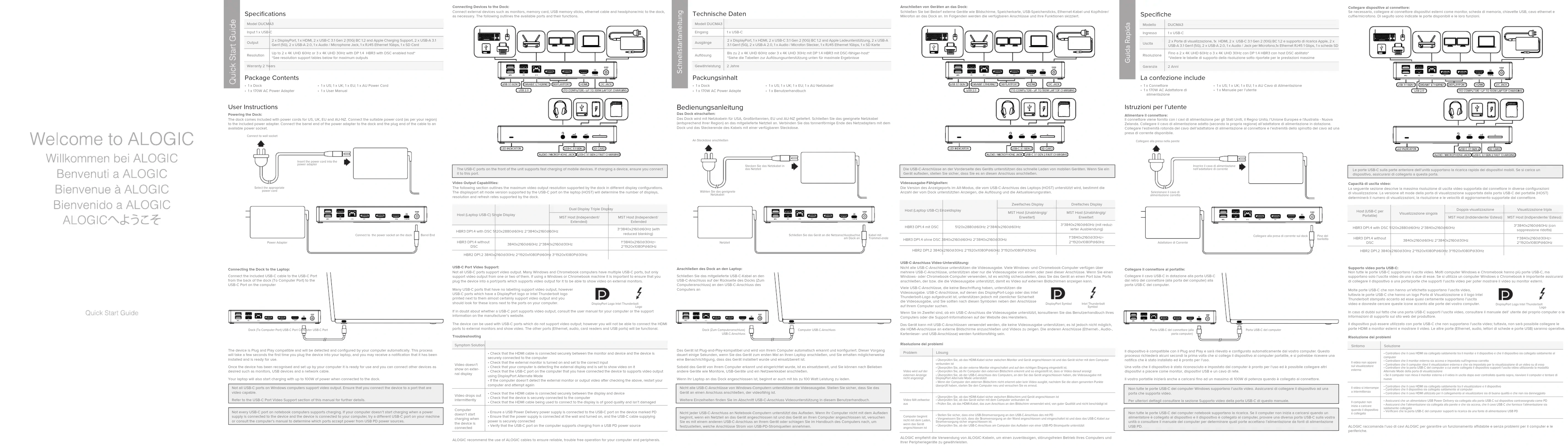 - 1 x Dock• 1 x 170W Adaptateur secteur Consignes d’utilisation Alimentation du système Dock : Le système dock est livré avec des câbles d’alimentation pour les États-Unis, le Royaume-Uni, l’Union européenne et l’Australie et la Nouvelle-Zélande. Branchez le cordon d’alimentation approprié (selon votre région) à l’adaptateur électrique inclus. Branchez l’extrémité de l’adaptateur d’alimentation au système Dock et l’extrémité du câble à une prise de courant disponible. Connexion des appareils au système Dock: Connectez des dispositifs externes tels que des écrans, des cartes mémoire, des clés USB, un câble Ethernet et un casque/ micro au système Dock, si nécessaire. Les paragraphes suivants décrivent les ports disponibles et leurs fonctions.Capacités de sortie vidéo:La section suivante décrit la résolution maximale de sortie vidéo prise en charge par le système dock dans diérentes configurations d’achage. La version du mode alt du port d’achage prise en charge par le port USB-C de l’ordinateur portable (HOST) déterminera le nombre d’achages, la résolution et les taux de rafraîchissement pris en charge par le système Dock. En cas de doute quant à savoir si un port USB-C prend en charge la sortie vidéo, consultez le manuel d’utilisation de votre ordinateur ou les informations d’assistance sur le site web du fabricant. L’appareil peut être utilisé avec des ports USB-C qui ne prennent pas en charge la sortie vidéo ; cependant, vous ne pourrez pas connecter les ports HDMI à des moniteurs externes et acher la vidéo. Les autres ports (Ethernet, audio, lecteurs de cartes et ports USB) seront fonctionnels. ALOGIC préconise l’utilisation de câbles ALOGIC pour assurer un fonctionnement fiable et sans problème de votre ordinateur et de vos périphériques.Assistance vidéo sur le port USB-C:Tous les ports USB-C ne prennent pas en charge la sortie vidéo. De nombreux ordinateurs Windows et Chromebook disposent de plusieurs ports USB-C, mais ne prennent en charge la sortie vidéo que d’un ou deux d’entre eux. Si vous utilisez un ordinateur Windows ou Chromebook, il est important de vous assurer que vous branchez l’appareil dans un ou plusieurs ports qui prennent en charge la sortie vidéo pour qu’il puisse acher la vidéo sur des moniteurs externes.TroubleshootingConnexion du Dock à l’ordinateur portable:L’appareil est compatible avec la technologie « Plug and Play » et sera détecté et configuré automatiquement par votre ordinateur. Ce processus prendra quelques secondes la première fois que vous brancherez l’appareil sur votre ordinateur portable, et vous recevrez peut-être une notification vous informant que l’appareil a été installé et qu’il est prêt à être utilisé. Une fois que l’appareil a été reconnu et configuré par votre ordinateur, il est prêt à l’emploi et vous pouvez connecter d’autres appareils à votre guise, tels que des moniteurs, des périphériques USB et un câble réseau. Votre ordinateur portable commencera également à se charger avec une puissance allant jusqu’à 100W lorsqu’il est connecté au système Dock. Tous les ports USB-C des ordinateurs Windows ne prennent pas en charge la sortie vidéo. Veillez à connecter l’appareil à un port capable de recevoir la vidéo.Reportez-vous à la section Assistance vidéo du port USB-C de ce manuel pour plus de détails.Tous les ports USB-C des ordinateurs portables ne prennent pas en charge le chargement. Si votre ordinateur ne commence pas à se charger lorsqu’une alimentation est connectée à l’appareil et que celui-ci est connecté à votre ordinateur, essayez un autre port USB-C sur votre machine ou consultez le manuel de l’ordinateur pour déterminer quels ports acceptent l’alimentation par des sources d’alimentation USB PD. Les ports USB-C situés à l’avant de l’appareil permettent de charger rapidement les appareils mobiles. Si vous chargez un appareil, assurez-vous de le connecter à ce port.Hôte (Ordinateur portable USB-C)Écran uniqueDouble écran Triple écranHôte MST (Indépendant/Étendue)Hôte MST (Indépendant/ÉtendueHBR3 DP1.4 with DSC 5120x2880@60Hz 2*3840x2160@60Hz3*3840x2160@60Hz (avecréduction de l’occultation)HBR3 DP1.4 without DSC 3840x2160@60Hz 2*3840x2160@30Hz1*3840x2160@30Hz+ 2*1920x1080P@60Hz HBR2 DP1.2 3840x2160@30Hz 2*1920x1080P@60Hz 3*1920x1080P@30Hz DisplayPort Logo Intel Thunderbolt Logo Symptôme SolutionLa vidéo ne s’ache pas sur un écran externe