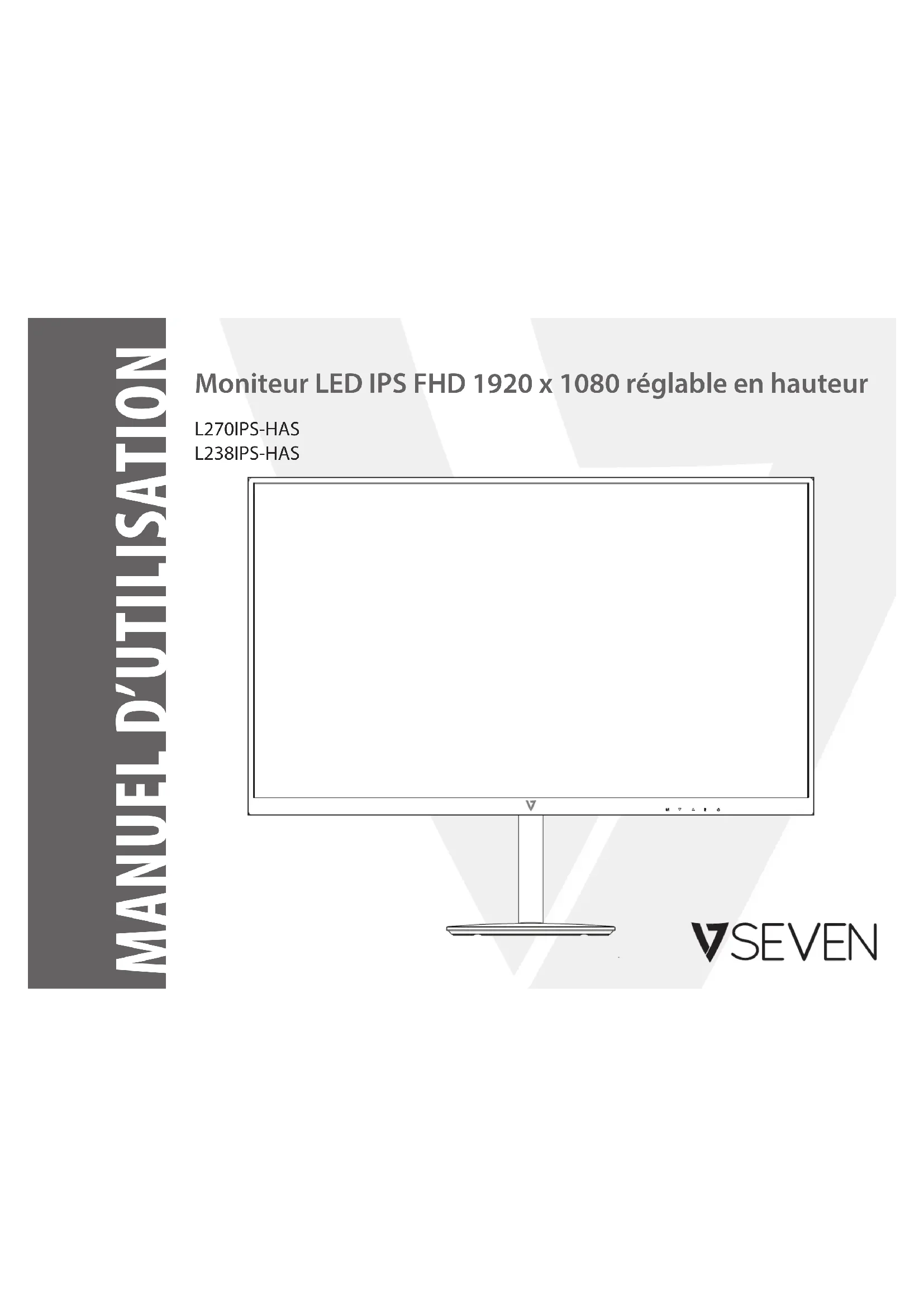 E: Retour M: Accéder au menu principal; Entrer : Haut/Bas, Droite/gauche : Allumer ou éteindre l’appareil Entrée audio Sortie audio VGAHDMIDPAlimentationMENU PRINCIPAL Système Information ASE Audio Couleur ImageIMAGE Luminosité: pour ajuster la luminosité de la vidéo. Contraste: pour ajuster le niveau de blanc au premier plan de l’image. Black Boost: pour ajuster le niveau de noir an de rendre plus visibles les zones sombres, comme les ombres. Lumière bleue: pour ajuster les niveaux de lumière bleue OFF/25%/50%/75%/100%. Lumière bleue désactivée si DCR activé. DCR: rapport de contraste dynamique. Remarque: réglage Position H., Position V., Focalisation, & horloge est grisé si raccordé par HDMI ou par un port d’écran. Cong. auto: conguration automatique des paramètres ci-dessous SEULEMENT si connecté via signal analogique VGA. Position H.: pour déplacer l’image horizontalement. Position V.: pour déplacer l’image verticalement. Focus: pour régler la position de phase du signal analogique. Horloge: pour régler l’horloge du signal analogique.COULEUR Gamma: pour régler le gamma 1,8/2,2/2,4. Couleur: pour régler la température de couleur: chaud/normal/froid/lumière bleue/utilisateur. Les valeurs RVB peuvent être réglées séparément.AUDIO Volume: pour régler les haut-parleurs intégrés.ASE Langue: pour choisir la langue souhaitée. Délai ASE: pour régler le temps limite de l’ASE. Transparence: pour régler la visibilité de l’ASE au premier plan.SYSTÈME Entrée: pour sélectionner la source d’entrée souhaitée: HDMI/VGA/DisplayPort. Source auto: pour sélectionner Marche/Arrêt. Mode large: pour sélectionner Adapté/Complet. Lorsque certains signaux d’entrée sont sur 4:3, l’achage peut s’étendre au mode plein écran 16:9. Le mode plein écran ne s’applique pas aux paramètres de haute résolution. DDC/CI: pour activer/désactiver le canal d’achage des données (DDC)/l’interface de commande (CI). Guide de démarrage rapide: sélectionnez Marche & Arrêt VSeven Image de démarrage.INFORMATIONSPÉCIFICATIONS TECHNIQUES MoniteurLEDIPS 23,8" (60,5cm) FHD 1920x1080 réglable en hauteur Généralités: Informations techniques: Modèle : L238IPS-HAS MTBF : 30 000 heures Garantie : 3 ans Taille de l’écran : 60,45 cm (23,8 IN) Conformité : CE, Energy Star, FCC, RoHS, UKCA, WEEE Type d’écran : IPS Pays d’origine : Chine Entrée d’alimentation : 100-240 V AC (50-60 Hz) Contenu de l’emballage : moniteur avec support réglable en hauteur, fixation VESA, 2 x M4x12, 2 x M4x30, Guide d’installation rapide, câble HDMI, câble d’alimentation, adaptateur d’alimentation et carte de garantie Format : 16:9 Temps de réponse : 14 ms Angle de vue : 178° H/178° V Résolution maximale : 1920 x 1080 Revêtement d’écran : mat Dimensions de l’emballage: Luminosité : 220 nits Dimensions de l’emballage (L/l/H) : 59,4 x 14,5 x 40,1 cm (23,4 x 5,7 x 15,8 IN) Profondeur de couleur : 16,7 millions de couleurs Poids à l’expédition : 4,8 kg (10,6 lbs) Classe énergétique UE/RU : F Poids de l’emballage : 4,8 kg (10,6 lbs) Rapport de contraste : 1200:1 Dimensions du produit: Port d’entrée : DisplayPort, HDMI, VGA Dimensions du produit (L/l/H) : 54,2 x 21 x 48,6 cm (21,3 x 8,3 x 19 IN) Support VESA : 100 x 100 mm Poids du produit : 3,82 kg (8,4 lbs) Type d’embase d’entrée AC : RU, UE, EU Support : 34,9 cm (13,7 IN) H, 20,5 cm (8 IN) P Haut-parleur : 2 x 2 W Dimension du moniteur (sans support) : 54,2 x 32,1 x 5,4 cm (21,3 x 12,6 x 2,1 IN) Pas de pixel (H/V) : 0,2745 (H) x 0,2745 (V) Fréquence horizontale : 60 Hz Zone d’affichage (H x L) : 52,7 cm x 29,6 cmSPÉCIFICATIONS TECHNIQUES MoniteurLEDIPS 27"(68,6cm) FHD 1920x1080 réglable en hauteur Généralités Informations techniques Modèle : L270IPS-HAS MTBF : 30 000 heures Garantie : 3 ans Taille de l’écran : 68,58 cm (27 IN) Conformité : CE, Energy Star, FCC, RoHS, UKCA, WEEE Type d’écran : IPS Pays d’origine : Chine Entrée d’alimentation : 100-240 V AC (50-60 Hz) Contenu de l’emballage : Moniteur avec support réglable en hauteur, fixation VESA, 2 x M4x12, 2 x M4x30, Guide d’installation rapide, câble HDMI, câble d’alimentation, adaptateur d’alimentation et carte de garantie Format : 16:9 Temps de réponse : 8 ms Angle de vue : 178° H/178° V Résolution maximale : 1920 x 1080 Revêtement d’écran : mat Dimensions de l’emballage Luminosité : 250 nits Dimensions de l’emballage (L/l/H) : 68 x 16,2 x 45,7 cm (26,7 x 6,4 x 18 IN) Profondeur de couleur : 16,7 millions de couleurs Poids à l’expédition : 6,1 kg (13,5 lbs) Classe énergétique UE/RU : F Poids de l’emballage : 6,1 kg (13,5 lbs) Rapport de contraste : 1000:1 Dimensions du produit Port d’entrée : DisplayPort, HDMI, VGA Dimensions du produit (L/l/H) : 61,6 x 20,5 x 52,8 cm (24,2 x 8 x 20,7 IN) Support VESA : 100 x 100 mm Poids du produit : 4,66 kg (10,3 lbs) Type d’embase d’entrée AC : RU, UE, EU Support : 36,9 cm (14,5 IN) H, 20,5 cm (8 IN) P Haut-parleur : 2 x 2 W Dimension du moniteur (sans support) : 61,6 x 36,3 x 5,6 cm (24,2 x 14,3 x 2,2 IN) Pas de pixel (H/V) : 0,1038 (H) x 0,31149 (V) Fréquence horizontale : 60 Hz Zone d’affichage (H x L) : 60,6 cm x 34,8 cmENTRETIEN ET MAINTENANCE Entretien