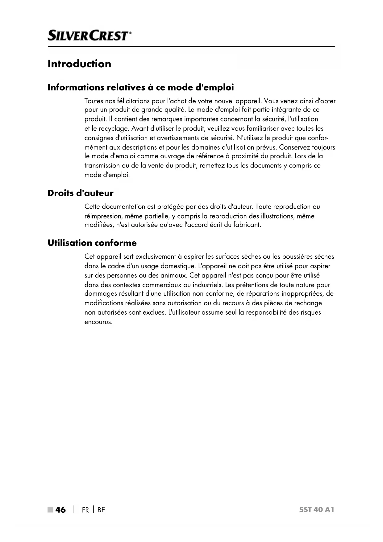 SST 40 A1 Introduction Informations relatives à ce mode d'emploi Toutes nos félicitations pour l'achat de votre nouvel appareil. Vous venez ainsi d'opter pour un produit de grande qualité. Le mode d'emploi fait partie intégrante de ce produit. Il contient des remarques importantes concernant la sécurité, l'utilisation et le recyclage. Avant d'utiliser le produit, veuillez vous familiariser avec toutes les consignes d'utilisation et avertissements de sécurité. N'utilisez le produit que confor- mément aux descriptions et pour les domaines d'utilisation prévus. Conservez toujours le mode d'emploi comme ouvrage de référence à proximité du produit. Lors de la transmission ou de la vente du produit, remettez tous les documents y compris ce mode d'emploi. Droits d'auteur Cette documentation est protégée par des droits d'auteur. Toute reproduction ou réimpression, même partielle, y compris la reproduction des illustrations, même modifiées, n'est autorisée qu'avec l'accord écrit du fabricant. Utilisation conforme Cet appareil sert exclusivement à aspirer les surfaces sèches ou les poussières sèches dans le cadre d'un usage domestique. L'appareil ne doit pas être utilisé pour aspirer sur des personnes ou des animaux. Cet appareil n'est pas conçu pour être utilisé dans des contextes commerciaux ou industriels. Les prétentions de toute nature pour dommages résultant d'une utilisation non conforme, de réparations inappropriées, de modifications réalisées sans autorisation ou du recours à des pièces de rechange non autorisées sont exclues. L'utilisateur assume seul la responsabilité des risques encourus. IB_329834_SST40A1_LB8.indb 46 24.09.2021 08:40:47FR
