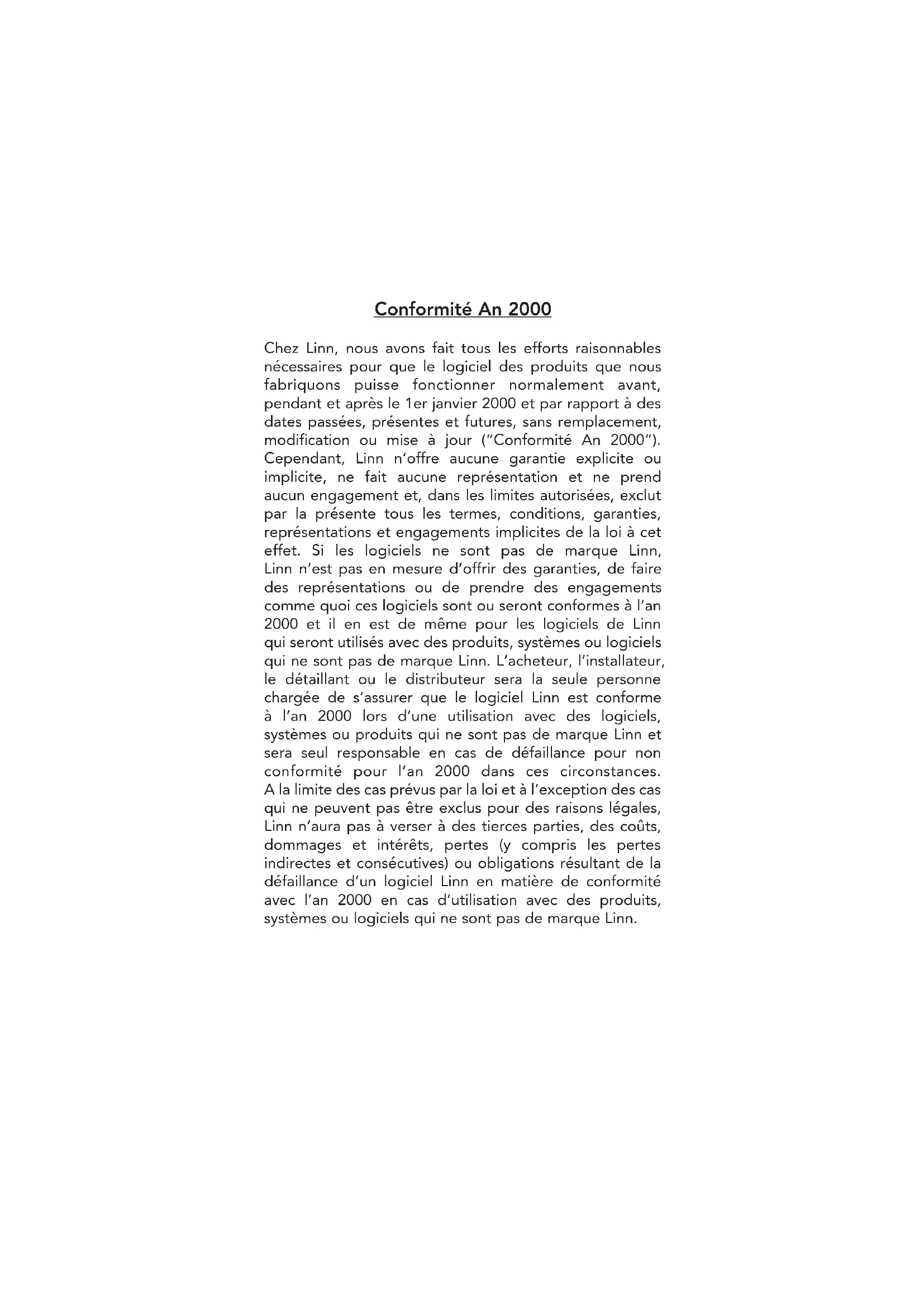 PREAMPLIFIER GUIDE DE L’UTILISATEURConformité An 2000 Chez Linn, nous avons fait tous les efforts raisonnables nécessaires pour que le logiciel des produits que nous fabriquons puisse fonctionner normalement avant, pendant et après le 1er janvier 2000 et par rapport à des dates passées, présentes et futures, sans remplacement, modification ou mise à jour (“Conformité An 2000”). Cependant, Linn n’offre aucune garantie explicite ou implicite, ne fait aucune représentation et ne prend aucun engagement et, dans les limites autorisées, exclut par la présente tous les termes, conditions, garanties, représentations et engagements implicites de la loi à cet effet. Si les logiciels ne sont pas de marque Linn, Linn n’est pas en mesure d’offrir des garanties, de faire des représentations ou de prendre des engagements comme quoi ces logiciels sont ou seront conformes à l’an 2000 et il en est de même pour les logiciels de Linn qui seront utilisés avec des produits, systèmes ou logiciels qui ne sont pas de marque Linn. L’acheteur, l’installateur, le détaillant ou le distributeur sera la seule personne chargée de s’assurer que le logiciel Linn est conforme à l’an 2000 lors d’une utilisation avec des logiciels, systèmes ou produits qui ne sont pas de marque Linn et sera seul responsable en cas de défaillance pour non conformité pour l’an 2000 dans ces circonstances. A la limite des cas prévus par la loi et à l’exception des cas qui ne peuvent pas être exclus pour des raisons légales, Linn n’aura pas à verser à des tierces parties, des coûts, dommages et intérêts, pertes (y compris les pertes indirectes et consécutives) ou obligations résultant de la défaillance d’un logiciel Linn en matière de conformité avec l’an 2000 en cas d’utilisation avec des produits, systèmes ou logiciels qui ne sont pas de marque Linn.i Instructions de sécurité Explication des symboles utilisés dans ce manuel et sur le produit␣ : Ce symbole avertit l’utilisateur de la présence d’une tension dangereuse localisée à l’intérieur du carter de l’appareil et pouvant être suffisamment élevée pour présenter un risque de choc électrique. Ce symbole informe l’utilisateur que ce manuel contient des instructions importantes concernant l’entretien et le dépannage. ATTENTION AFIN DE LIMITER LE RISQUE DE CHOC ELECTRIQUE, NE PAS RETIRER LE CAPOT. L’NTERIEUR NE COMPORTE QUE DES COMPOSANTS REPARABLES PAR UN SPECIALISTE. EN CAS DE PROBLEME CONTACTER UN REPARATEUR AGREE. AVIS␣ : RISQUE DE CHOC ELECTRIQUE. NE PAS OUVRIR. ATTENTION␣ : UTILISER UN FUSIBLE DE RECHANGE DE MEME TYPE. ATTENTION␣ : DEBRANCHER AVANT DE REMPLACER LE FUSIBLE. AVERTISSEMENT AFIN DE LIMITER LE RISQUE D’INCENDIE OU DE CHOC ELECTRIQUE, NE PAS EXPOSER CET APPAREIL A LA PLUIE OU A L’HUMIDITE. FICHES SECTEURS Cet appareil est livré avec une fiche secteur non démontable adaptée aux normes électriques du pays d’utilisation. Procurez-vous des cordons de secteur de remplacement auprès de votre revendeur Linn. Si vous devez remplacer la fiche, manipulez-la avec soin. Une fiche présentant des conducteurs nus est dangereuse si elle est branchée dans une prise sous tension. Le fil marron doit être connecté à la broche de ligne sous tension. Le fil bleu doit être connecté à la broche du neutre. Le fil vert/jaune doit être connecté à la broche de la masse. En cas de doute, veuillez contacter votre revendeur ou un électricien qualifié.ii