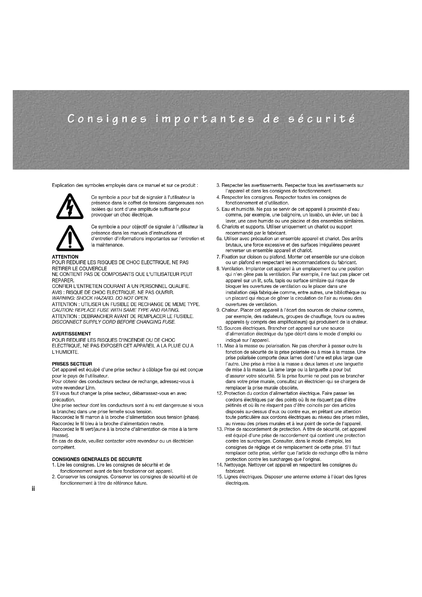 - IMPORTANTES CONSIGNES DE SECURITE. Remplacement des fusibles Cet appareil est équipé d'une prise secteur à câblage fixe de 13 A. Cette prise contient un fusible de 5 A. Si ce fusible saute, le remplacer en procédant comme suit : a) Tirer sur le couvercle/support rouge du fusible. b) Retirer et mettre au rebut le fusible qui a sauté. c) Mettre un fusible neuf agréé de 5 A conforme à la norme britannique BS1362 dans le support puis enfoncer de nouveau ce support dans la prise. Vérifier que le couvercle du fusible est toujours en position. Si ce couvercle manque, ne pas utiliser la prise. Contactez votre revendeur Linn pour obtenir un couvercle de fusible de rechange. Les fusibles assurent une protection contre les incendies mais pas contre les chocs électriques. Remplacement de la prise secteur S'il faut remplacer votre prise secteur et si vous avez les compétences nécessaires pour le faire, procédez comme suit. En cas de doute, contactez votre revendeur Linn ou un électricien compétent. a) Débrancher la prise de l'alimentation secteur. b) Trancher le câble de cette prise et se débarrasser de cette dernière en faisant très attention. Une prise secteur dont les conducteurs sont à nu est dangereuse si vous la branchez dans une prise femelle sous tension. c) Monter uniquement une prise secteur de 13 A agréée en conformité avec la norme britannique BS1363A et équipée d'un fusible de 5 A. d) La couleur de chaque fil du câble ou une lettre est gravée aux points de raccordement de la plupart des prises de qualité. Fixer soigneusement chaque fil sur son point de raccordement. Le fil marron doit aboutir à la broche de phase, le fil bleu à la broche neutre et le fil vert/jaune à la broche de mise à la terre. e) Avant de remettre le couvercle de la prise, s'assurer que la retenue du câble immobilise la gaine externe du câble et que les fils sont bien branchés. AVERTISSEMENT CET APPAREIL DOIT ETRE MIS A LA MASSE. Remplacement du fusible Si le fusible secteur saute, le remplacer par un composant équivalent. Le porte-fusible se trouve sous la prise femelle d'alimentation secteur. Pour remplacer le fusible, débrancher l'appareil de l'alimentation secteur. Utiliser un tournevis à lame plate pour déposer et remplacer le fusible. Si le fusible saute une deuxième fois, cela indique la présence d'une anomalie dans l'appareil. Contactez votre revendeur. Pouvoirs de coupure des fusibles. Consulter les caractéristiques techniques. Plage opérationnelle de la tension secteur. Consulter les caractéristiques techniques. Avertissement !! Le branchement en 230 V d'un appareil conçu pour un fonctionnement en 115 V risque de détruire l'alimentation électrique. Déclaration de conformité de la CE Linn Products Ltd déclare que cet appareil est conforme à la directive 73/23/CEE sur la basse tension et à la directive 89/336/CEE sur la compatibilité électromagnétique, directives modifiées par 92/31/CEE et 93/68/CEE. La conformité de l'appareil désigné aux clauses de la directive 73/23/CEE (directive sur la basse tension) est confirmée par le respect des normes suivantes : Numéro de norme Date de publication Type d'essai EN60065 1993 Caractéristiques générales Marquage Ionisation Chauffage en présence de conditions normales Risques de chocs en présence de conditions normales Critères d'isolement Anomalies Résistance mécanique Pièces raccordées au courant secteur Composants Terminaisons Cordons souples externes Branchements électriques et fixations mécaniques La conformité de l'appareil désigné aux clauses de la directive 89/336/CEE (comptabilité électromagnétique) est confirmée par le respect des normes suivantes : Numéro de norme Date de publication Type d'essai EN55013 1994 Emissions conduites EN55013 1994 Emissions absorbées EN60555-2 1987 Harmoniques EN60555-3 1987 Fluctuations de la tension EN55020 1994 Immunité Avis de FCC REMARQUE : Après essai, cet appareil a été déclaré conforme aux limites d'un dispositif numérique de classe B, en conformité avec la Partie 15 des règles de la FCC. Ces limites, de par leur conception, doivent assurer une protection raisonnable contre les parasites dangereux dans une installation résidentielle. Cet appareil produit, utilise et peut rayonner une énergie en radiofréquence et, s'il n'est pas installé et utilisé en conformité avec ces consignes, risque de produire des parasites gênants sur les communications radio. Cependant, rien ne saurait garantir qu'une installation particulière ne puisse pas produire de parasites. Si cet appareil produit des parasites qui gênent la réception radio ou télévision, comme le confirme l'arrêt puis la remise en marche de cet appareil, nous encourageons l'utilisateur à essayer de corriger ces parasites en prenant une ou plusieurs des mesures suivantes : – Modifier l'orientation ou l'emplacement de l'antenne de réception. – Augmenter la distance entre cet appareil et le récepteur. – Brancher cet appareil sur une prise murale utilisant un circuit différent de celui du récepteur. – Demander l'aide du revendeur ou d'un technicien radiotélévision expérimenté. iiiCopyright © Linn Products Limited. Linn Products Limited, Floors Road, Waterfoot, Glasgow, G76 0EP, Ecosse, Royaume-Uni. Tous droits réservés. Aucune partie de cette publication ne peut être reproduite, conservée dans un système de recouvrement ou transmise, sous quelque forme que ce soit (électronique, mécanique, par photocopie, par enregistrement ou autrement) sans l'accord préalable par écrit de l'éditeur. Imprimé au Royaume-Uni. Sondek est une marque de fabrique de Linn Products Limited. HDCD et High Definition Compatible Digital sont des marques de fabrique déposées de Pacific Microsonics, Inc., Brevet n° 5479168. ST est une marque de fabrique déposée d'AT&T. TOSLINK est une marque de fabrique de Toshiba Corporation. Les renseignements que contient ce manuel so
