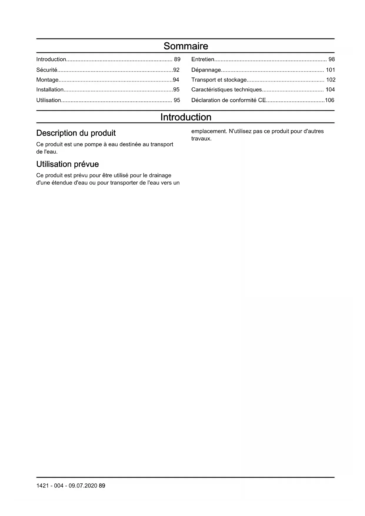 - Déclaration de conformité CE Introduction Description du produit Ce produit est une pompe à eau destinée au transport de l'eau. Utilisation prévue Ce produit est prévu pour être utilisé pour le drainage d'une étendue d'eau ou pour transporter de l'eau vers un emplacement. N'utilisez pas ce produit pour d'autres travaux. 1421 - 004 - 09.07.2020 89Aperçu du produit p. 106