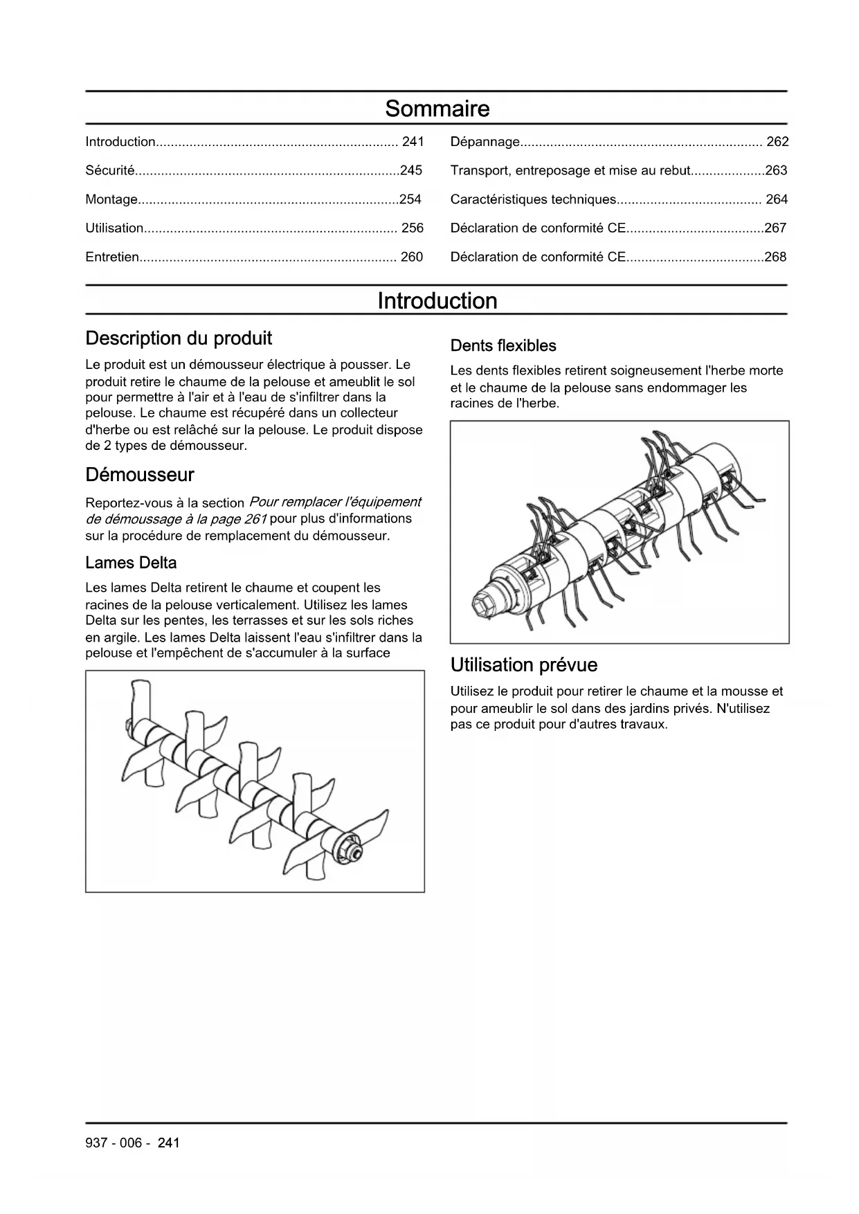 - Déclaration de conformité CE Introduction Description du produit Le produit est un démousseur électrique à pousser. Le produit retire le chaume de la pelouse et ameublit le sol pour permettre à l'air et à l'eau de s'infiltrer dans la pelouse. Le chaume est récupéré dans un collecteur d'herbe ou est relâché sur la pelouse. Le produit dispose de 2 types de démousseur. Démousseur Reportez-vous à la section Pour remplacer l'équipement de démoussage à la page 261 pour plus d'informations sur la procédure de remplacement du démousseur. Lames Delta Les lames Delta retirent le chaume et coupent les racines de la pelouse verticalement. Utilisez les lames Delta sur les pentes, les terrasses et sur les sols riches en argile. Les lames Delta laissent l'eau s'infiltrer dans la pelouse et l'empêchent de s'accumuler à la surface Dents flexibles Les dents flexibles retirent soigneusement l'herbe morte et le chaume de la pelouse sans endommager les racines de l'herbe. Utilisation prévue Utilisez le produit pour retirer le chaume et la mousse et pour ameublir le sol dans des jardins privés. N'utilisez pas ce produit pour d'autres travaux. p. 268