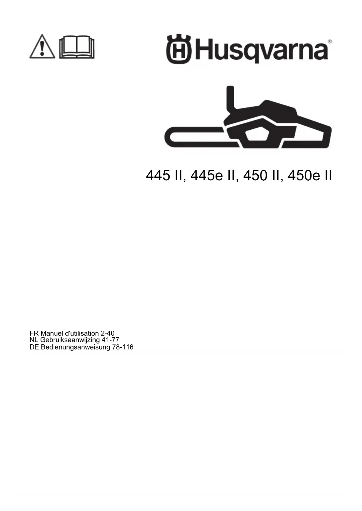 - Déclaration de conformité CE Introduction Description du produit Les Husqvarna 445 II, 445e II, 450 II, 450e II sont des modèles de tronçonneuses équipées d'un moteur à combustion. Nous travaillons en permanence à l'amélioration de votre sécurité et de votre efficacité pendant l'utilisation. Pour davantage d'informations, contactez votre atelier d'entretien. Utilisation prévue Cette tronçonneuse pour services forestiers est conçue pour des travaux forestiers tels que l'abattage, l'élagage et la coupe. Remarque: La législation nationale peut imposer des limites à l'utilisation du produit. Aperçu du produit p. 40