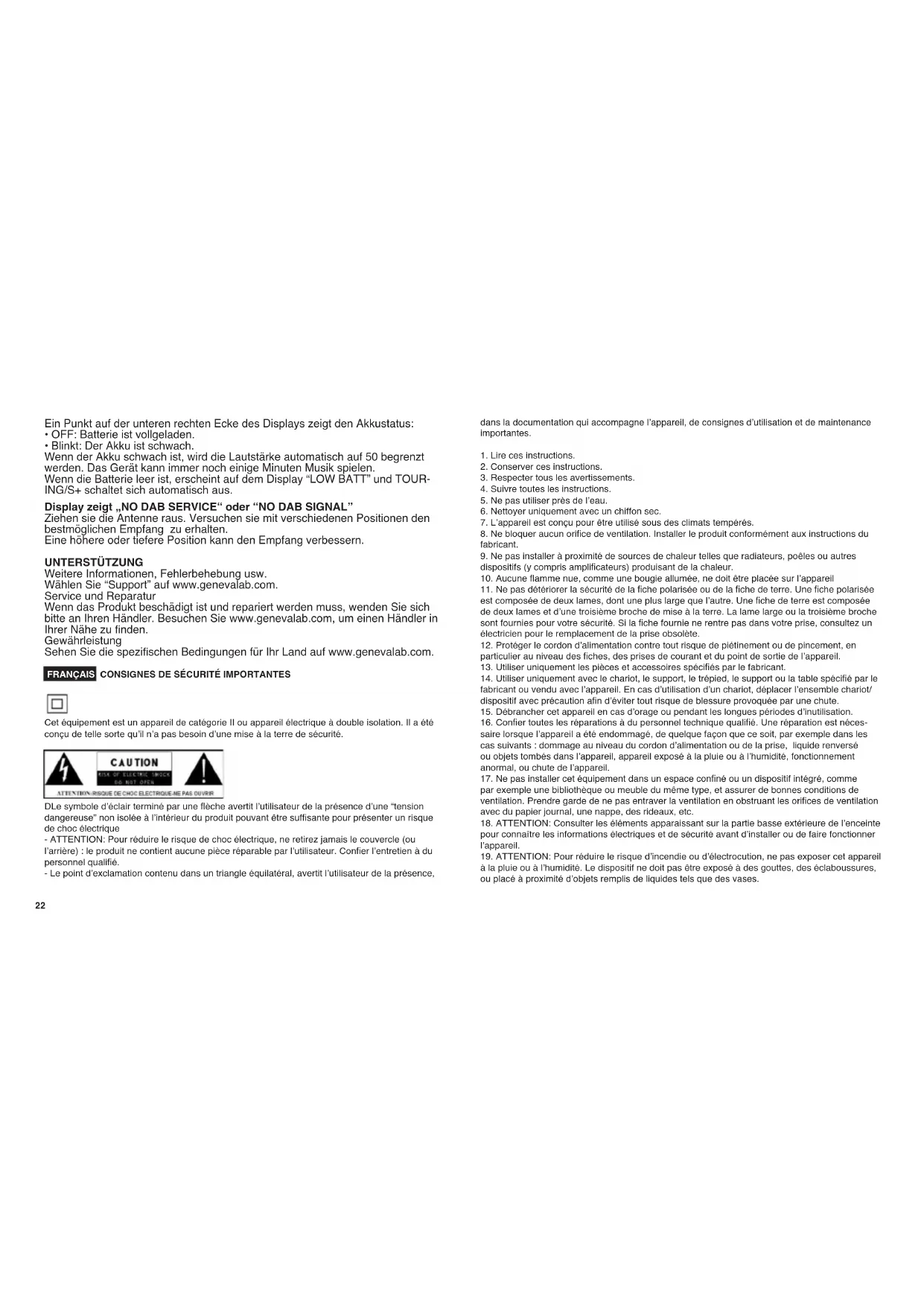 - Clignotant : batterie faible. Lorsque la batterie est faible, le volume est automatiquement limité à 50. L’unité peut continuer de lire de la musique pendant quelques minutes. Si la batterie est vide, l’écran afche la mention “LOW BATT” et le TOURING/S+ s’éteint automatiquement. L’écran afche « NO DAB SERVICE » ou « NO DAB SIGNAL ». Tirez l’antenne et essayer de trouver sa meilleure position pour optimiser la réception du signal. Les positions en hauteur ou près d’une fenêtre améliorent la qualité de réception. ASSISTANCE Plus d’informations, dépannage, etc. Sélectionnez « Assistance » sur www.genevalab.com. Entretien et réparation Si le produit est endommagé et doit être réparé, veuillez contacter votre revendeur. Pour trouver un revendeur dans votre région, consultez la page www. genevalab.com Garantie Consultez les conditions spéciques à votre pays sur www.genevalab.com.