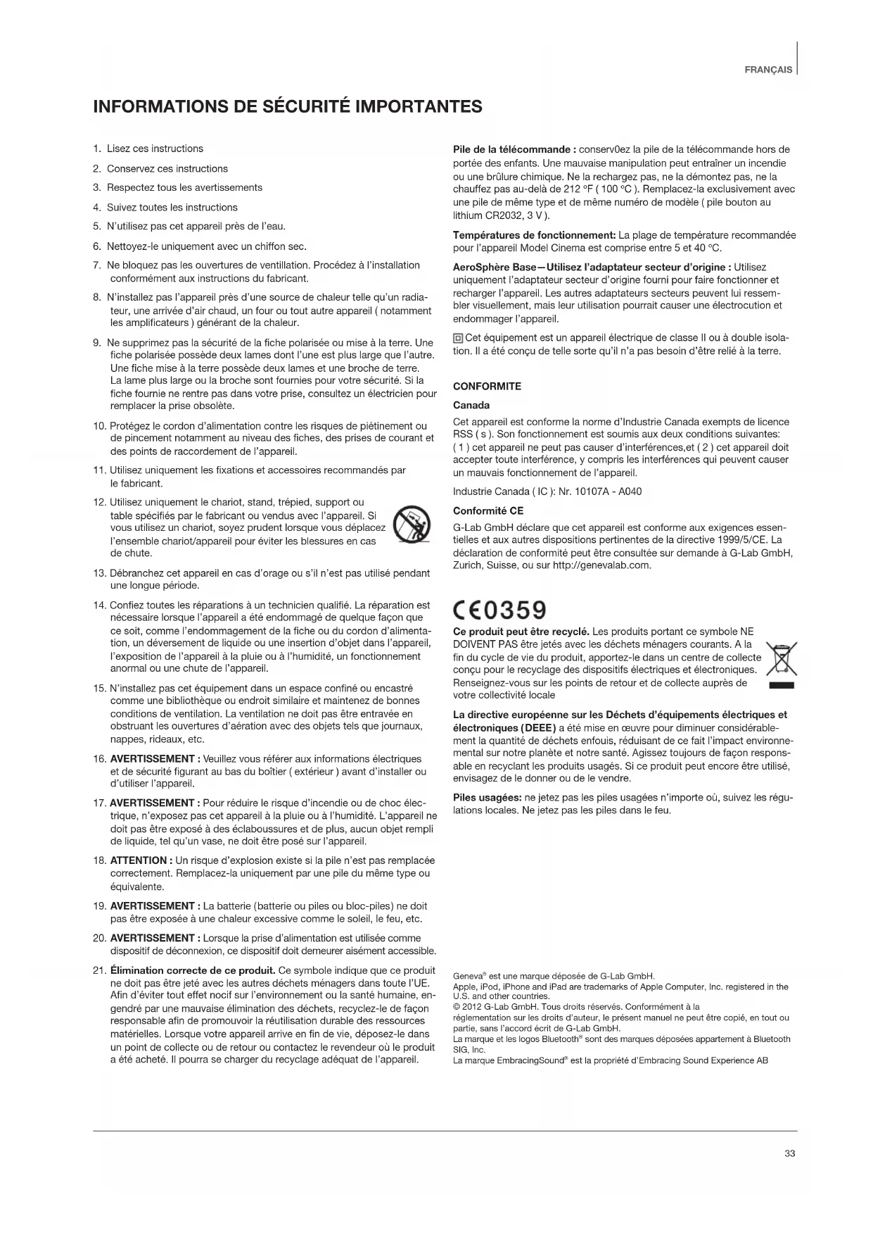 ne doit pas être jeté avec les autres déchets ménagers dans toute l’UE. Afin d’éviter tout effet nocif sur l’environnement ou la santé humaine, en- gendré par une mauvaise élimination des déchets, recyclez-le de façon responsable afin de promouvoir la réutilisation durable des ressources matérielles. Lorsque votre appareil arrive en fin de vie, déposez-le dans un point de collecte ou de retour ou contactez le revendeur où le produit a été acheté. Il pourra se charger du recyclage adéquat de l’appareil. Pile de la télécommande : conserv0ez la pile de la télécommande hors de portée des enfants. Une mauvaise manipulation peut entraîner un incendie ou une brûlure chimique. Ne la rechargez pas, ne la démontez pas, ne la chauffez pas au-delà de 212 ºF ( 100 ºC ). Remplacez-la exclusivement avec une pile de même type et de même numéro de modèle ( pile bouton au lithium CR2032, 3 V ). Températures de fonctionnement: La plage de température recommandée pour l’appareil Model Cinema est comprise entre 5 et 40 ºC. AeroSphère Base—Utilisez l’adaptateur secteur d’origine : Utilisez uniquement l’adaptateur secteur d’origine fourni pour faire fonctionner et recharger l’appareil. Les autres adaptateurs secteurs peuvent lui ressem- bler visuellement, mais leur utilisation pourrait causer une électrocution et endommager l’appareil. Cet équipement est un appareil électrique de classe II ou à double isola- tion. Il a été conçu de telle sorte qu’il n’a pas besoin d’être relié à la terre. CONFORMITE Canada Cet appareil est conforme la norme d’Industrie Canada exempts de licence RSS ( s ). Son fonctionnement est soumis aux deux conditions suivantes: ( 1 ) cet appareil ne peut pas causer d’interférences,et ( 2 ) cet appareil doit accepter toute interférence, y compris les interférences qui peuvent causer un mauvais fonctionnement de l’appareil. Industrie Canada ( IC ): Nr. 10107A - A040 Conformité CE G-Lab GmbH déclare que cet appareil est conforme aux exigences essen- tielles et aux autres dispositions pertinentes de la directive 1999/5/CE. La déclaration de conformité peut être consultée sur demande à G-Lab GmbH, Zurich, Suisse, ou sur http://genevalab.com. Ce produit peut être recyclé. Les produits portant ce symbole NE DOIVENT PAS être jetés avec les déchets ménagers courants. A la fin du cycle de vie du produit, apportez-le dans un centre de collecte conçu pour le recyclage des dispositifs électriques et électroniques. Renseignez-vous sur les points de retour et de collecte auprès de votre collectivité locale La directive européenne sur les Déchets d’équipements électriques et électroniques ( DEEE ) a été mise en œuvre pour diminuer considérable- ment la quantité de déchets enfouis, réduisant de ce fait l’impact environne- mental sur notre planète et notre santé. Agissez toujours de façon respons- able en recyclant les produits usagés. Si ce produit peut encore être utilisé, envisagez de le donner ou de le vendre. Piles usagées: ne jetez pas les piles usagées n’importe où, suivez les régu- lations locales. Ne jetez pas les piles dans le feu. Geneva