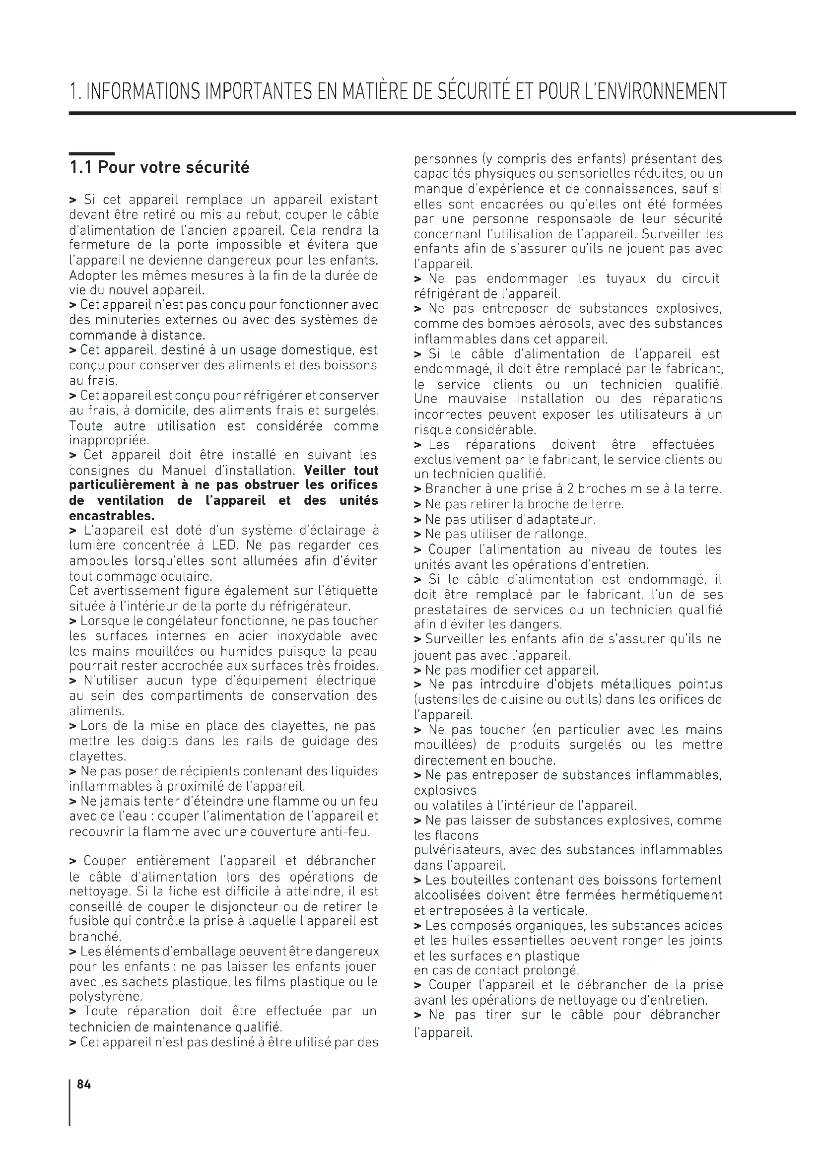 > Si cet appareil remplace un appareil existant devant être retiré ou mis au rebut, couper le câble d’alimentation de l’ancien appareil. Cela rendra la fermeture de la porte impossible et évitera que l’appareil ne devienne dangereux pour les enfants. Adopter les mêmes mesures à la fin de la durée de vie du nouvel appareil. > Cet appareil n’est pas conçu pour fonctionner avec des minuteries externes ou avec des systèmes de commande à distance. > Cet appareil, destiné à un usage domestique, est conçu pour conserver des aliments et des boissons au frais. > Cet appareil est conçu pour réfrigérer et conserver au frais, à domicile, des aliments frais et surgelés. Toute autre utilisation est considérée comme inappropriée. > Cet appareil doit être installé en suivant les consignes du Manuel d’installation. Veiller tout particulièrement à ne pas obstruer les orifices de ventilation de l’appareil et des unités encastrables. > L’appareil est doté d’un système d’éclairage à lumière concentrée à LED. Ne pas regarder ces ampoules lorsqu’elles sont allumées afin d’éviter tout dommage oculaire. Cet avertissement figure également sur l’étiquette située à l’intérieur de la porte du réfrigérateur. > Lorsque le congélateur fonctionne, ne pas toucher les surfaces internes en acier inoxydable avec les mains mouillées ou humides puisque la peau pourrait rester accrochée aux surfaces très froides. > N’utiliser aucun type d’équipement électrique au sein des compartiments de conservation des aliments. > Lors de la mise en place des clayettes, ne pas mettre les doigts dans les rails de guidage des clayettes. > Ne pas poser de récipients contenant des liquides inflammables à proximité de l’appareil. > Ne jamais tenter d’éteindre une flamme ou un feu avec de l’eau: couper l’alimentation de l’appareil et recouvrir la flamme avec une couverture anti-feu. > Couper entièrement l’appareil et débrancher le câble d’alimentation lors des opérations de nettoyage. Si la fiche est dicile à atteindre, il est conseillé de couper le disjoncteur ou de retirer le fusible qui contrôle la prise à laquelle l’appareil est branché. > Les éléments d’emballage peuvent être dangereux pour les enfants: ne pas laisser les enfants jouer avec les sachets plastique, les films plastique ou le polystyrène. > Toute réparation doit être eectuée par un technicien de maintenance qualifié. > Cet appareil n’est pas destiné à être utilisé par des personnes (y compris des enfants) présentant des capacités physiques ou sensorielles réduites, ou un manque d’expérience et de connaissances, sauf si elles sont encadrées ou qu’elles ont été formées par une personne responsable de leur sécurité concernant l’utilisation de l’appareil. Surveiller les enfants afin de s’assurer qu’ils ne jouent pas avec l’appareil. > Ne pas endommager les tuyaux du circuit réfrigérant de l’appareil. > Ne pas entreposer de substances explosives, comme des bombes aérosols, avec des substances inflammables dans cet appareil. > Si le câble d’alimentation de l’appareil est endommagé, il doit être remplacé par le fabricant, le service clients ou un technicien qualifié. Une mauvaise installation ou des réparations incorrectes peuvent exposer les utilisateurs à un risque considérable. > Les réparations doivent être eectuées exclusivement par le fabricant, le service clients ou un technicien qualifié. > Brancher à une prise à 2broches mise à la terre. > Ne pas retirer la broche de terre. > Ne pas utiliser d’adaptateur. > Ne pas utiliser de rallonge. > Couper l’alimentation au niveau de toutes les unités avant les opérations d’entretien. > Si le câble d’alimentation est endommagé, il doit être remplacé par le fabricant, l’un de ses prestataires de services ou un technicien qualifié afin d’éviter les dangers. > Surveiller les enfants afin de s’assurer qu’ils ne jouent pas avec l’appareil. > Ne pas modifier cet appareil. > Ne pas introduire d’objets métalliques pointus (ustensiles de cuisine ou outils) dans les orifices de l’appareil. > Ne pas toucher (en particulier avec les mains mouillées) de produits surgelés ou les mettre directement en bouche. > Ne pas entreposer de substances inflammables, explosives ou volatiles à l’intérieur de l’appareil. > Ne pas laisser de substances explosives, comme les flacons pulvérisateurs, avec des substances inflammables dans l’appareil. > Les bouteilles contenant des boissons fortement alcoolisées doivent être fermées hermétiquement et entreposées à la verticale. > Les composés organiques, les substances acides et les huiles essentielles peuvent ronger les joints et les surfaces en plastique en cas de contact prolongé. > Couper l’appareil et le débrancher de la prise avant les opérations de nettoyage ou d’entretien. > Ne pas tirer sur le câble pour débrancher l’appareil.