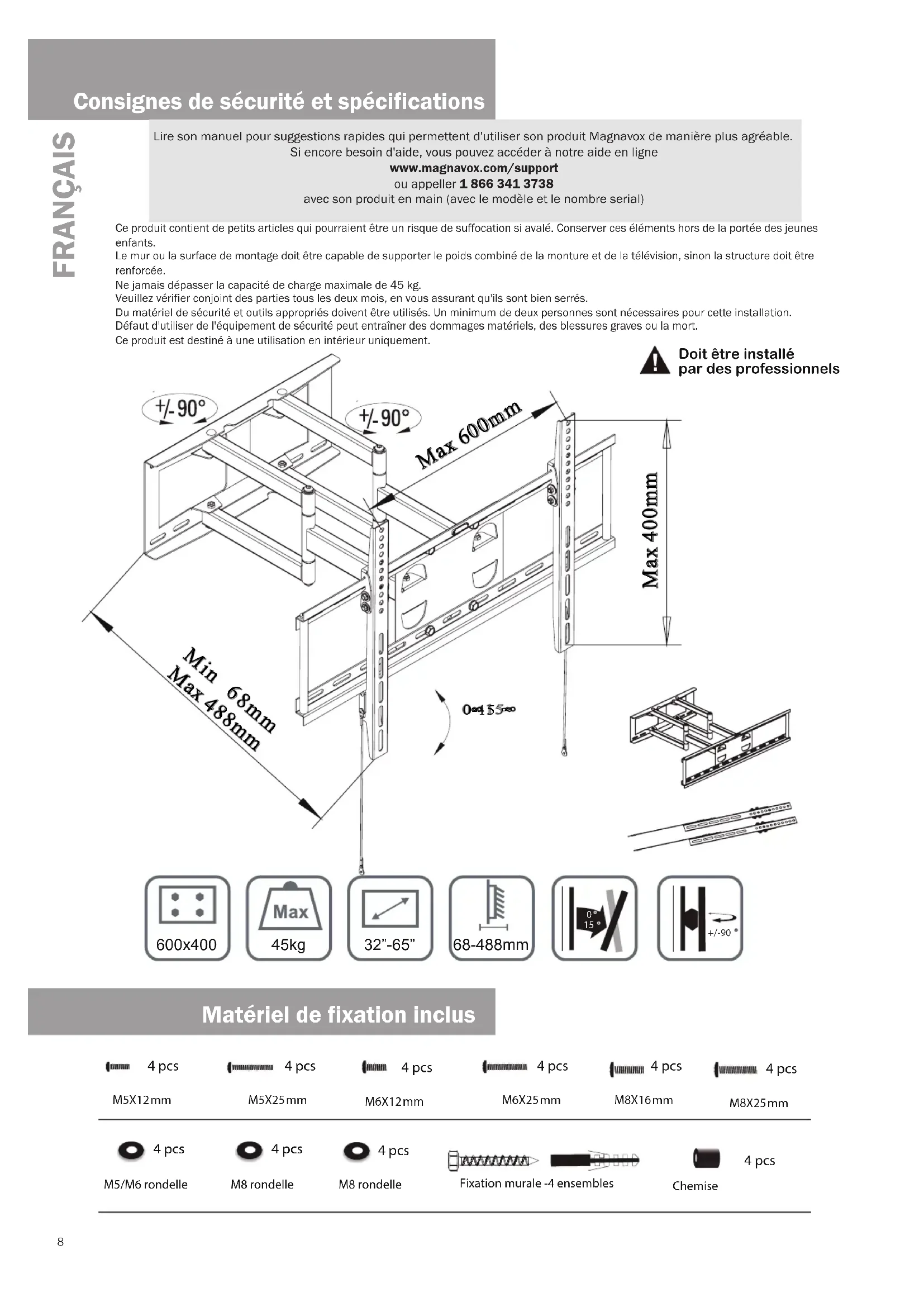 Téléchargez la notice de votre Support mural pour téléviseur au format PDF gratuitement ! Retrouvez votre notice MFM00524 - MAGNAVOX et reprennez votre appareil électronique en main. Sur cette page sont publiés tous les documents nécessaires à l'utilisation de votre appareil MFM00524 de la marque MAGNAVOX.