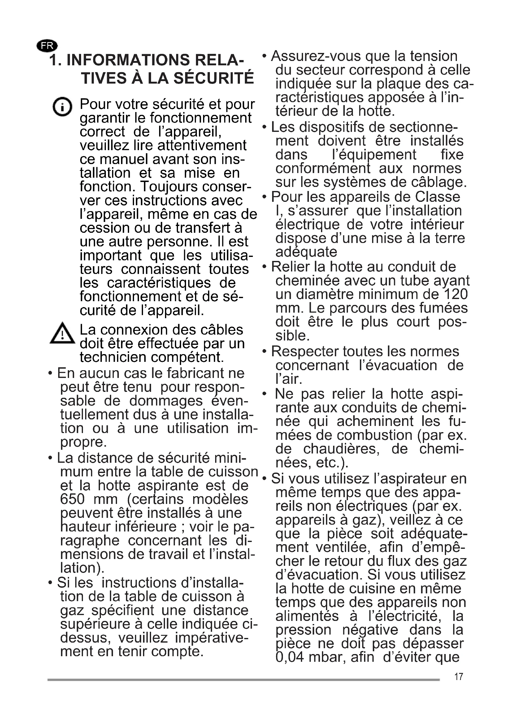Assurez-vous que la tension du secteur correspond à celle indiquée sur la plaque des caractéristiques apposée à l'intérieur de la hotte. - Les dispositifs de sectionnement doivent être installés dans l'équipement fixe conformément aux normes sur les systèmes de câblage. Pour les appareils de Classe I, s'assurer que l'installation électrique de votre intérieur dispose d'une mise à la terre ajustée. - Relier la hotte au conduit de cheminée avec un tube ayant un diamètre minimum de 120 mm. Le parcours des fumées doit être le plus court possible. - Respecter toutes les normes concernant l'évacuation de l'air. - Ne pas relier la hotte aspirante aux conduits de cheminée qui acheminent les fumées de combustion (par ex. de chaudières, de cheminées, etc.). - Si vous utilisez l'aspirateur en même temps que des appareils non électriques (par ex. appareils à gaz), veillez à ce que la pièce soit adéquatement ventilée, afin d'empêcher le retour du flux des gaz d'évacuation. Si vous utilisez la hotte de cuisine en même temps que des appareils non alimentés à l'électricité, la pression négative dans la pièce ne doit pas dépasser 0,04 mbar, afin d'éviter que