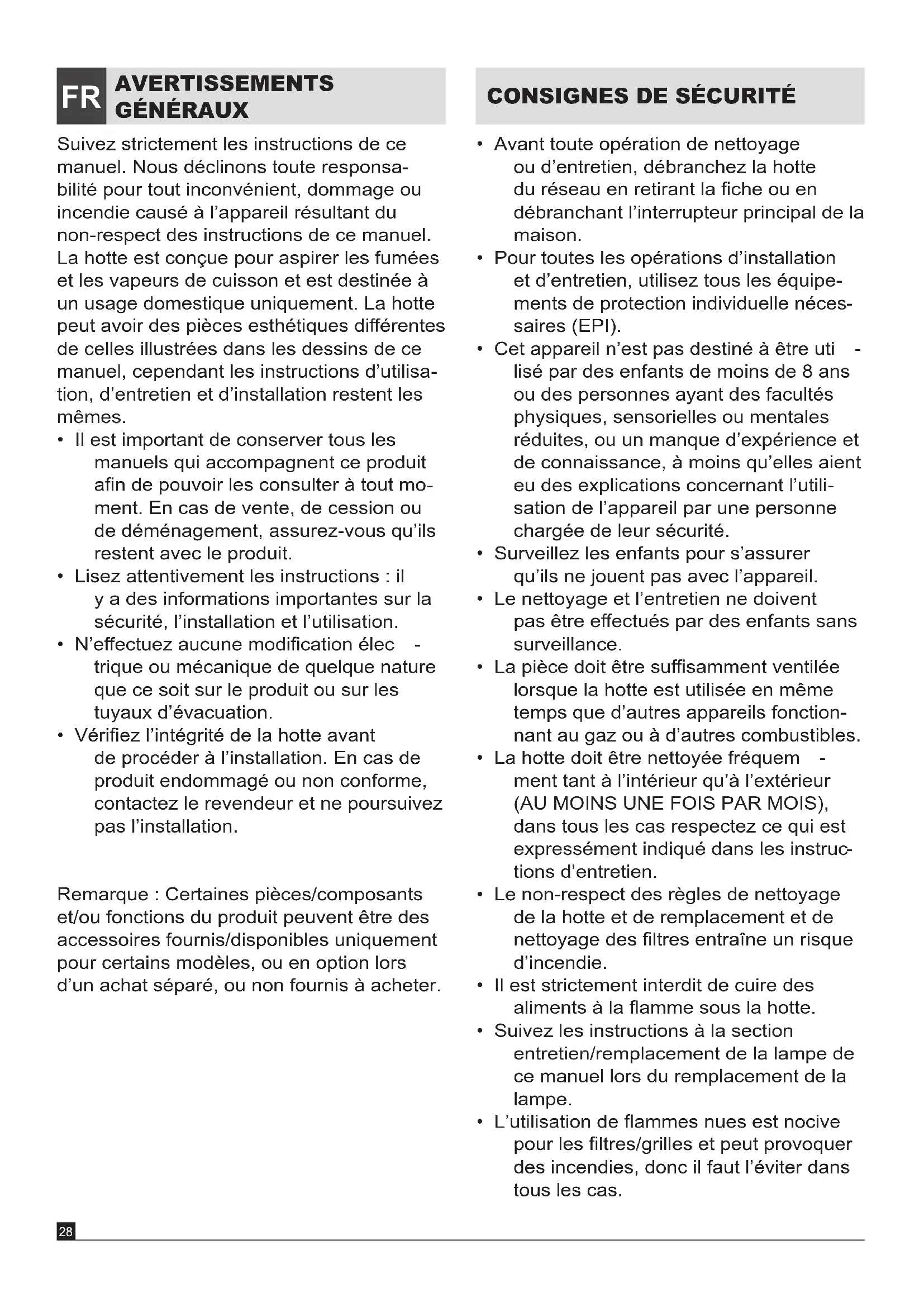 bilité pour tout inconvénient, dommage ou incendie causé à l’appareil résultant du non-respect des instructions de ce manuel. La hotte est conçue pour aspirer les fumées et les vapeurs de cuisson et est destinée à un usage domestique uniquement. La hotte peut avoir des pièces esthétiques diérentes de celles illustrées dans les dessins de ce manuel, cependant les instructions d’utilisa