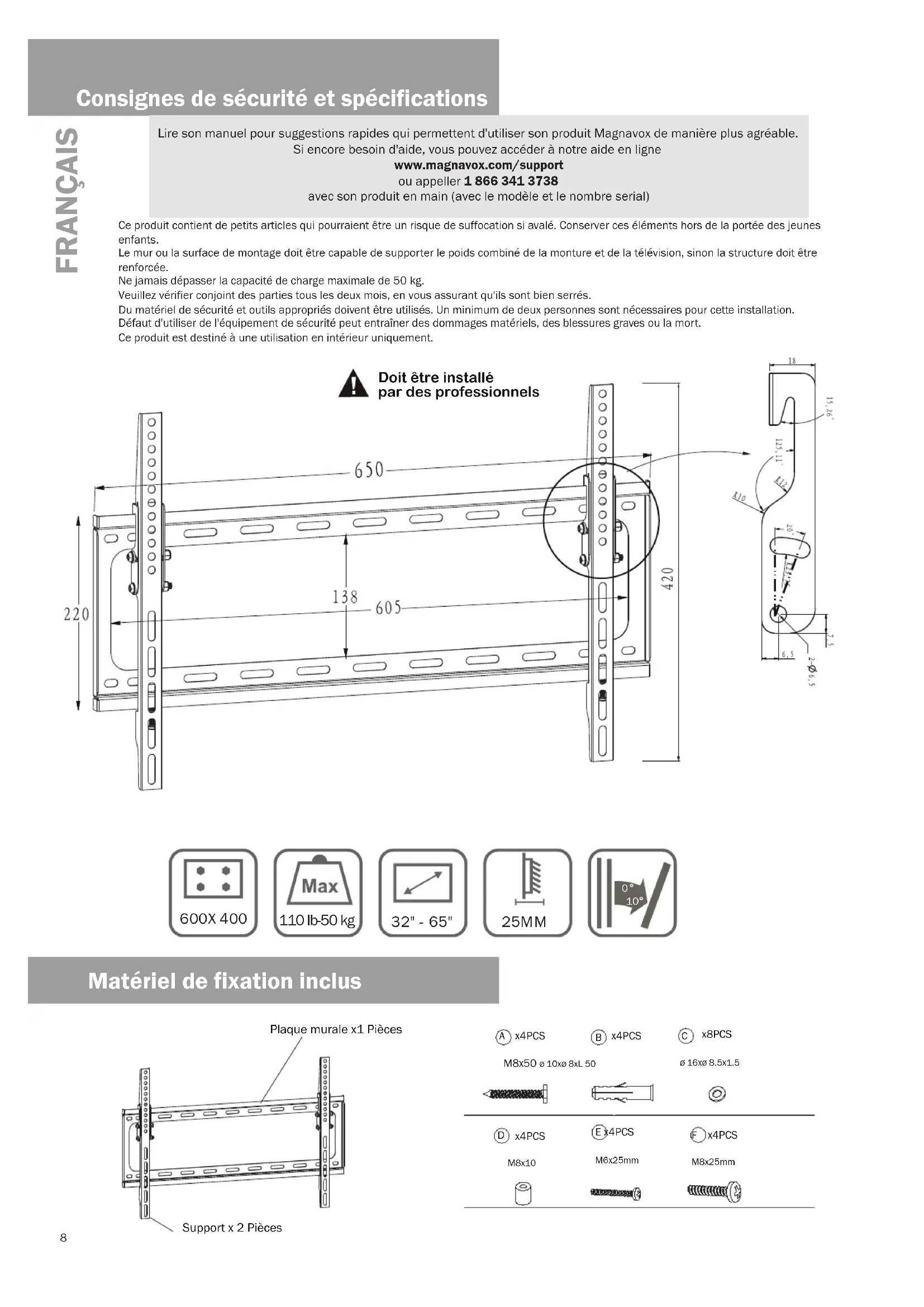 muro muroConsignes de sécurité et spécifications Lire son manuel pour suggestions rapides qui permettent d'utiliser son produit Magnavox de manière plus agréable. Si encore besoin d'aide, vous pouvez accéder à notre aide en ligne www.magnavox.com/support ou appeller 1 866 341 3738 avec son produit en main (avec le modèle et le nombre serial) Ce produit contient de petits articles qui pourraient être un risque de suffocation si avalé. Conserver ces éléments hors de la portée des jeunes enfants. Le mur ou la surface de montage doit être capable de supporter le poids combiné de la monture et de la télévision, sinon la structure doit être renforcée.Ne jamais dépasser la capacité de charge maximale de 50 kg.Veuillez vérifier conjoint des parties tous les deux mois, en vous assurant qu'ils sont bien serrés. Du matériel de sécurité et outils appropriés doivent être utilisés. Un minimum de deux personnes sont nécessaires pour cette installation. Défaut d'utiliser de l'équipement de sécurité peut entraîner des dommages matériels, des blessures graves ou la mort. Ce produit est destiné à une utilisation en intérieur uniquement. Doit être installé par des professionnels FRANÇAIS Matériel de fixation inclus