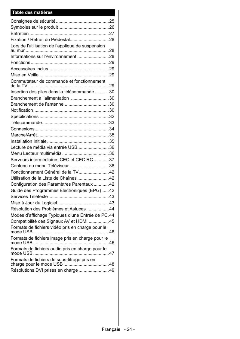 Symboles sur le produit26 Entretien27 Fixation / Retrait du Piédestal28 Lors de l'utilisation de l’applique de suspension au mur28 Informations sur l'environnement28 Fonctions29 Accessoires Inclus29 Mise en Veille29 Commutateur de commande et fonctionnement de la TV29 Insertion des piles dans la télécommande30 Branchement à l'alimentation 30 Branchement de l’antenne30 Notification30 Spécifications32 Télécommande33 Utilisation de la Liste de Chaînes42 Configuration des Paramètres Parentaux42 Guide des Programmes Électroniques (EPG)42 Services Télétexte43 Mise à Jour du Logiciel43 Résolution des Problèmes et Astuces44 Modes d’affichage Typiques d’une Entrée de PC.. 44 Compatibilité des Signaux AV et HDMI45 Formats de fichiers vidéo pris en charge pour le mode USB46 Formats de fichiers image pris en charge pour le mode USB46 Formats de fichiers audio pris en charge pour le mode USB47 Formats de fichiers de sous-titrage pris en charge pour le mode USB48 Résolutions DVI prises en charge49