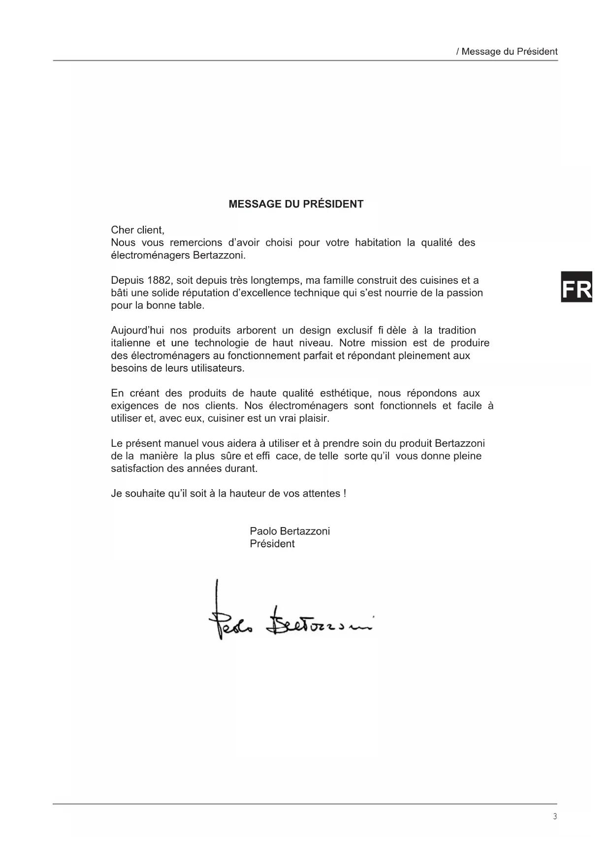 Cher client, Nous vous remercions d’avoir choisi pour votre habitation la qualité des électroménagers Bertazzoni. Depuis 1882, soit depuis très longtemps, ma famille construit des cuisines et a bâti une solide réputation d’excellence technique qui s’est nourrie de la passion pour la bonne table. Aujourd’hui nos produits arborent un design exclusif fi dèle à la tradition italienne et une technologie de haut niveau. Notre mission est de produire des électroménagers au fonctionnement parfait et répondant pleinement aux besoins de leurs utilisateurs. En créant des produits de haute qualité esthétique, nous répondons aux exigences de nos clients. Nos électroménagers sont fonctionnels et facile à utiliser et, avec eux, cuisiner est un vrai plaisir. Le présent manuel vous aidera à utiliser et à prendre soin du produit Bertazzoni de la manière la plus sûre et effi cace, de telle sorte qu’il vous donne pleine satisfaction des années durant. Je souhaite qu’il soit à la hauteur de vos attentes ! Paolo Bertazzoni Président4