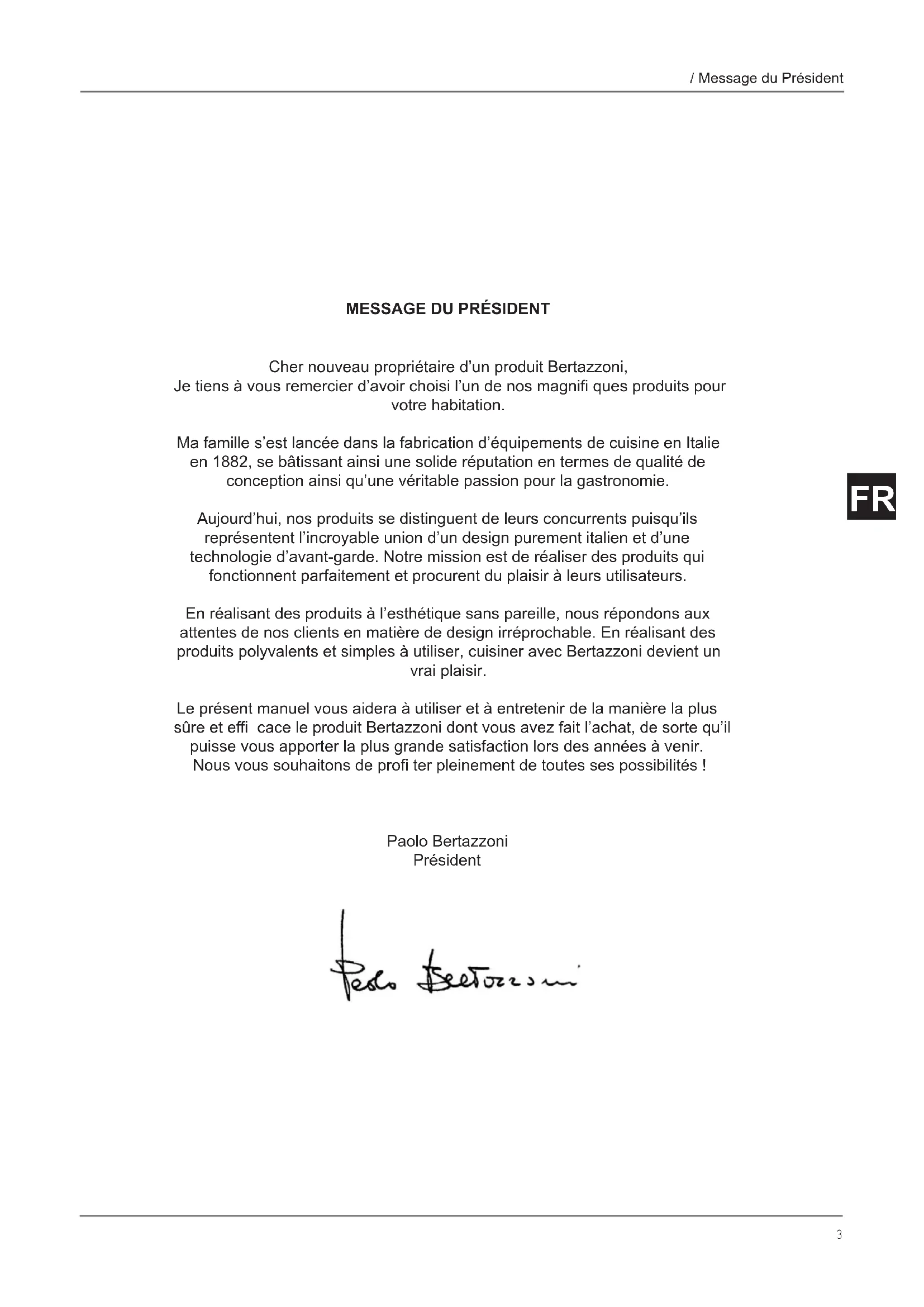Cher nouveau propriétaire d’un produit Bertazzoni, Je tiens à vous remercier d’avoir choisi l’un de nos magnifi ques produits pour votre habitation. Ma famille s’est lancée dans la fabrication d’équipements de cuisine en Italie en 1882, se bâtissant ainsi une solide réputation en termes de qualité de conception ainsi qu’une véritable passion pour la gastronomie. Aujourd’hui, nos produits se distinguent de leurs concurrents puisqu’ils représentent l’incroyable union d’un design purement italien et d’une technologie d’avant-garde. Notre mission est de réaliser des produits qui fonctionnent parfaitement et procurent du plaisir à leurs utilisateurs. En réalisant des produits à l’esthétique sans pareille, nous répondons aux attentes de nos clients en matière de design irréprochable. En réalisant des produits polyvalents et simples à utiliser, cuisiner avec Bertazzoni devient un vrai plaisir. Le présent manuel vous aidera à utiliser et à entretenir de la manière la plus sûre et effi cace le produit Bertazzoni dont vous avez fait l’achat, de sorte qu’il puisse vous apporter la plus grande satisfaction lors des années à venir. Nous vous souhaitons de profi ter pleinement de toutes ses possibilités ! Paolo Bertazzoni Président4