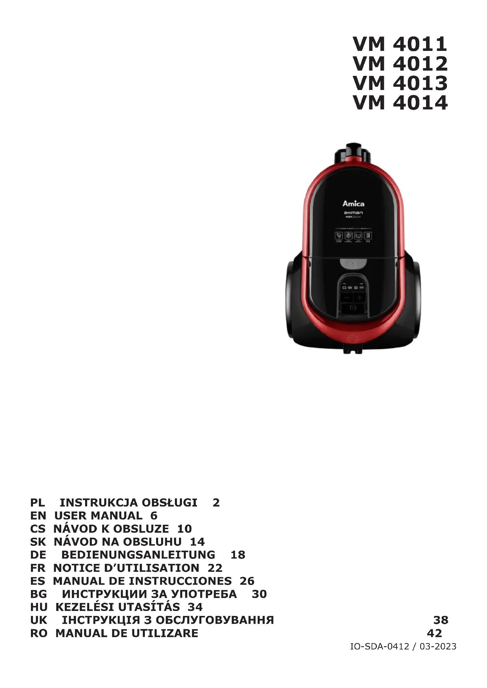- Pour éteindre complètement l’appareil, rerer la che de la prise. Cet appareil est marqué par le symbole du conteneur à déchets, rayé, conformément à la Direcve Européenne 2012/19/CE et à la Loi polonaise sur les appareils élec- triques et électroniques usagés. Ce symbole signale que le produit, après sa période d’ulisaon, ne pourra pas être éliminé avec d’autres déchets ménagers. L'ulisateur est obligé de le rendre à un point de collecte des appareils électriques et électroniques usagés. De tels points de collecte sont mis en place par les communes, certains magasins et entreprises de ramassage des déchets. Respecter les règles d’éliminaon des appa- reils électriques et électroniques permet d’éviter des conséquences nuisibles à la santé humaine et à l’environnement naturel, à cause de la possibilité de présence de constuants dangereux ou de trans- formaons inappropriées à ce type d’appareil. Lire aenvement le présent mode d’emploi avant d’uliser l’appa- reil. L’appareil est exclusivement desné à un usage domesque. Aenon ! Lors du déballage, garder les matériaux d’emballage (pe- ts sacs en polyéthylène, morceaux de polystyrène, etc.) hors de portée des enfants. Les enfants n’ont pas conscience des dangers que peut entraîner l’ulisaon des appareils électriques ; pour cee raison, garder l’ap- pareil hors de portée des enfants. Ne pas immerger l’appareil dans de l’eau ou d’autres liquides. L’im- mersion dans l’eau peut causer un choc électrique. En cas de déversement d’eau sur les éléments extérieurs de l’ap- pareil, sécher soigneusement l’appareil avant de le brancher à l’alimentaon électrique. Ne pas toucher les surfaces mouillées au contact avec l’appareil branché à l’alimentaon électrique ; débran- cher immédiatement l’appareil de l’alimentaon électrique. En rerant la che de la prise murale, ne jamais rer sur le cordon, uniquement sur la che tout en tenant la prise secteur de l’autre main. Ne pas essayer de rerer des pièces du boîer. L’ulisaon d’accessoires qui n’ont pas été fournis avec le produit peut endommager l’appareil. Ne jamais placer l’appareil sur des surfaces chaudes. Ne pas placer le cordon d’alimentaon sur des arêtes vives ou à proximité de surfaces chaudes. Avant d’insérer la che à la prise d’alimentaon assurezvous que vos mains sont sèches. Ne placer aucun objet à l’intérieur de l’appareil. Vérier si la tension indiquée sur la plaque signaléque correspond aux paramètres de l’alimentaon électrique à la maison, tout en s’assurant que cee alimentaon est marquée par ~ (courant alter- naf). L’appareil est desné à être ulisé à domicile ou dans des lieux tels FR23 que : la cuisine pour les employés ; les bouques, les bureaux et autres environnements de travail, ulisaon par les clients d’hôtels, de motels et d’autres lieux d’habitaon, de bâments habitables ru- raux, d’édices d’hébergement ; Rerer la che de la prise d’alimentaon avant de changer les ac- cessoires. Ne pas rer l’aspirateur et ne pas le déplacer en saisissant le câble, ne pas uliser le câble comme une poignée, ne pas fermer la porte en écrasant le câble et ne pas placer le câble sur des bords tran- chants ni à proximité des surfaces chaudes. Veiller à ce que l’aspira- teur ne passe pas sur le câble. Ne mere aucun objet dans les orices de l’aspirateur. Ne pas uli- ser l’aspirateur si une des ouvertures est obturée, éliminer la pous- sière, les toues, les cheveux et tout ce qui peut limiter le ux d’air. Éloigner les cheveux, les vêtements lâches, les doigts et autres par- es du corps des orices et des éléments mobiles. Ne pas uliser l’aspirateur pour aspirer les substances inammables telles que l’essence et ne pas l’uliser dans des endroits où de telles substances peuvent être présentes. Si l’appareil possède un rétracteur, tenir la che quand le câble est enroulé. La che ne doit pas être relâchée lorsque le câble est en- roulé. N’aspirer aucun objet qui brûle ou qui fume tels que les cigarees, les allumees, les cendres chaudes. Ne pas uliser l’aspirateur sans le sac à poussière et/ou les ltres. Si l’ouverture d’aspiraon, le tuyau d’aspiraon ou le tube téles- copique sont obturés, éteindre immédiatement l’aspirateur. Avant d’allumer de nouveau l’aspirateur, éliminer les d’abord les éléments qui bloquent l’aspiraon. Ne pas rapprocher l’aspirateur des radiateurs, des appareils de chauage, des mégots, etc. Avant l’ulisaon de l’aspirateur, supprimer tous les objets pointus du sol pour éviter l’endommagement du sac à poussière. Ne pas aspirer la poussière ne comme la farine, le plâtre, les toners pour imprimantes, etc., car elle peut boucher les ltres et endom- mager l’aspirateur. Ne pas mere l’aspirateur en posion parking si le tube télesco- pique est sur la posion maximale à la vercale et à l’horizontale. NOTE : Le produit n’est pas fourni avec des piles. Il faut acheter des piles pour alimenter la commande dans la poignée (2 x AAA 1.5V). Amica S.A. déclare que le type d’appareil radioélectrique : l’aspira- teur modèle : VM 4011/VM 4012/VM 4013/VM 4014 est conforme à la direcve 2014/53/EU. Le texte intégral de la déclaraon de conformité UE est disponible sur notre site : www.amica.pl. Bandes de fréquence 433.050434.790MHz Puissance maximale du signal radio transmis sur la bande de fréquence ﹤20dBm DONNÉES TECHNIQUES : Paramètres d’alimentaon : AC 220240 V / 50 Hz Puissance nominale : 800W Puissance maximale : 900W Poids net : 4,5 kg* VOTRE APPAREIL :