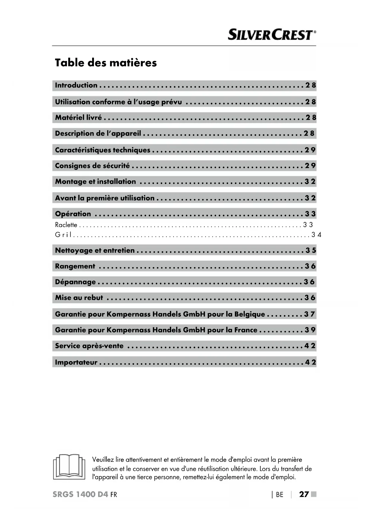 - Importateur Veuillez lire attentivement et entièrement le mode d'emploi avant la première utilisation et le conserver en vue d'une réutilisation ultérieure. Lors du transfert de l'appareil à une tierce personne, remettez-lui également le mode d'emploi.SRGS 1400 D4■ 28 p. 42
