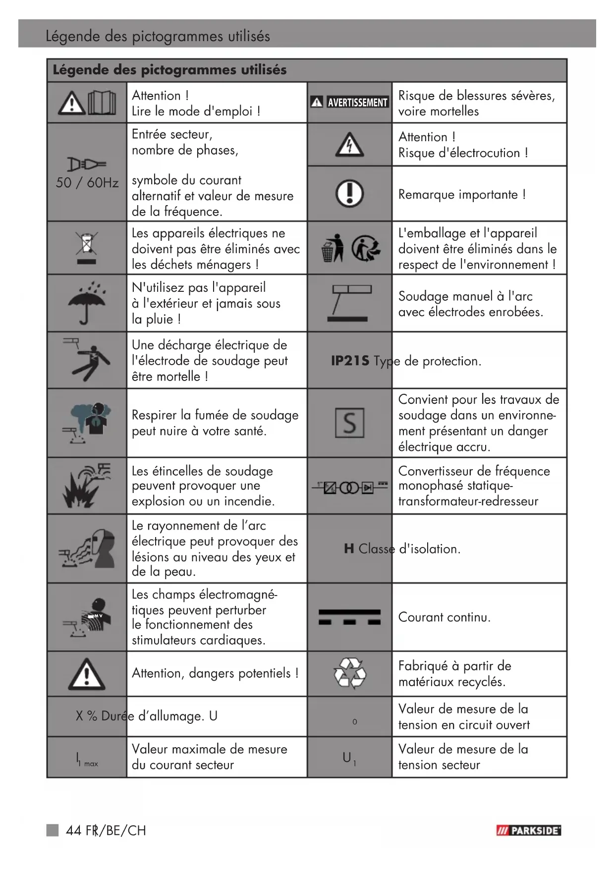 s’éteint. Vous pouvez de nouveau souder. ATTENTION! Veillez à ce que l'électrode ne frotte pas sur la pièce à usiner. Vous risqueriez de l’endommager ou de ne pas déclencher l’arc correctement. Une fois l'arc de soudage allumé, veillez à respecter la distance avec la pièce à usiner. La dis- tance doit correspondre au diamètre de Montage du masque de soudeur / Mise en service57FR/BE/CH l'électrode utilisée. Veillez à garder une distance précise et constante pendant tout le travail de soudage. L’angle entre l'électrode et la distance de travail doit être compris entre 20° et 30°. ATTENTION! Après les travaux de soudage, vous devez poser la pince à souder et l'élec- trode sur le support isolé. Attendez que l'électrode ait refroidi avant d’enlever les scories. Si vous reprenez le soudage sur une soudure interrompue, enlevez d’abord les scories de la soudure. ATTENTION! Une tension inférieure de 10% à la tension nominale d’entrée peut avoir les conséquences suivantes: Le courant diminue sur l’appareil. L’arc est interrompu ou devient instable. ATTENTION! Le rayonnement de l’arc peut provo- quer des inflammations oculaires et des brûlures de la peau. Les scories peuvent provoquer des blessures oculaires et des brûlures. Portez des lunettes de protection ou un masque de protection. Le masque de protection doit être conforme à la norme de sécurité EN175. Utilisez uniquement les câbles de soudage fournis avec l'appareil (10mm