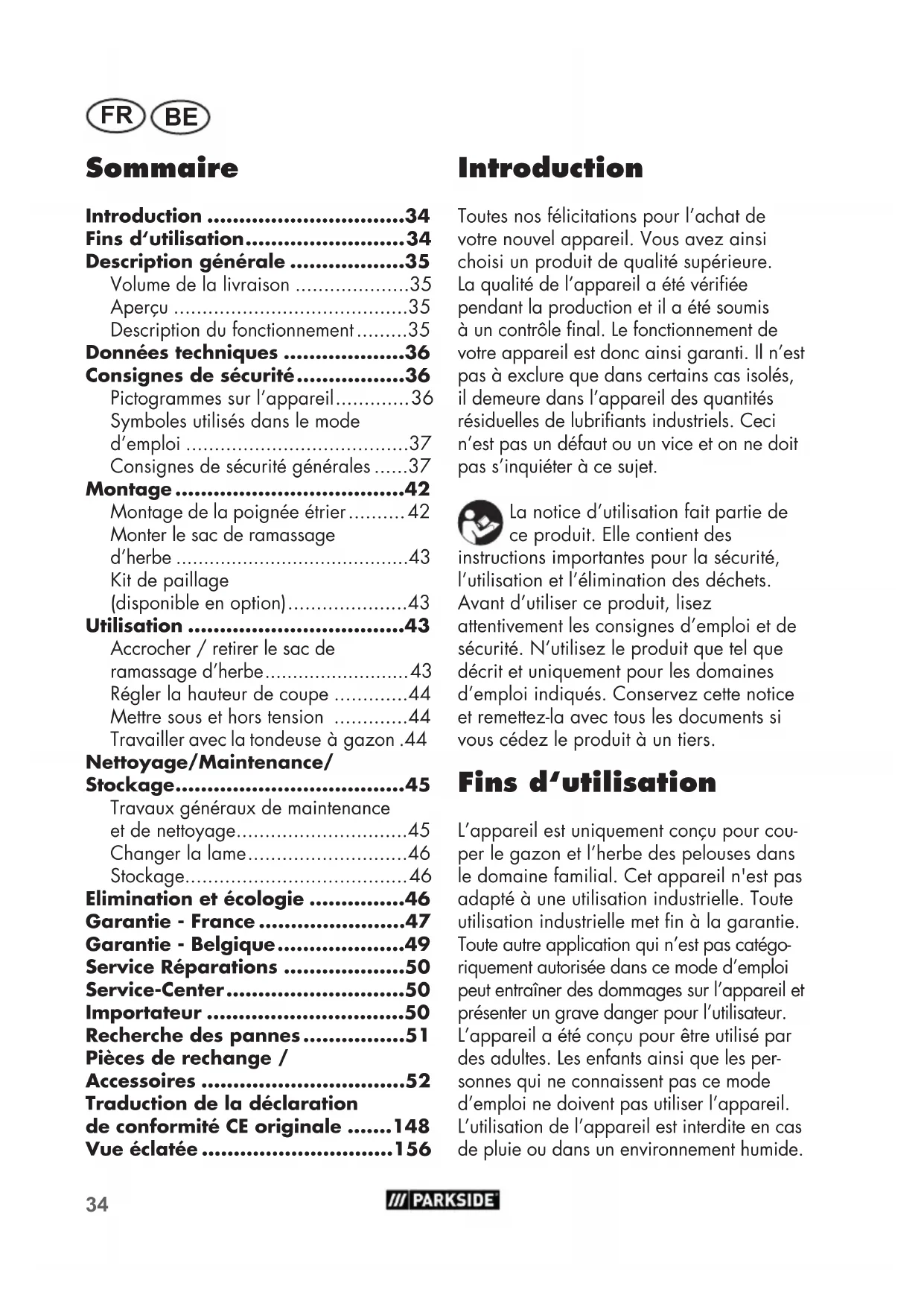- Introduction Toutes nos félicitations pour l’achat de votre nouvel appareil. Vous avez ainsi choisi un produit de qualité supérieure. La qualité de l’appareil a été vériée pendant la production et il a été soumis à un contrôle nal. Le fonctionnement de votre appareil est donc ainsi garanti. Il n’est pas à exclure que dans certains cas isolés, il demeure dans l’appareil des quantités résiduelles de lubriants industriels. Ceci n’est pas un défaut ou un vice et on ne doit pas s’inquiéter à ce sujet. La notice d’utilisation fait partie de ce produit. Elle contient des instructions importantes pour la sécurité, l’utilisation et l’élimination des déchets. Avant d’utiliser ce produit, lisez attentivement les consignes d’emploi et de sécurité. N’utilisez le produit que tel que décrit et uniquement pour les domaines d’emploi indiqués. Conservez cette notice et remettez-la avec tous les documents si vous cédez le produit à un tiers. Fins d‘utilisation L’appareil est uniquement conçu pour cou- per le gazon et l’herbe des pelouses dans le domaine familial. Cet appareil n'est pas adapté à une utilisation industrielle. Toute utilisation industrielle met n à la garantie. Toute autre application qui n’est pas catégo- riquement autorisée dans ce mode d’emploi peut entraîner des dommages sur l’appareil et présenter un grave danger pour l’utilisateur. L’appareil a été conçu pour être utilisé par des adultes. Les enfants ainsi que les per- sonnes qui ne connaissent pas ce mode d’emploi ne doivent pas utiliser l’appareil. L’utilisation de l’appareil est interdite en cas de pluie ou dans un environnement humide. Traduction de la déclaration de conformité CE originale p. 148