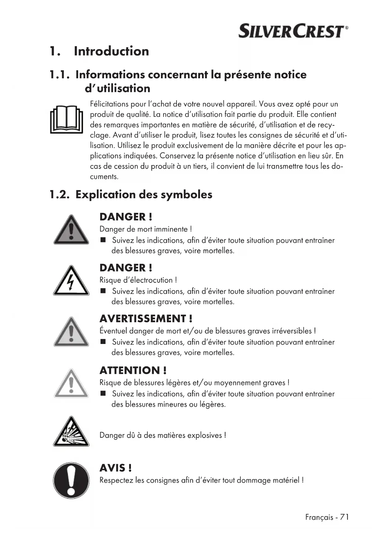 1.1. Informations concernant la présente notice d’utilisation Félicitations pour l’achat de votre nouvel appareil. Vous avez opté pour un produit de qualité. La notice d’utilisation fait partie du produit. Elle contient des remarques importantes en matière de sécurité, d’utilisation et de recy- clage. Avant d’utiliser le produit, lisez toutes les consignes de sécurité et d’uti- lisation. Utilisez le produit exclusivement de la manière décrite et pour les ap- plications indiquées. Conservez la présente notice d’utilisation en lieu sûr. En cas de cession du produit à un tiers, il convient de lui transmettre tous les do- cuments. 1.2. Explication des symboles DANGER! Danger de mort imminente! Suivez les indications, afin d’éviter toute situation pouvant entraîner des blessures graves, voire mortelles. DANGER! Risque d’électrocution! Suivez les indications, afin d’éviter toute situation pouvant entraîner des blessures graves, voire mortelles. AVERTISSEMENT! Éventuel danger de mort et/ou de blessures graves irréversibles! Suivez les indications, afin d’éviter toute situation pouvant entraîner des blessures graves, voire mortelles. ATTENTION! Risque de blessures légères et/ou moyennement graves! Suivez les indications, afin d’éviter toute situation pouvant entraîner des blessures mineures ou légères. Danger dû à des matières explosives! AVIS! Respectez les consignes afin d’éviter tout dommage matériel!72 - Français Informations complémentaires concernant l’utilisation de l’appareil! Respectez les consignes de la notice d‘utilisation!