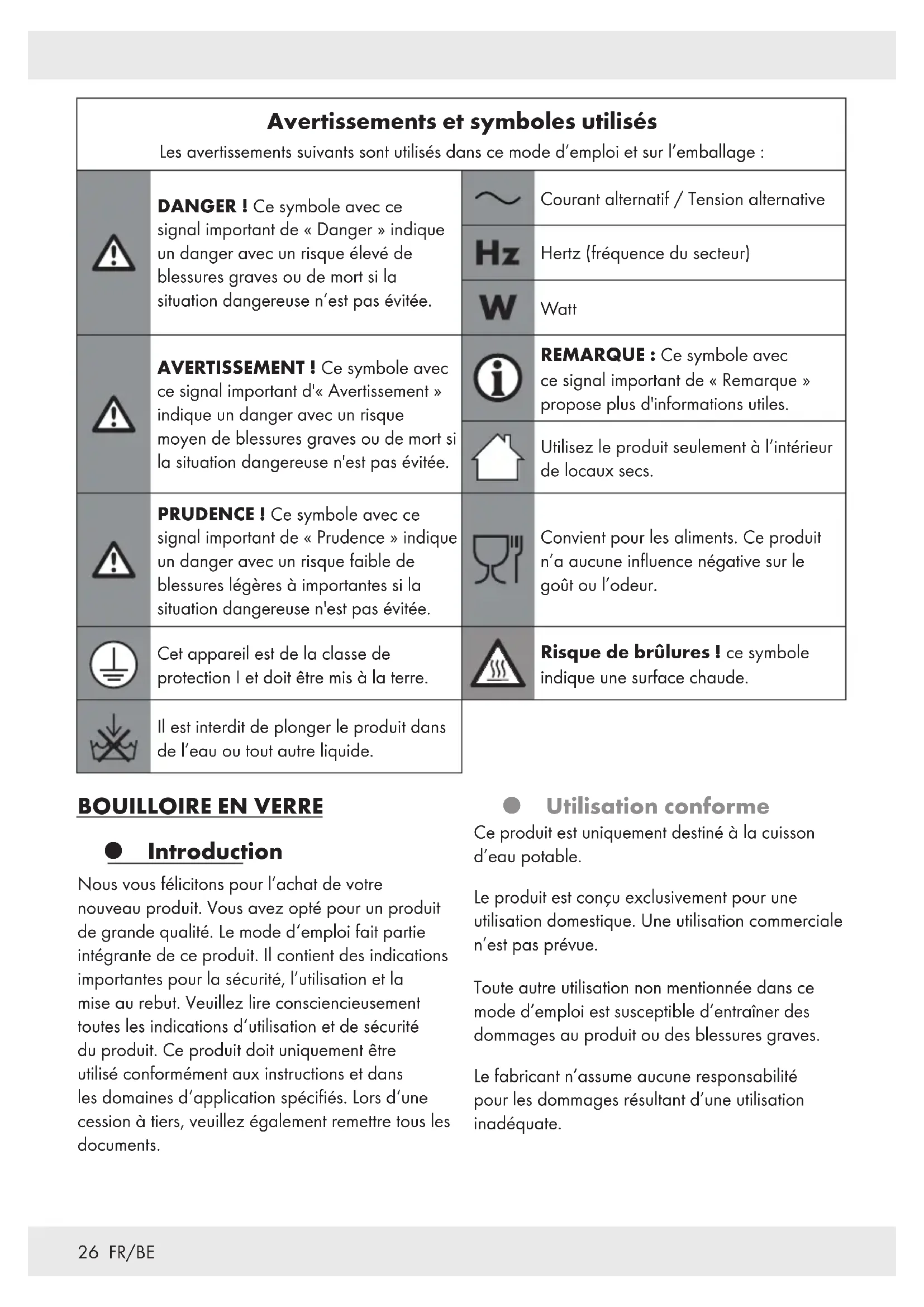 ENFANTS! Ne jamais laisser les enfants sans surveillance avec le matériel d’emballage. Il existe un risque d’étouffement par le matériau d’emballage. Les enfants sous-estiment souvent les dangers. Maintenez toujours les enfants hors de la portée des matériaux d’emballage et du produit. Ce produit peut être utilisé par des enfants de plus de 8 ans s’ils sont surveillés ou s’ils ont reçu des instructions concernant l’utilisation en toute sécurité du produit et ont compris les risques encourus. Ce produit peut être utilisé par des personnes ayant des capacités physiques, sensorielles ou mentales limitées ou ayant une expérience et/ ou des connaissances réduites, uniquement si elles sont surveillées ou si elles ont reçu des instructions concernant l’utilisation en toute sécurité du produit et ont compris les risques encourus. Le nettoyage et l’entretien réalisables par l’utilisateur ne doivent pas être effectués par des enfants, à moins qu’ils aient 8 ans ou plus et qu’ils soient surveillés. Le produit et son cordon d’alimentation doivent être tenus hors de la portée des enfants de moins de 8 ans. Les enfants ne doivent pas jouer avec le produit. mAVERTISSEMENT! Risque de blessures dû à une mauvaise utilisation.29 FR/BE Domaines d’application Ce produit a été conçu pour une utilisation domestique et des applications similaires, comme: –cuisinettes dans des commerces, des bureaux et des environnements de travail similaires; –fermes; –hôtels, motels et autres auberges; –dans des chambres d’hôtes. Sécurité électrique mAVERTISSEMENT! Évitez de renverser de l’eau sur la fiche de secteur ou le socle de contact. mDANGER! Risque d’électrocution! N’essayez pas de réparer le produit par vous-même! En cas de dysfonctionnement, les réparations doivent être effectuées par de la main d’œuvre qualifiée. mAVERTISSEMENT! Risque d’électrocution! Il est interdit de plonger le produit dans de l’eau ou tout autre liquide. Prière de ne pas maintenir le produit sous l’eau courante. mAVERTISSEMENT! Risque d’électrocution! N’utilisez aucun produit endommagé. Débranchez le produit du réseau électrique et adressez- vous à votre commerçant s’il est endommagé. mAVERTISSEMENT! Risque d’électrocution! Ne positionnez pas le produit à côté d’éviers ou dans des endroits humides. Assurez-vous avant le branchement sur l’alimentation électrique que la tension et l’intensité du courant correspondent bien aux indications de l’étiquette signalétique du produit. Ne branchez le produit que sur une prise de courant mise à la terre. Assurez-vous que la fiche de secteur soit correctement branchée. Afin d’éviter tout endommagement du cordon d’alimentation, il est interdit de le coincer, de le plier ou de le faire passer sur des arêtes vives. Maintenez-le aussi à l’écart de surfaces chaudes et de flammes.30 FR/BE Si le câble électrique de ce produit est endommagé, il doit être remplacé soit par le fabricant ou par son service après-vente ou soit par une main d’œuvre qualifiée afin d’éviter tout danger. Lorsque vous débranchez le produit du réseau électrique, tirez sur la fiche de secteur et non pas sur le cordon d’alimentation. Branchez le produit sur une prise de courant facilement accessible, afin que vous puissiez en cas d’urgence le débrancher immédiatement du réseau électrique. Le produit n’est pas prévu pour être utilisé avec une minuterie externe ou un système de télécommande séparé. Il est interdit d’utiliser ou de toucher le produit avec les mains mouillées. Risque d’incendie/de brûlure et de développement de chaleur