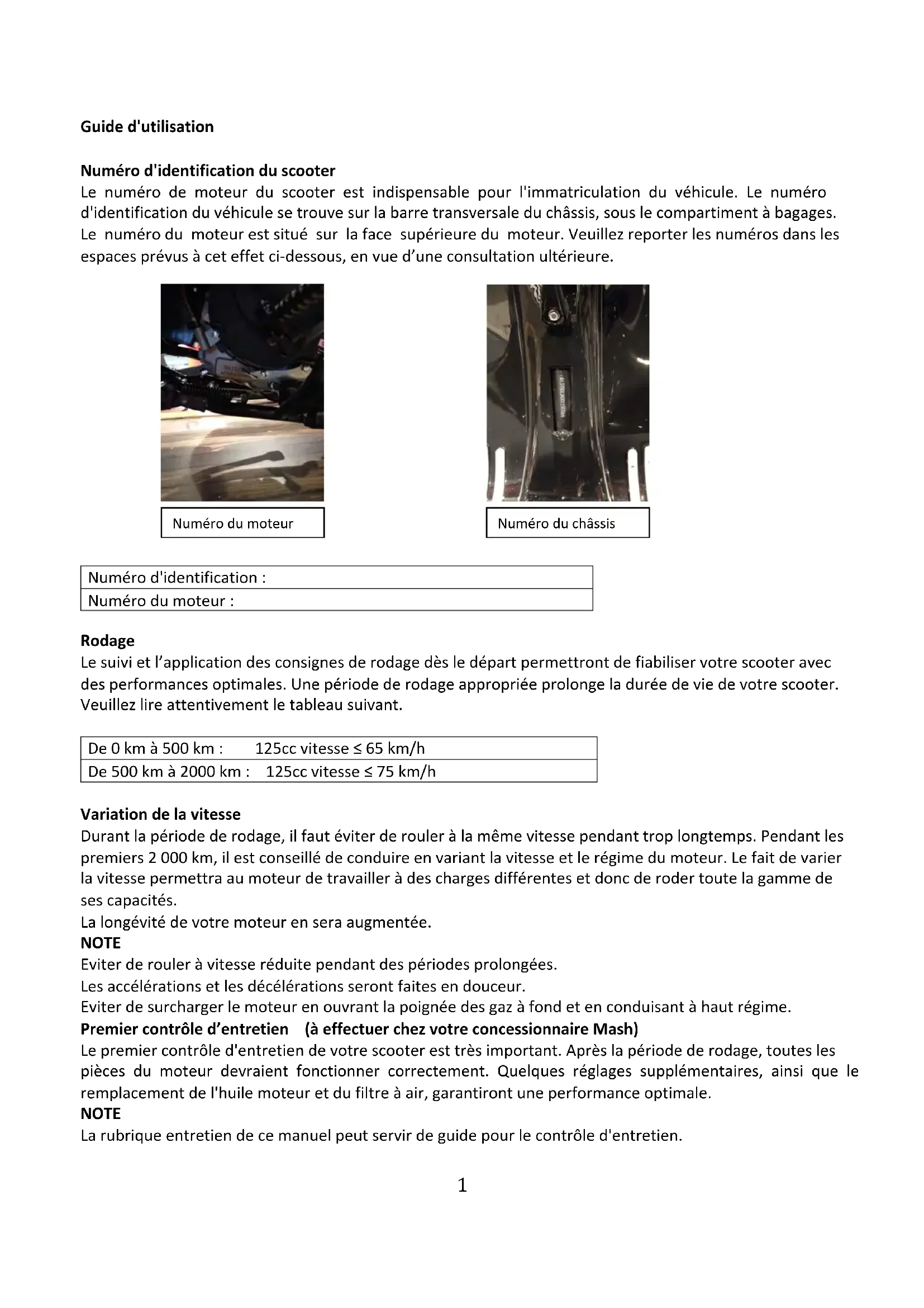 Numéro d'identification : Numéro du moteur : Rodage Le suivi et l’application des consignes de rodage dès le départ permettront de fiabiliser votre scooter avec des performances optimales. Une période de rodage appropriée prolonge la durée de vie de votre scooter. Veuillez lire attentivement le tableau suivant. De 0 km à 500 km : 125cc vitesse ≤ 65 km/h De 500 km à 2000 km : 125cc vitesse ≤ 75 km/h Variation de la vitesse Durant la période de rodage, il faut éviter de rouler à la même vitesse pendant trop longtemps. Pendant les premiers 2 000 km, il est conseillé de conduire en variant la vitesse et le régime du moteur. Le fait de varier la vitesse permettra au moteur de travailler à des charges différentes et donc de roder toute la gamme de ses capacités. La longévité de votre moteur en sera augmentée. NOTE Eviter de rouler à vitesse réduite pendant des périodes prolongées. Les accélérations et les décélérations seront faites en douceur. Eviter de surcharger le moteur en ouvrant la poignée des gaz à fond et en conduisant à haut régime. Premier contrôle d’entretien (à effectuer chez votre concessionnaire Mash) Le premier contrôle d'entretien de votre scooter est très important. Après la période de rodage, toutes les pièces du moteur devraient fonctionner correctement. Quelques réglages supplémentaires, ainsi que le remplacement de l'huile moteur et du filtre à air, garantiront une performance optimale. NOTE La rubrique entretien de ce manuel peut servir de guide pour le contrôle d'entretien. Numéro du moteur