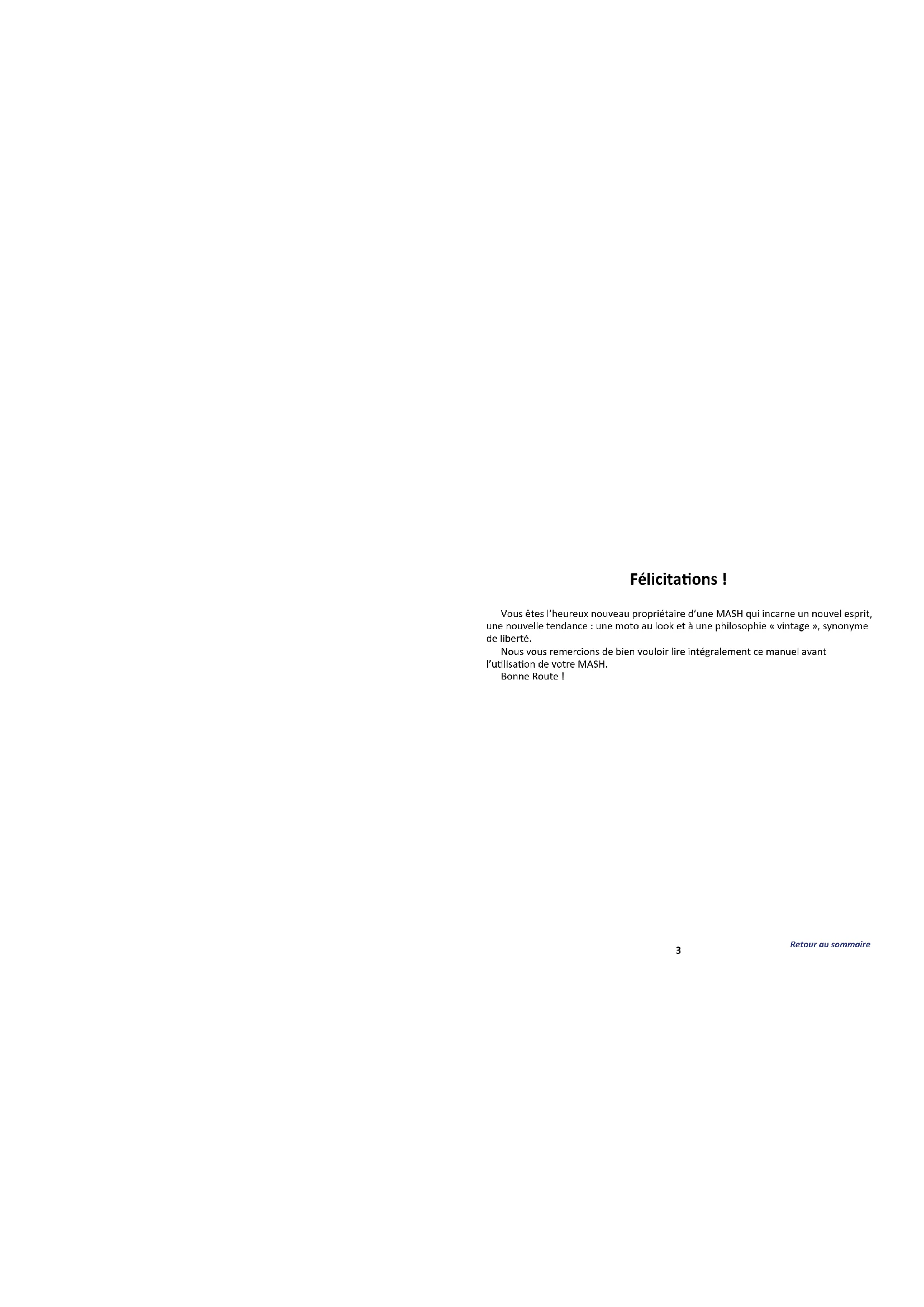 cccc MANUEL D'UTILISATEUR3 Retour au sommaire Félicitaons ! Vous êtes l’heureux nouveau propriétaire d’une MASH qui incarne un nouvel esprit, une nouvelle tendance : une moto au look et à une philosophie « vintage », synonyme de liberté. Nous vous remercions de bien vouloir lire intégralement ce manuel avant l’ulisaon de votre MASH. Bonne Route !4 5 Retour au sommaire Informaons sur le rodage de votre moto Les mille premiers kilomètres constuent une période cruciale pour la vie du véhicule : l’ecacité de son rodage condionne en eet sa longévité et son niveau de performances. Le rodage est le processus par lequel les pièces mobiles se polissent par froement les unes sur les autres et s’ajustent correctement. Son respect favorise non seulement la stabilité du véhicule lors de son ulisaon, mais permet aussi d’exploiter pleinement ses performances. En aucun cas, le propriétaire ne doit agir d’une manière suscepble d’entraîner la surchaue des composants du moteur. Pour en savoir plus sur la méthode de rodage, se reporter à la secon «Rodage de la moto». Lire aenvement le manuel et observer strictement les instrucons et descripons qui y gurent. Une aenon parculière doit être portée aux paragraphes précédés des termes «Averssement», «Aenon» et «Note». Averssement : Se rapporte à votre propre sécurité. Un risque d’accident existe s’il est ignoré. Aenon : Décrit les précauons ou mesures à prendre impéravement pour éviter tout dommage. Note : Fournit des explicaons en maère d’entreen ou des détails plus précis. Le manuel d’ulisateur doit être conservé soigneusement par le propriétaire de la moto. En cas de vente du véhicule, il doit être remis à son nouveau propriétaire. De légères variaons peuvent cependant être constatées entre les modèles composant la gamme. Si le présent manuel menonne des détails diérents du modèle réel, ne pas en tenir compte. Précauons importantes6 7 Retour au sommaire Avant-propos Félicitaons pour votre choix ! Si la conduite d’une moto fait pare des loisirs les plus passionnants. Ce véhicule est aussi un moyen de transport idéal qui saura vous procurer un plaisir de conduite illimité. Avant de rouler, vous êtes invité à vous familiariser avec les consignes et spécicaons du présent manuel d’instrucon, qui décrit en parculier les règles d’ulisaon et d’entreen du véhicule. L’observaon des recommandaons suivantes garanra la abilité de votre moto et prolongera sa durée de vie. Le personnel des revendeurs agréé MASH(liste disponible par consultaon du site internet www.mash-motors.fr) possède les compétences et les qualicaons techniques requises pour réaliser l’entreen et fournir un service de qualité. DISTRIBUTEUR