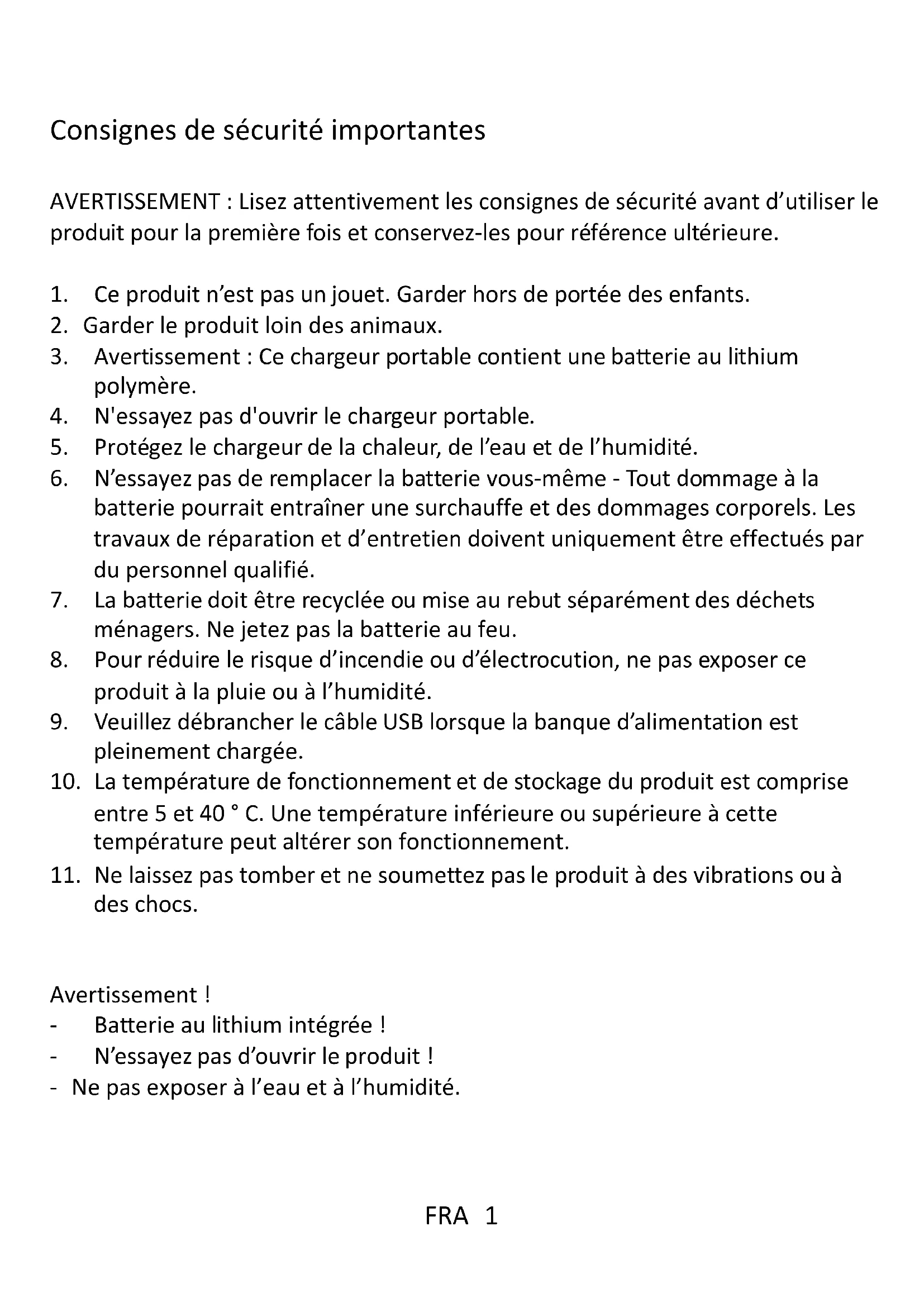 3. Avertissement : Ce chargeur portable contient une batterie au lithium