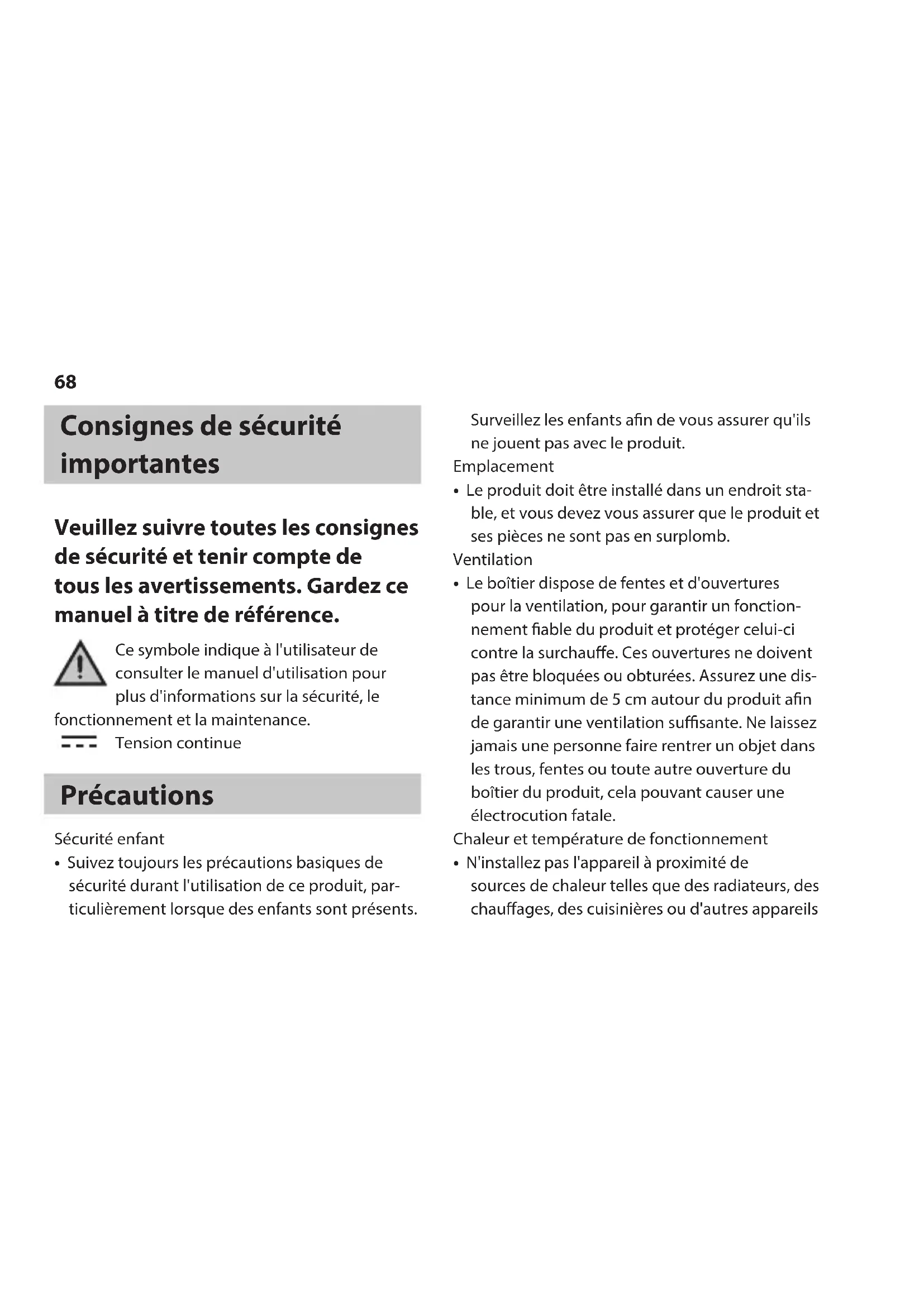 Ce symbole indique à l'utilisateur de consulter le manuel d'utilisation pour plus d'informations sur la sécurité, le fonctionnement et la maintenance. Tension continue Précautions Sécurité enfant