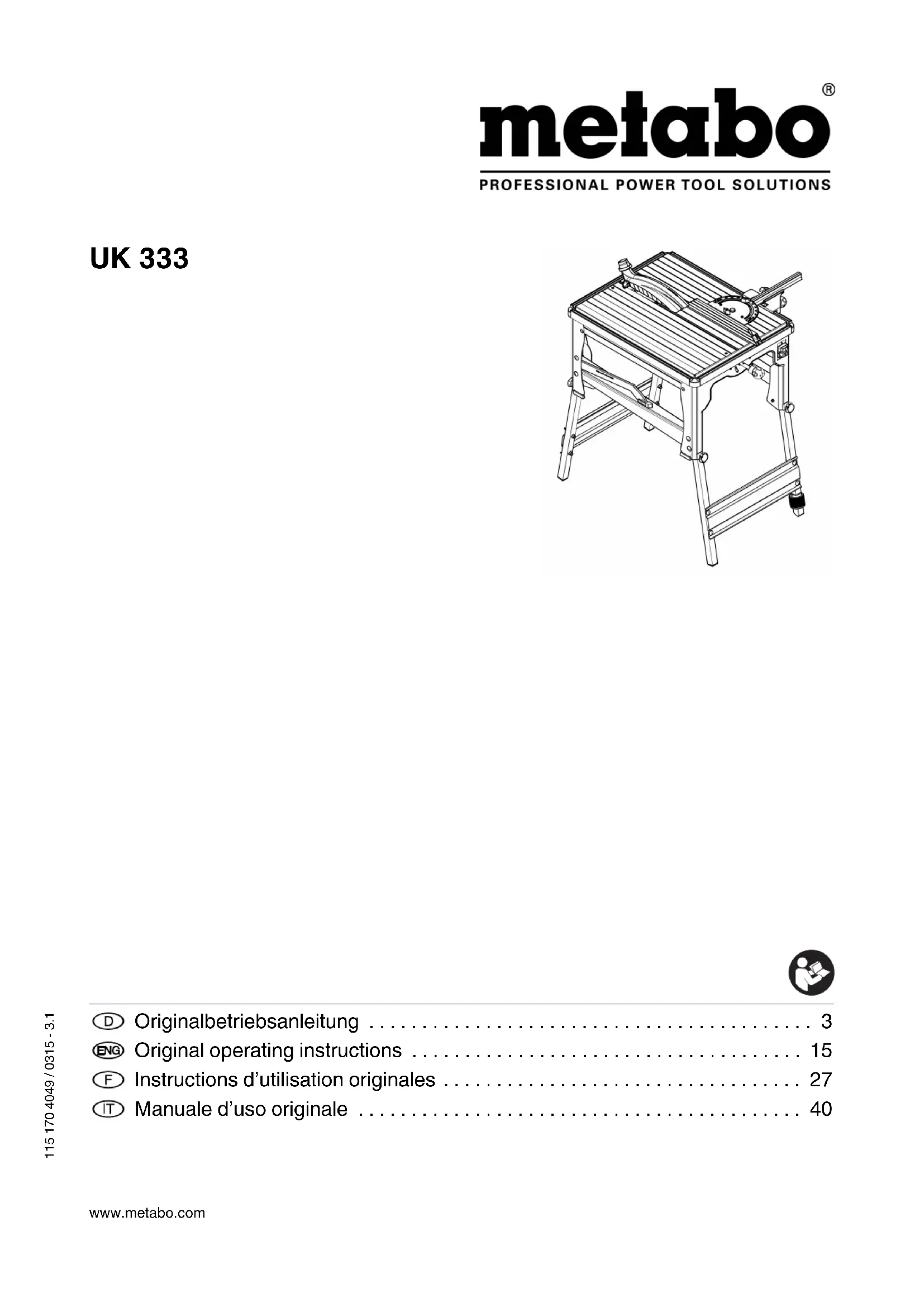 Téléchargez la notice de votre Scie au format PDF gratuitement ! Retrouvez votre notice UK 333 - METABO et reprennez votre appareil électronique en main. Sur cette page sont publiés tous les documents nécessaires à l'utilisation de votre appareil UK 333 de la marque METABO.